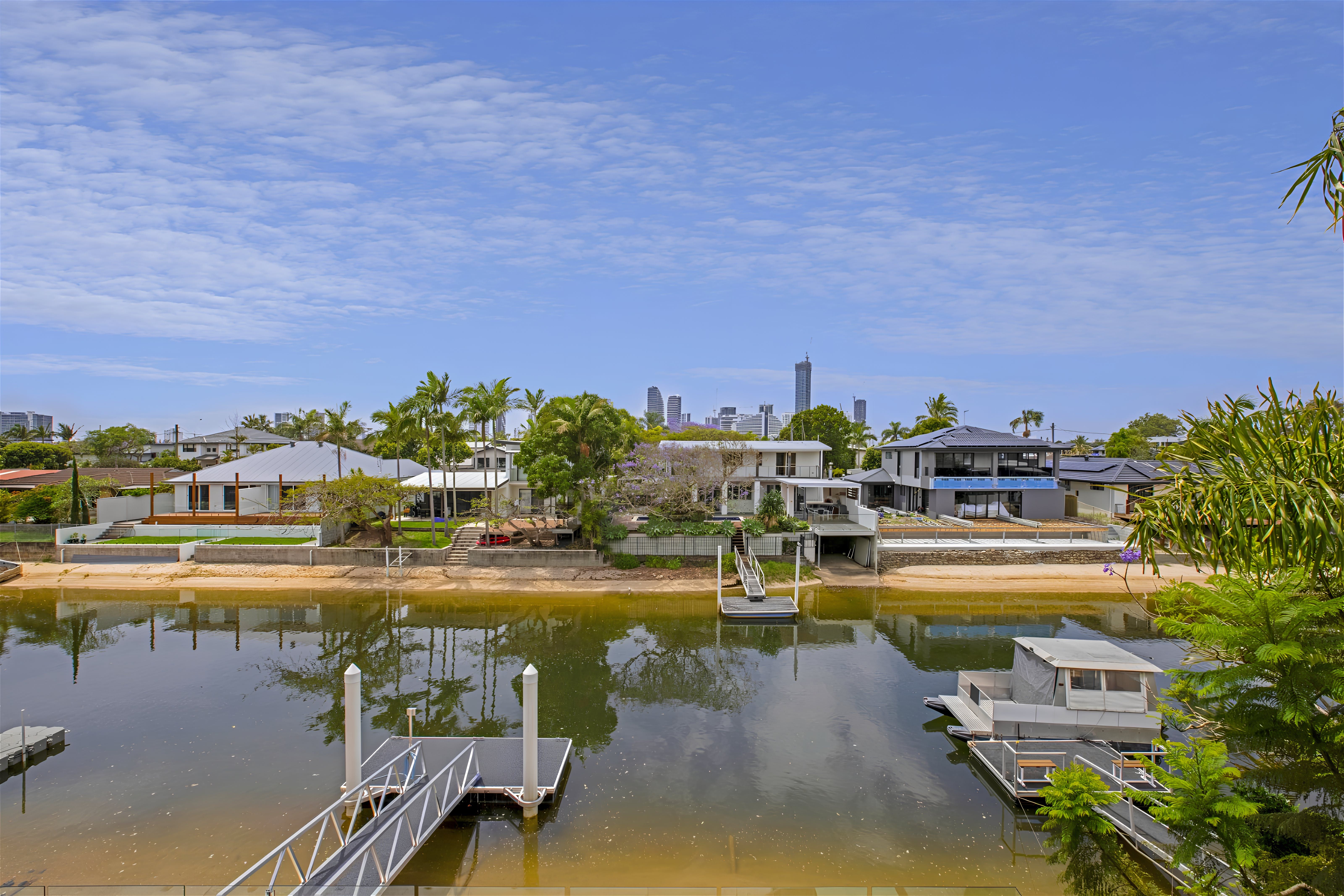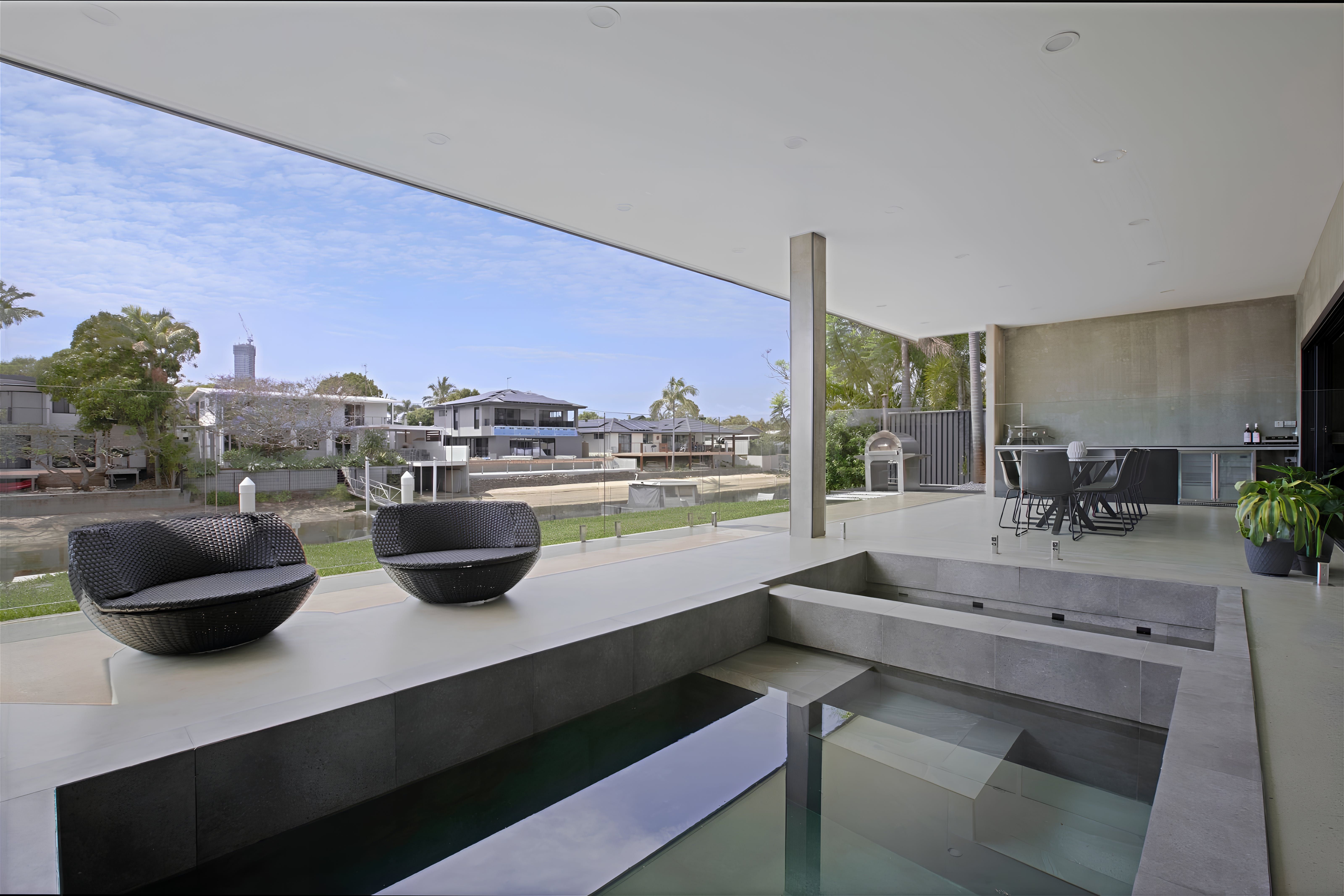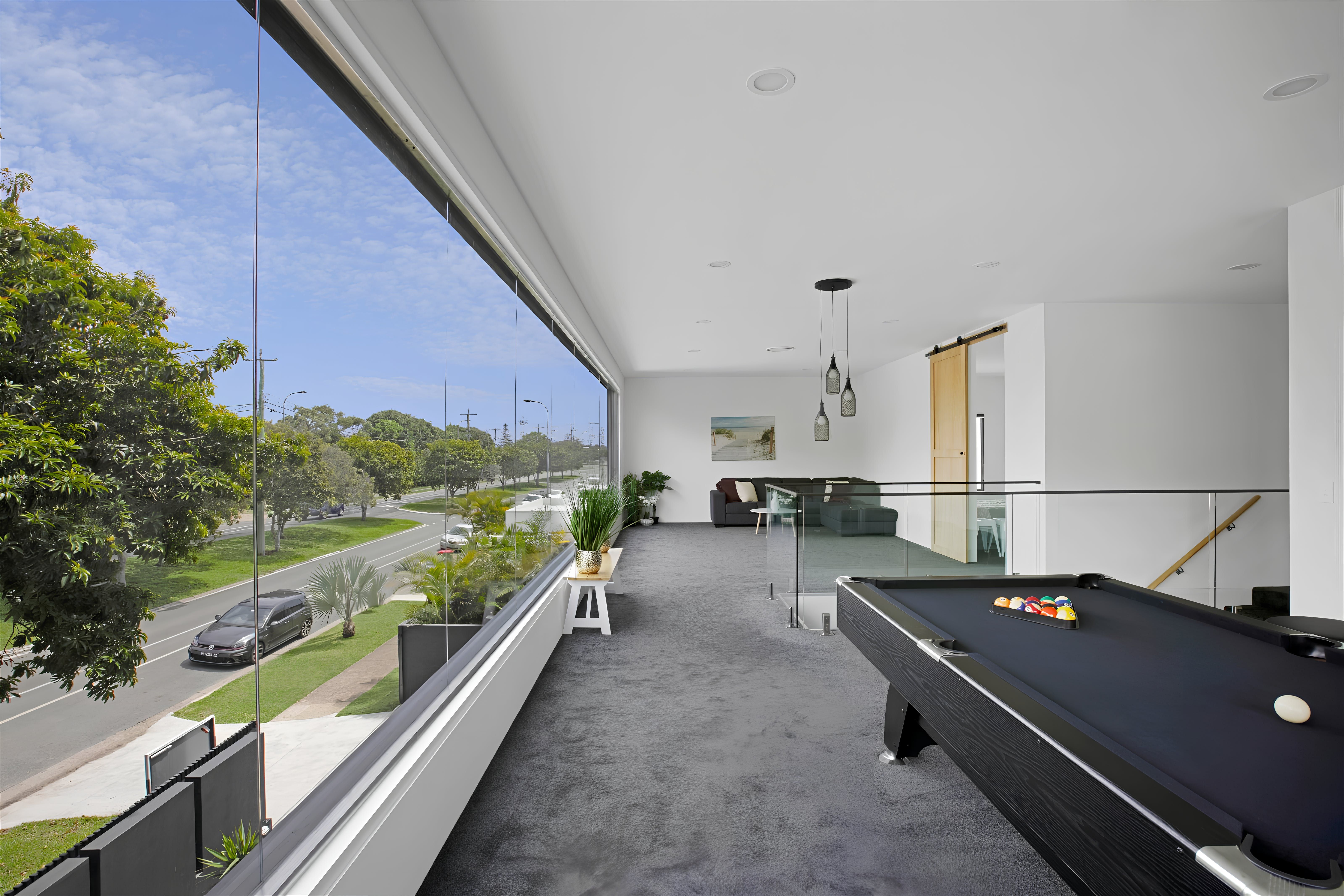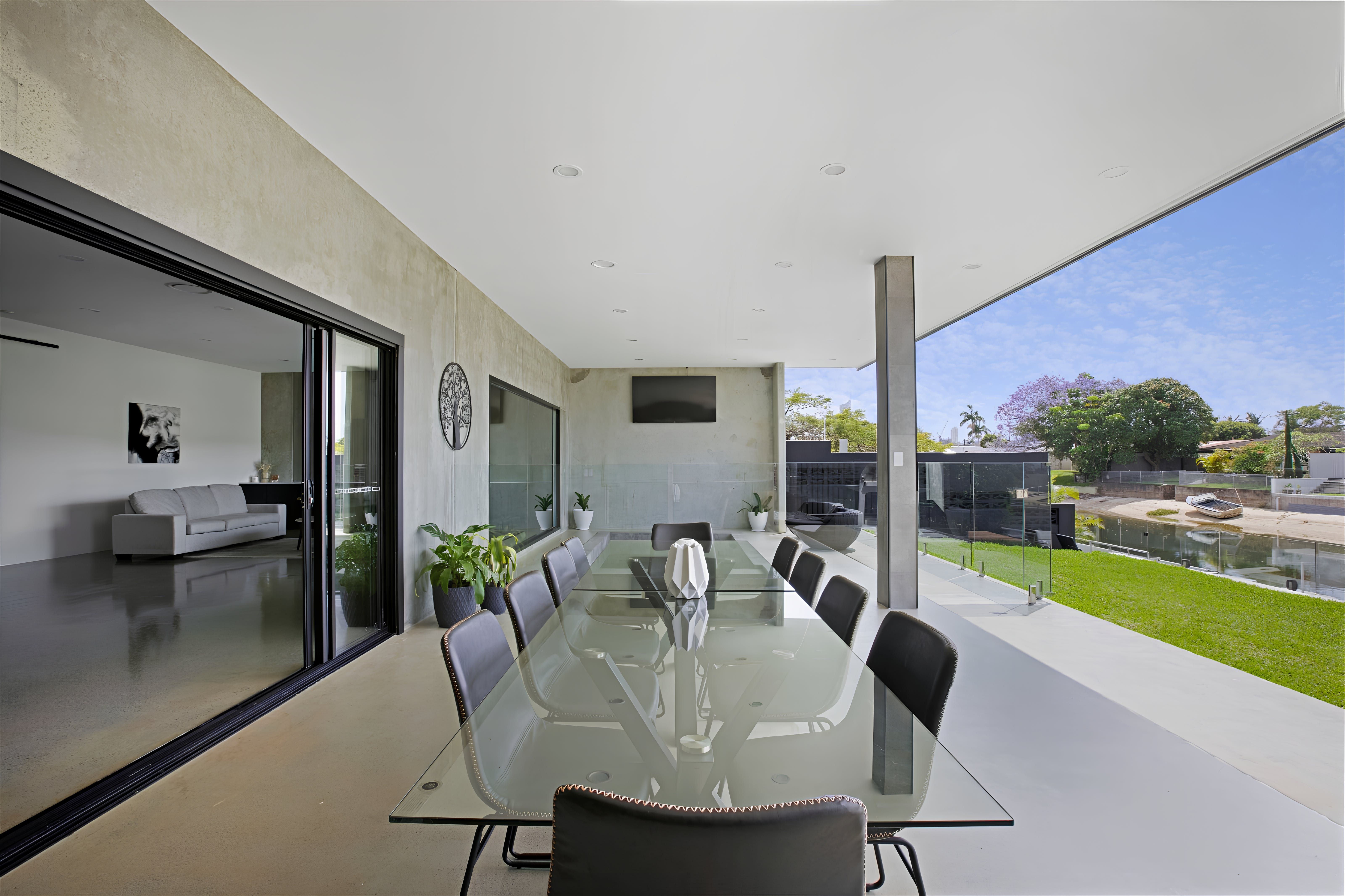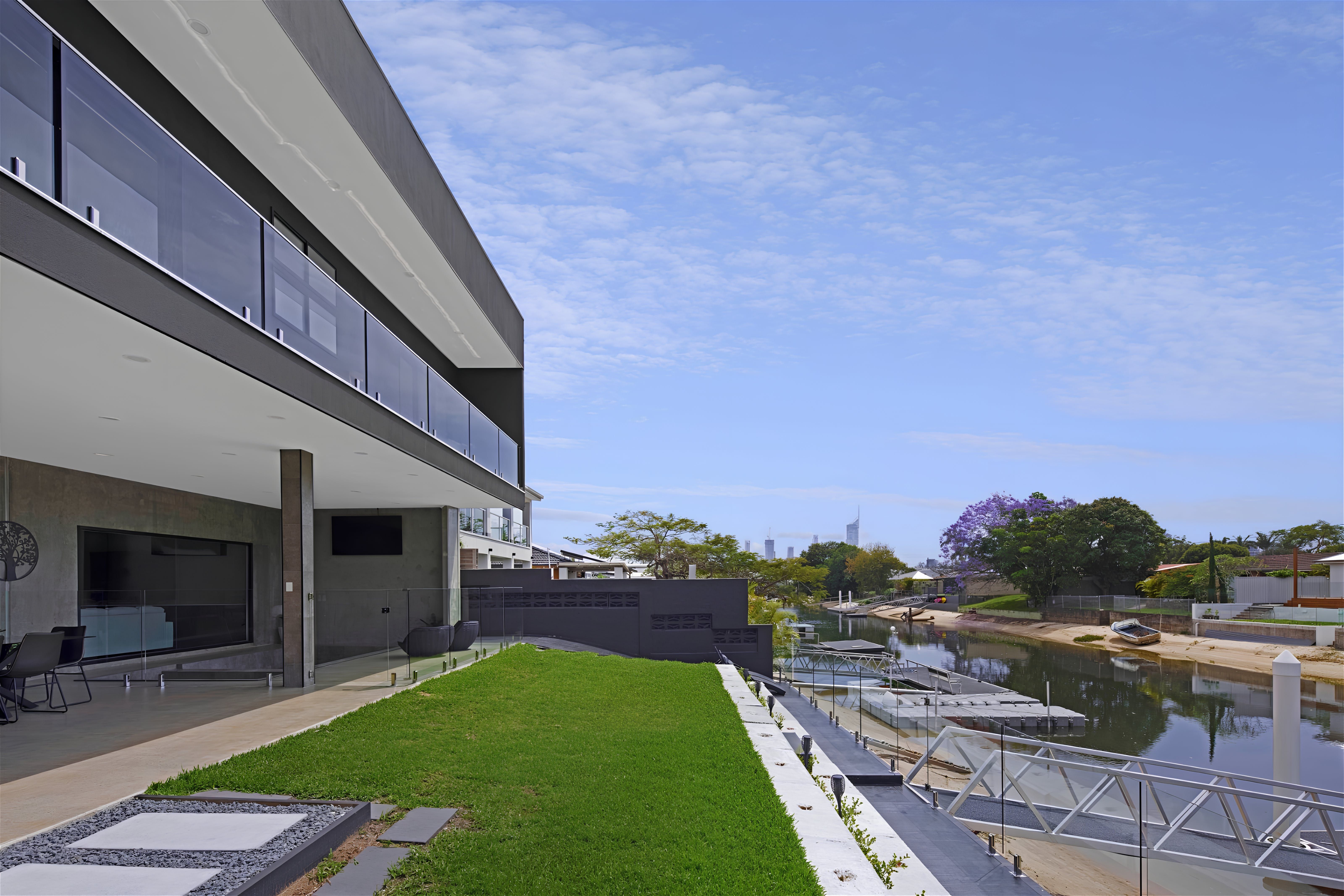 This exquisite new home embraces an industrial design and whispers of charm and tranquility. Situated in the highly sought-after neighbourhood of Broadbeach Waters, guests will enjoy a short stroll to the Casino, Convention Centre, Beach, and numerous dining options. The property boasts 6 bedrooms and 3 bathrooms, with an open plan living space on the ground floor and a captivating entertainment and pool room upstairs. Barn-style doors seamlessly connect distinct areas, while the riverfront views of Nerang River lend a serene touch. Wake up to gentle sunlight filtering through the windows and head downstairs for breakfast overlooking the water. The spacious and tastefully furnished living area opens onto an outdoor space, filling the interior with natural light. Alternatively, unwind in a more intimate setting on the upstairs landing or have friendly billiard games. Guests can conveniently park up to 4 cars within secured parking spaces. With all its modern amenities and chic decor, this property is ideal for family getaways, peaceful retreats with friends, or corporate team building exercises.
