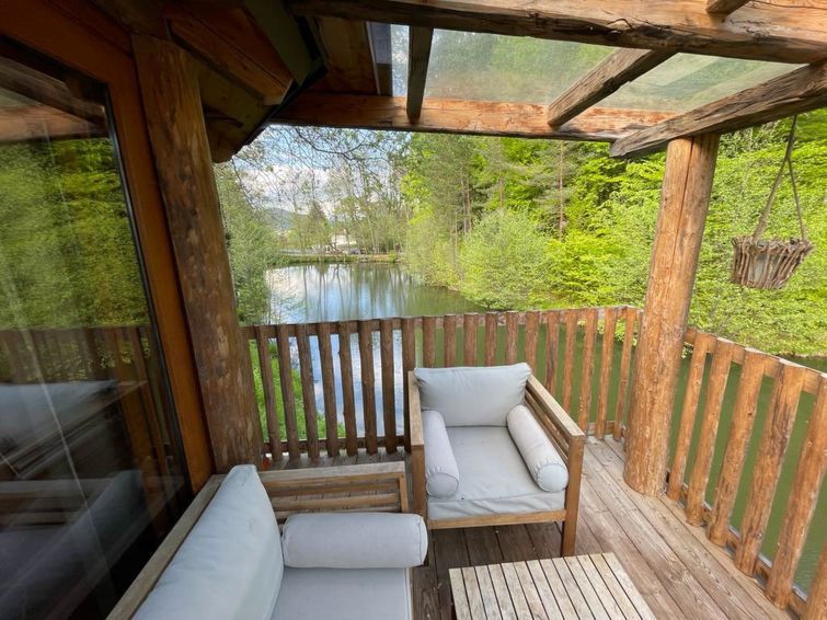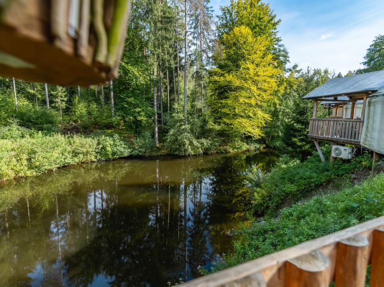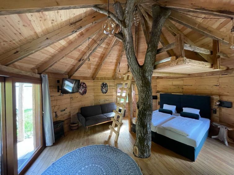 "Treehouse", 1-room bungalow. Cosy furnishings: living/sleeping room with 1 double bed, dining table and satellite TV (flat screen). (kettle, electric coffee machine). Terrace. Terrace furniture. Beautiful view of the river. Facilities: Internet (WiFi, free). Please note: non-smokers only.