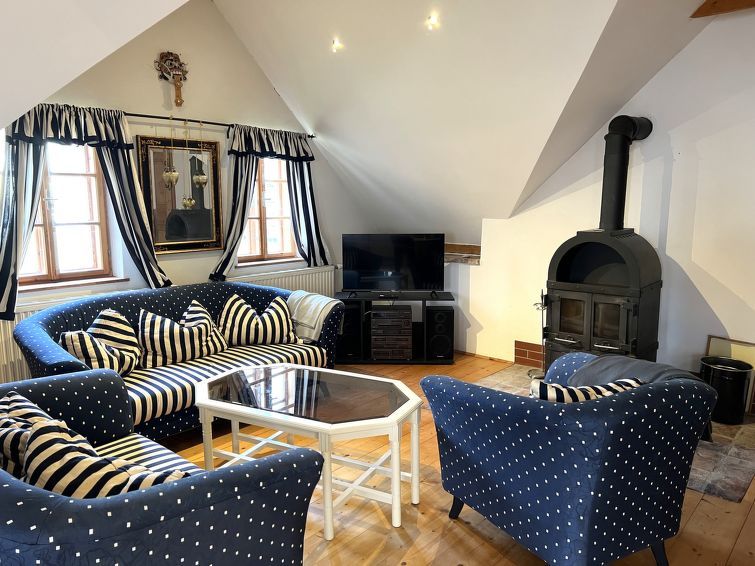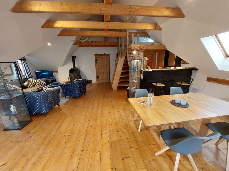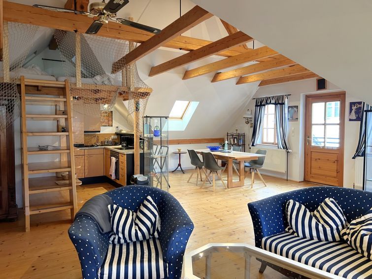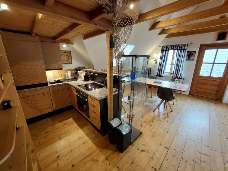 1-room Loft 70 m2, on the upper floor. Object suitable for 2 adults. Rustic and tasteful furnishings: open living/dining room with sloping ceilings with rooflight with 1 x 1 bunk beds (180 cm, length 200 cm). With sloping ceilings, open kitchen (4 hot plates, oven). Bath/WC. Heating.