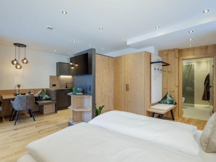 "Mountain Studio Nr 204", 1-room studio 33 m2 on 1st floor. Tasteful and wooden furniture furnishings: living/sleeping room with 1 double sofabed, 1 double bed, dining nook, kitchen corner, satellite TV and international TV channels (flat screen). Exit to the balcony. Open kitchen (oven, dishwasher, 4 ceramic glass hob hotplates, toaster, kettle, microwave, electric coffee machine, Capsules for coffee machine (Nespresso) extra).