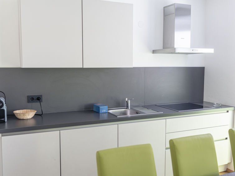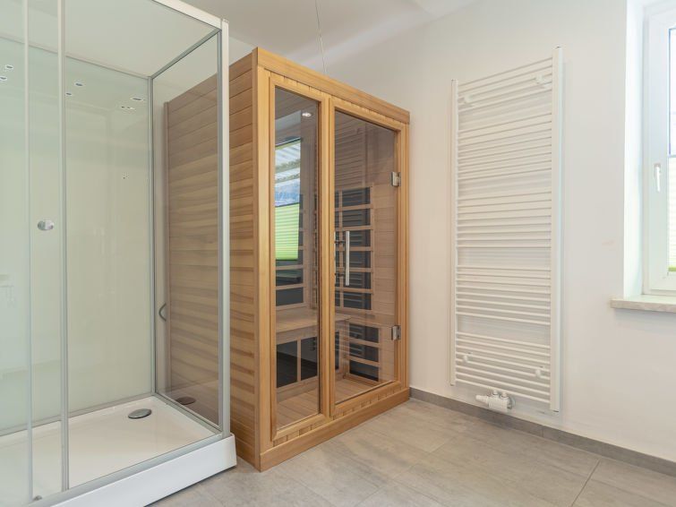 "für bis zu 8 Personen mit IR Sauna", 4-room apartment 87 m2. Bright, modern furnishings: 2 rooms, each room with 1 double bed. 1 room with 1 x 2 bunk beds, 1 double bed. Living/dining room with dining nook, satellite TV and flat screen. Open kitchen (dishwasher, 4 ceramic glass hob hotplates, toaster, kettle, microwave, freezer, electric coffee machine).