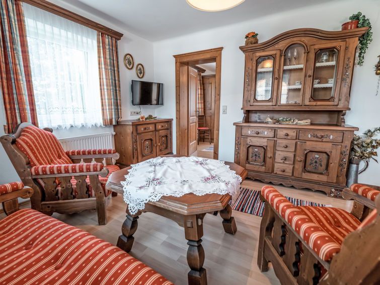 "Gröbming", 2-room apartment 59 m2, on the ground floor. Spacious, cosy furnishings: living/dining room with dining nook, satellite TV and international TV channels (flat screen). 1 double bedroom. Open kitchen (oven, dishwasher, 4 ceramic glass hob hotplates, toaster, kettle, microwave, electric coffee machine).