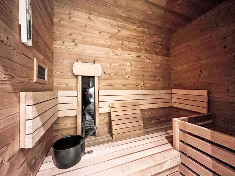 "Appartement für 8 Personen mit Sauna", 4-room apartment 90 m2 on 3 levels. Bright, modern furnishings: living/sleeping room with 1 double sofabed, dining table, satellite TV and international TV channels (flat screen). Exit to the terrace. Kitchenette (oven, dishwasher, 4 ceramic glass hob hotplates, electric coffee machine).