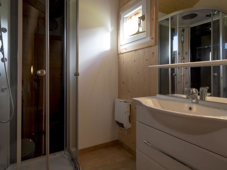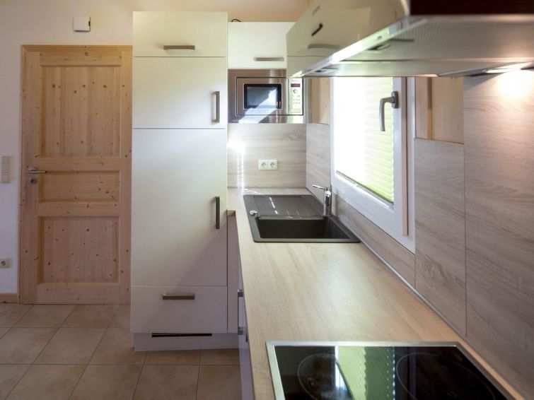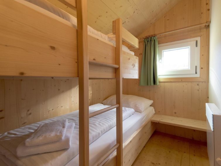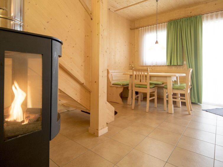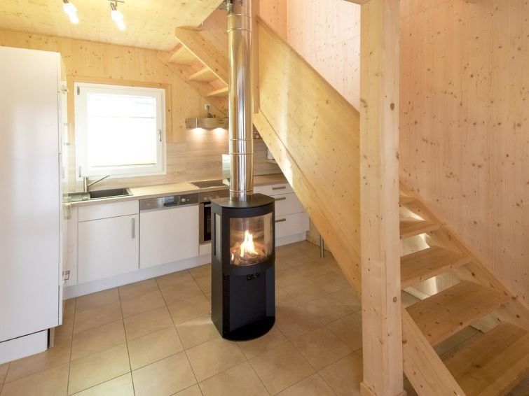 "Stolz 2a", 4-room chalet 70 m2. Spacious, modern and tasteful furnishings: living/dining room with Scandinavian wood stove, dining table and satellite TV (flat screen). 2 double bedrooms. 1 room with 1 x 2 bunk beds. Open kitchen (oven, dishwasher, 4 ceramic glass hob hotplates, microwave, electric coffee machine).