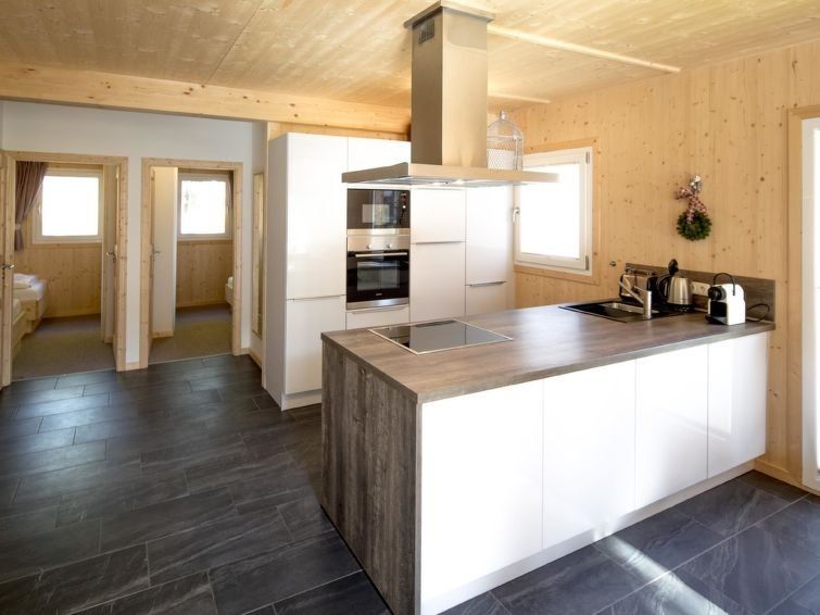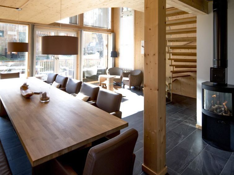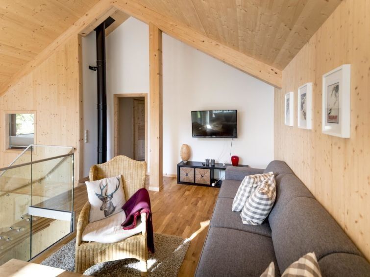 "Premium mit 5 SZ, Sauna oder IR-Sauna", 5-room chalet 140 m2 on 2 levels. Bright, comfortable and wooden furniture furnishings: large living/dining room with dining table and satellite TV (flat screen). 4 double bedrooms. 1 double bedroom with 1 x 2 bunk beds. Gallery with panoramic window.