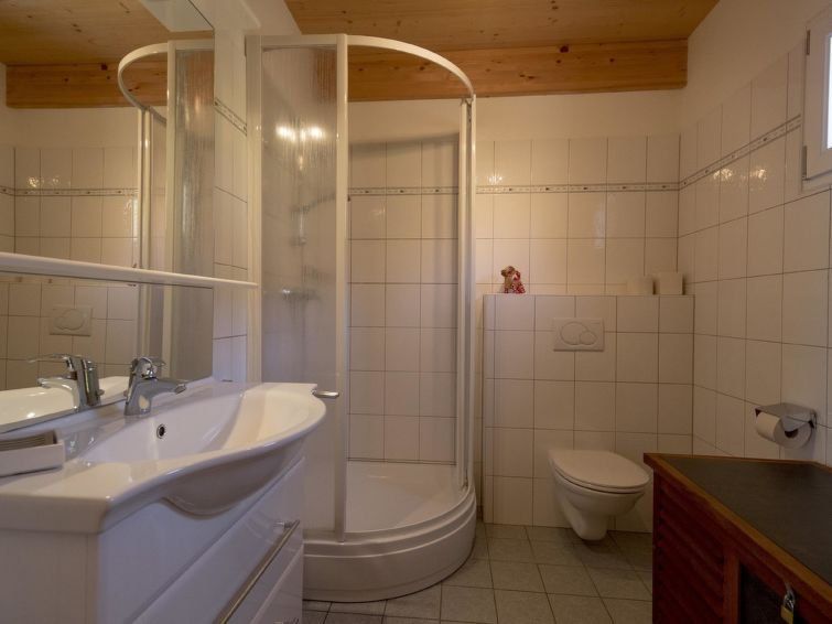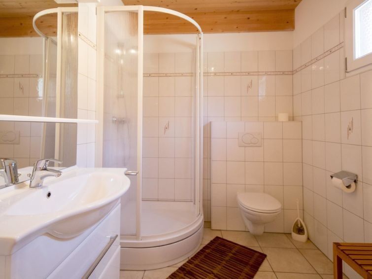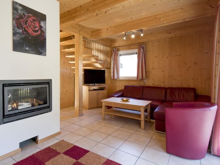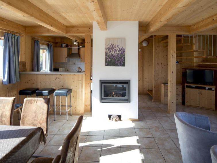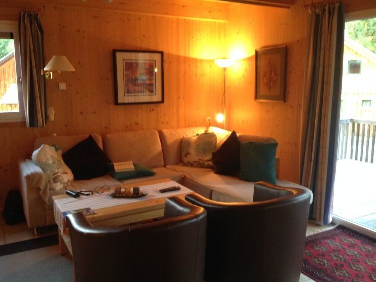 " 160 mit 3 Schlafzimmern für 8 Personen", 4-room chalet 100 m2. Bright, partly with sloping ceilings, wooden furniture furnishings: living/dining room with dining table and satellite TV (flat screen). Exit to the terrace. 1 double bedroom. 1 room with 2 beds. 1 room with 1 x 2 bunk beds.