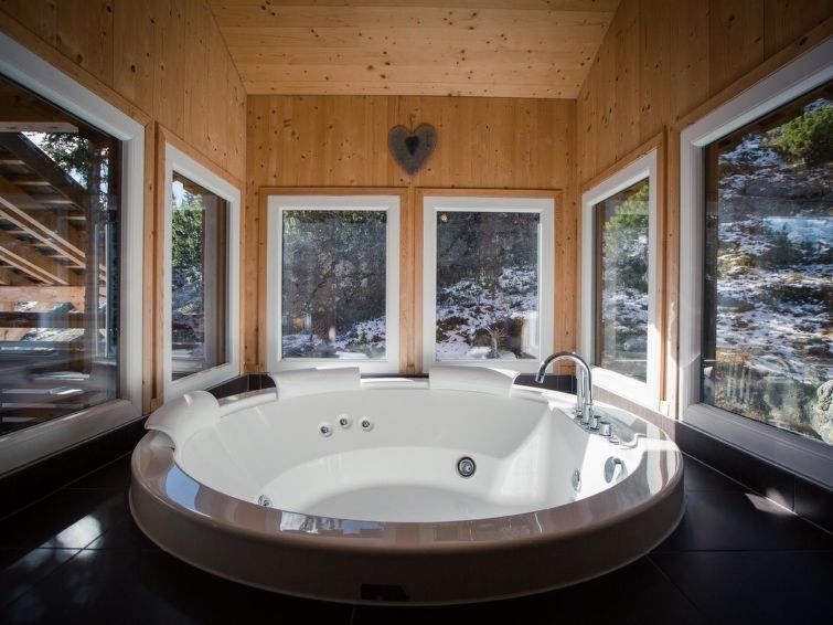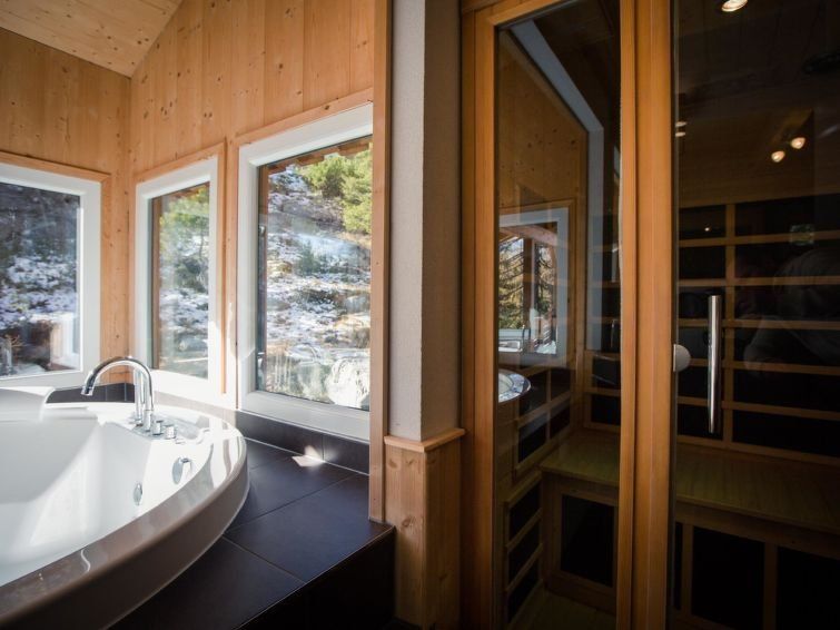 " 1 mit IR-Sauna&Sprudelbad innen", 5-room chalet 120 m2. Luxurious and tasteful furnishings: open living/dining room with dining nook, satellite TV and flat screen. Open kitchen (oven, dishwasher, 4 ceramic glass hob hotplates, microwave, freezer, electric coffee machine). 2 showers/WC.