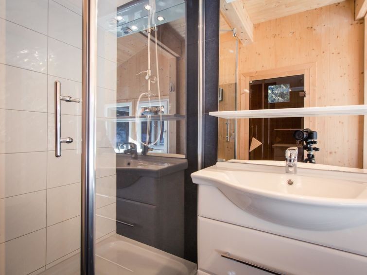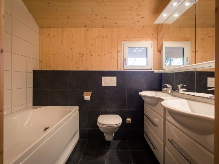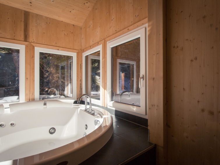" 25 mit Sauna und Sprudelbad innen", 5-room chalet 120 m2 on 2 levels. Luxurious and tasteful furnishings: living/dining room with dining nook and satellite TV (flat screen). Open kitchen (oven, dishwasher, 4 ceramic glass hob hotplates, toaster, kettle, microwave, electric coffee machine).