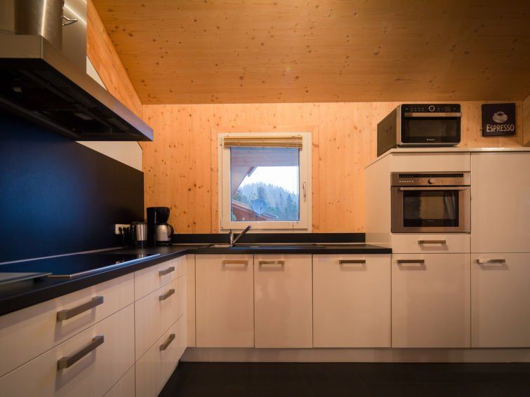 " 34 mit IR-Sauna und Sprudelbad innen", 6-room chalet 130 m2 on 2 levels. Luxurious and tasteful furnishings: living/dining room with dining nook and satellite TV (flat screen). Open kitchen (oven, dishwasher, 4 ceramic glass hob hotplates, toaster, kettle, microwave, electric coffee machine).