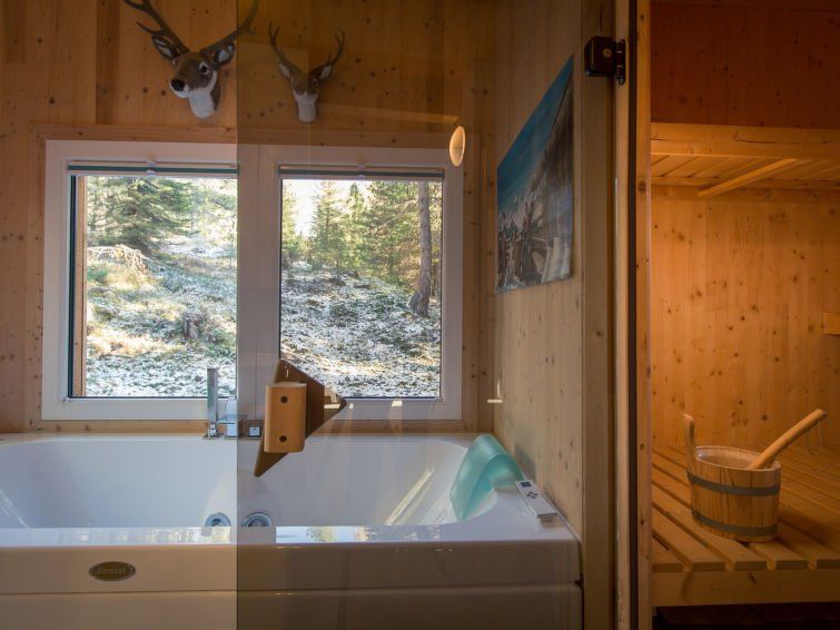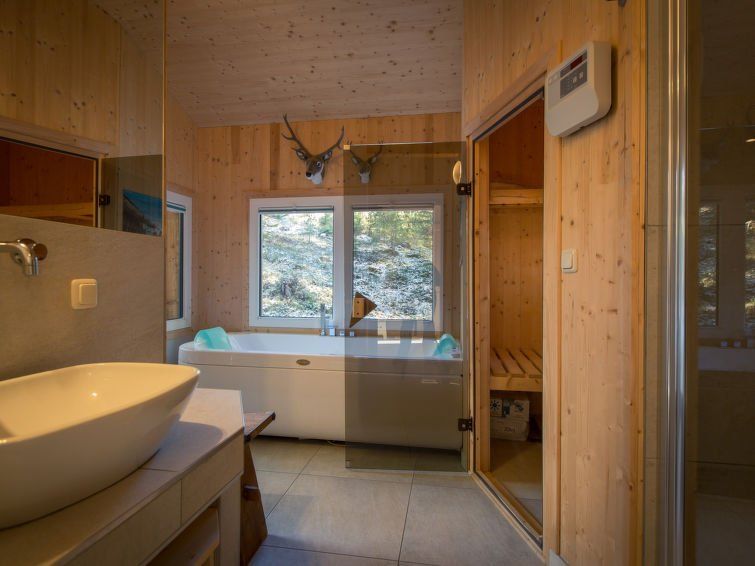 " 42 mit Sauna und Sprudelbad innen", 6-room chalet 120 m2 on 2 levels. Luxurious and tasteful furnishings: living/dining room with dining nook and satellite TV (flat screen). Open kitchen (oven, dishwasher, 4 ceramic glass hob hotplates, toaster, kettle, microwave, electric coffee machine).