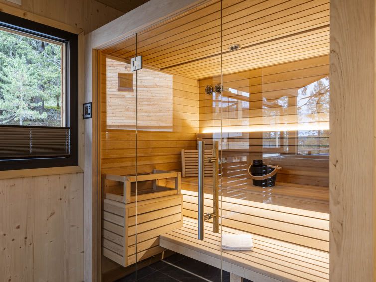 "Superior 12 Sauna & Hot Tub", 5-room chalet 135 m2 on 2 levels. Modern and tasteful furnishings: living room with dining table and satellite TV (flat screen). 3 double bedrooms, each room with shower/WC. 1 double bedroom. Open kitchen (oven, dishwasher, 4 ceramic glass hob hotplates, toaster, kettle, microwave, electric coffee machine).