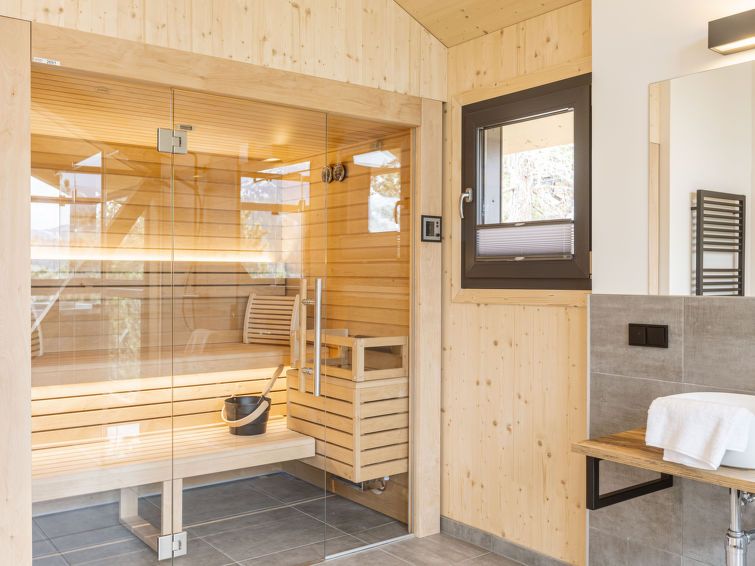 "Superior 17 mit Sauna & Hot Tub", 5-room chalet 135 m2 on 3 levels. Modern and tasteful furnishings: living room with dining table and satellite TV (flat screen). 2 double bedrooms, each room with shower/WC. 2 double bedrooms. Open kitchen (oven, dishwasher, 4 ceramic glass hob hotplates, toaster, kettle, microwave, electric coffee machine).