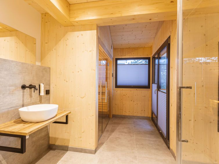 "Superior 25 mit Sauna", 5-room chalet 135 m2 on 3 levels. Modern and tasteful furnishings: living room with dining table and satellite TV (flat screen). 3 double bedrooms, each room with shower/WC. 1 double bedroom. Open kitchen (oven, dishwasher, 4 ceramic glass hob hotplates, toaster, kettle, microwave, electric coffee machine).