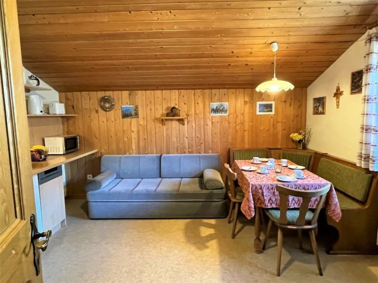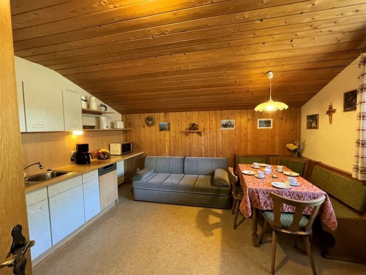 Nice apartment in a great location to the slopes. You could ski almost directly from the apartment. Nice, large shower room, newly renovated. Fully equipped kitchen with electric stove, oven, microwave, refrigerator with freezer compartment, dishwasher and all important small appliances. Beds were comfortable too. Only the couch was a bit small.