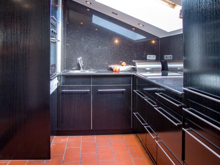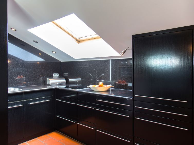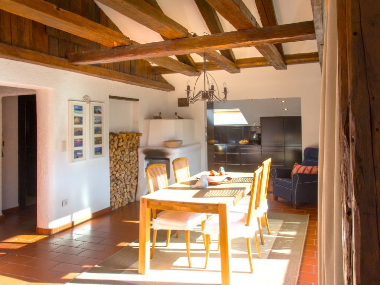 "Adlernest", 3-room penthouse 100 m2 on 2nd floor. Rustic and wooden furniture furnishings: entrance hall. 1 large double bedroom. Exit to the terrace, east facing position and south facing position. 1 room with 2 beds. Large kitchen-/living room (4 ceramic glass hob hotplates, toaster, kettle, electric coffee machine) with 1 double sofabed, dining table and tiled stove.