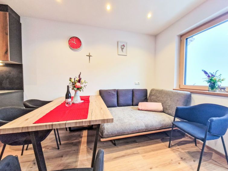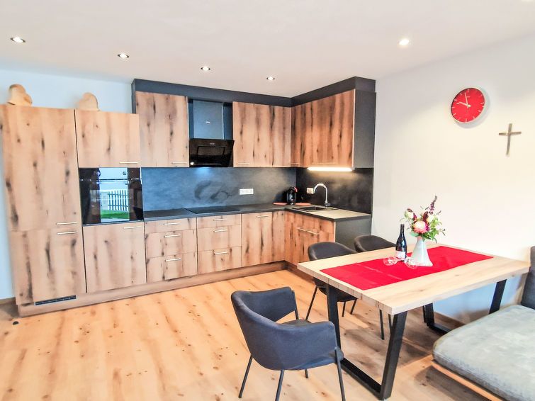 "2 Zimmer", 2-room apartment 65 m2 on 2 levels, on the ground floor. Modern and cosy furnishings: living room with dining nook and TV (flat screen). 1 room with 2 beds and 1 double bed. Open kitchen (oven, dishwasher, 4 ceramic glass hob hotplates, toaster, kettle, electric coffee machine).