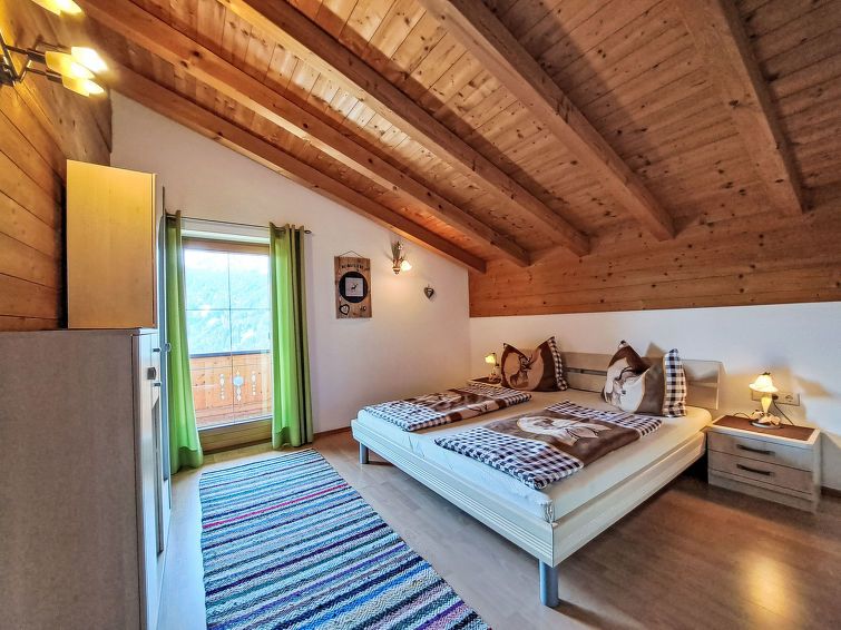 "Reichegger", 3-room house. Living/dining room with dining nook, satellite TV and radio. Exit to the balcony, to the terrace. Open kitchen (oven, dishwasher, 4 ceramic glass hob hotplates, toaster, kettle, microwave, freezer, electric coffee machine). Sep. WC. Underfloor heating. Upper floor: 1 room with 1 bed and 1 double bed.