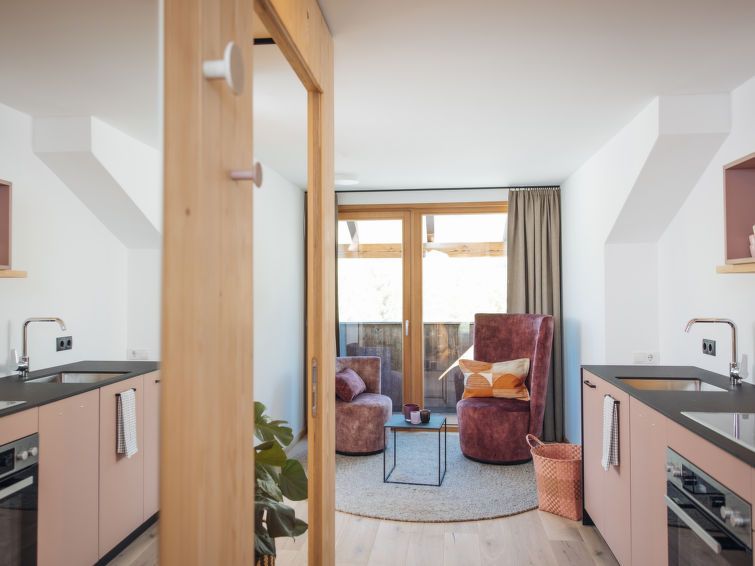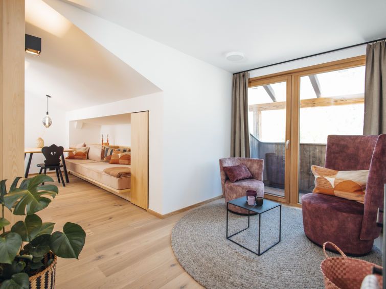 "Greta", 2-room apartment 48 m2. Partly with sloping ceilings, very modern and cosy furnishings: 1 double bedroom with 1 double sofabed. Kitchen-/living room (2 hot plates, oven, dishwasher, electric coffee machine) with dining table and cable TV. Exit to the balcony. Shower, sep.