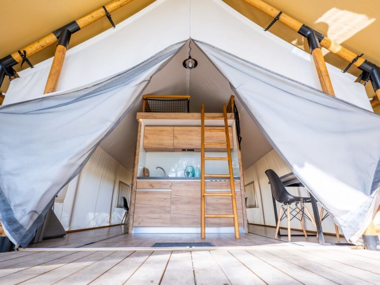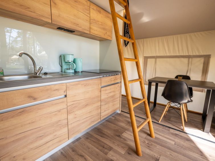 "Papendaal lodge 6 Glampingtent", 1-room mobile home on 2 levels. Practical furnishings: dining room. Exit to the terrace. Alcove with 1 x 2 bunk beds, 1 double bed. Kitchenette (Gas stove, 4 gas rings, kettle, electric coffee machine) with dining table. Shower/WC. Heating, electric heating, air-conditioning, forced-air heating.