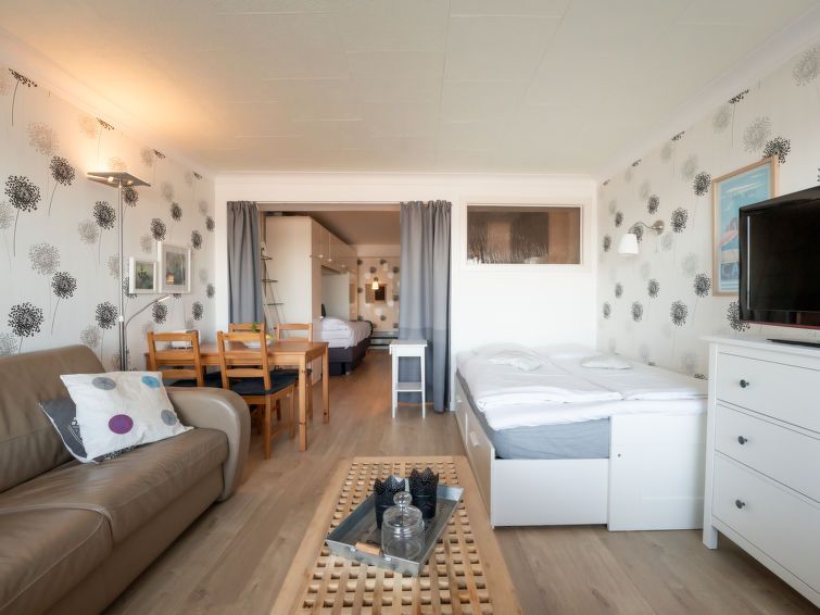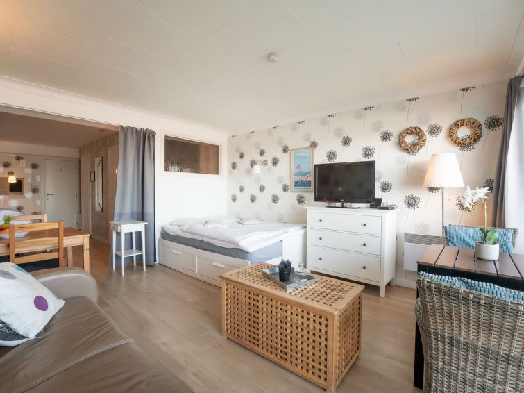 "Capri with sea view", 1-room studio 45 m2 on 3rd floor. Bright, comfortable and cosy furnishings: living/sleeping room with 1 double bed (140 cm, length 200 cm), TV, digital TV and international TV channels. Exit to the terrace. Small kitchen (4 ceramic glass hob hotplates, kettle, freezer, electric coffee machine, combination microwave).