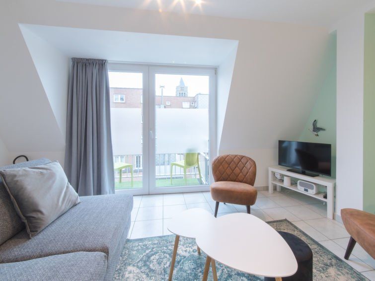 "Ter Duinen", 3-room penthouse 55 m2, on the top floor, south-east facing position. Comfortable and modern furnishings: open small living/dining room with dining table, digital TV, international TV channels and electric heating. Exit to the balcony. Kitchenette (dishwasher, 4 ceramic glass hob hotplates, toaster, kettle, electric coffee machine, combination microwave).
