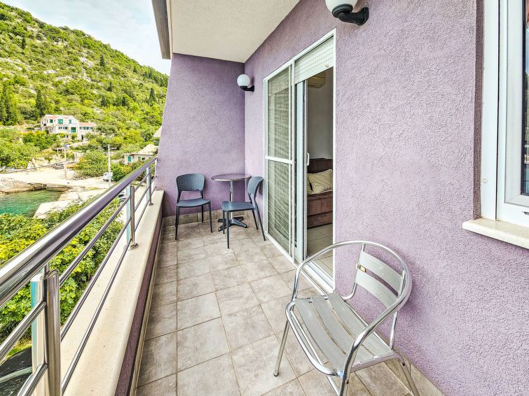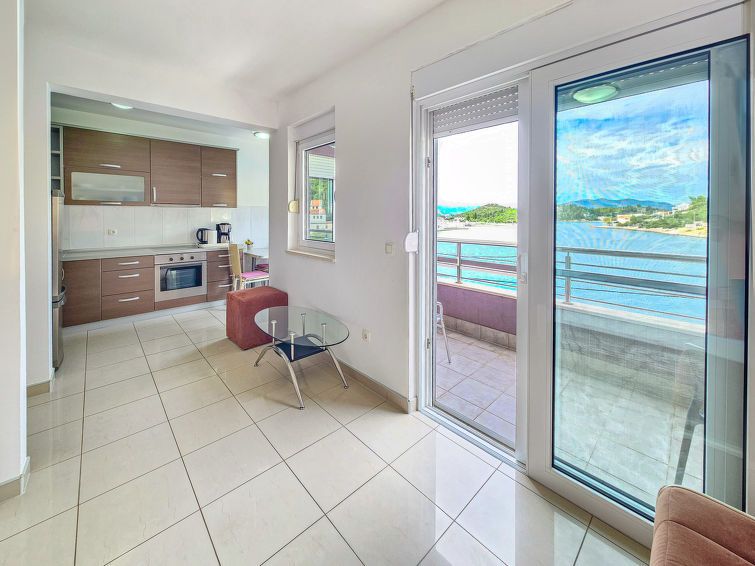 1-room studio 28 m2 on 2nd floor. Living/sleeping room with 1 sofabed (120 cm, length 200 cm), 1 french bed (160 cm, length 200 cm), air conditioning. Exit to the balcony. Open kitchen (oven, 4 ceramic glass hob hotplates, kettle, microwave, freezer, electric coffee machine) with dining table.