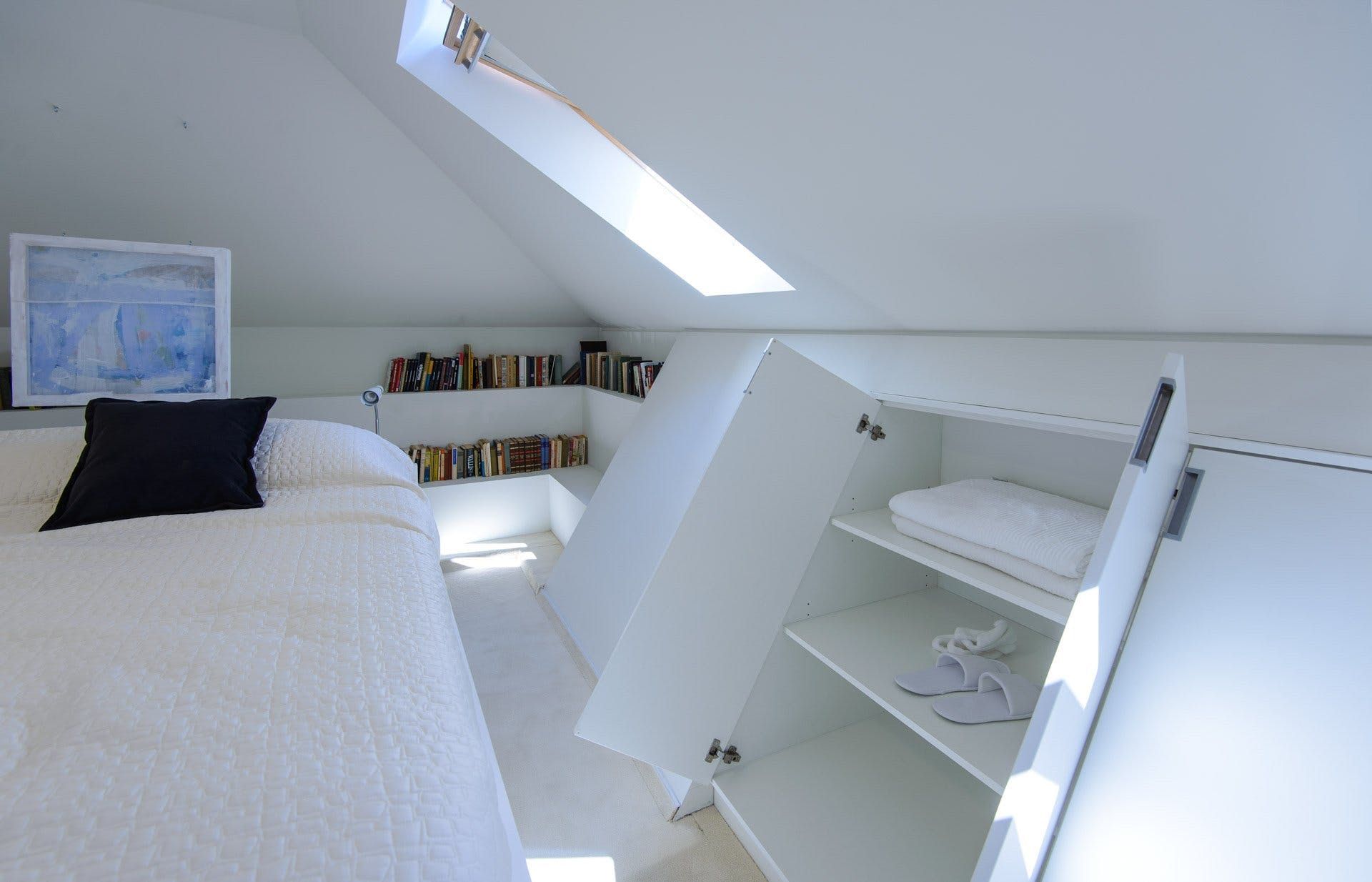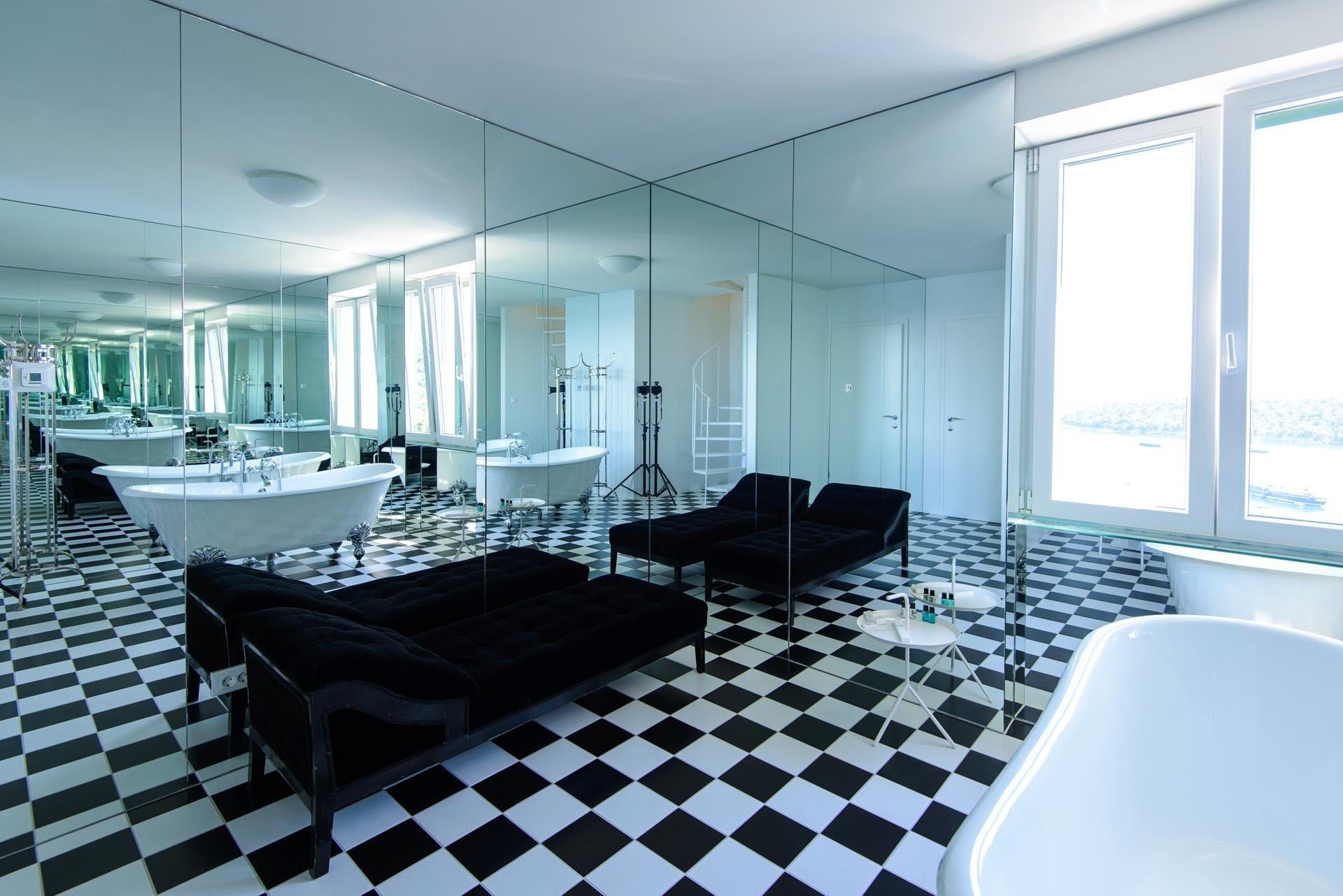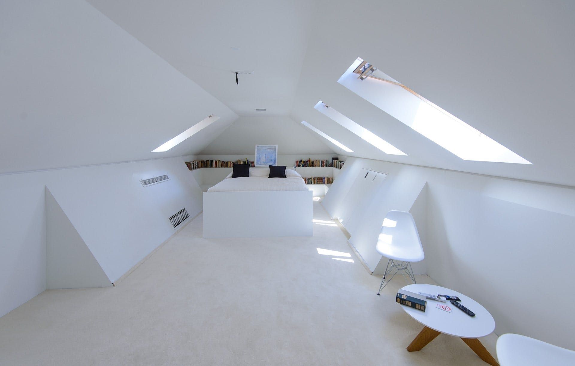 We love the interior, where the light fitting above the dining table looks like an installation in a modern art gallery, and the armchairs could feature in a mid-century museum. Vibrant pictures adorn the walls throughout and the paint-splattered walls of the second living room feel like a work of art in itself. Painting isn’t the only pursuit celebrated in this home – the chrome kitchen could be the canvas for a professional chef and there’s a piano for the maestro of the group in the turret lounge. Bedrooms are sanctuaries, some with access to private balconies, but our favourite has to be the room at the top of the house with its selection of literature for a quiet read.