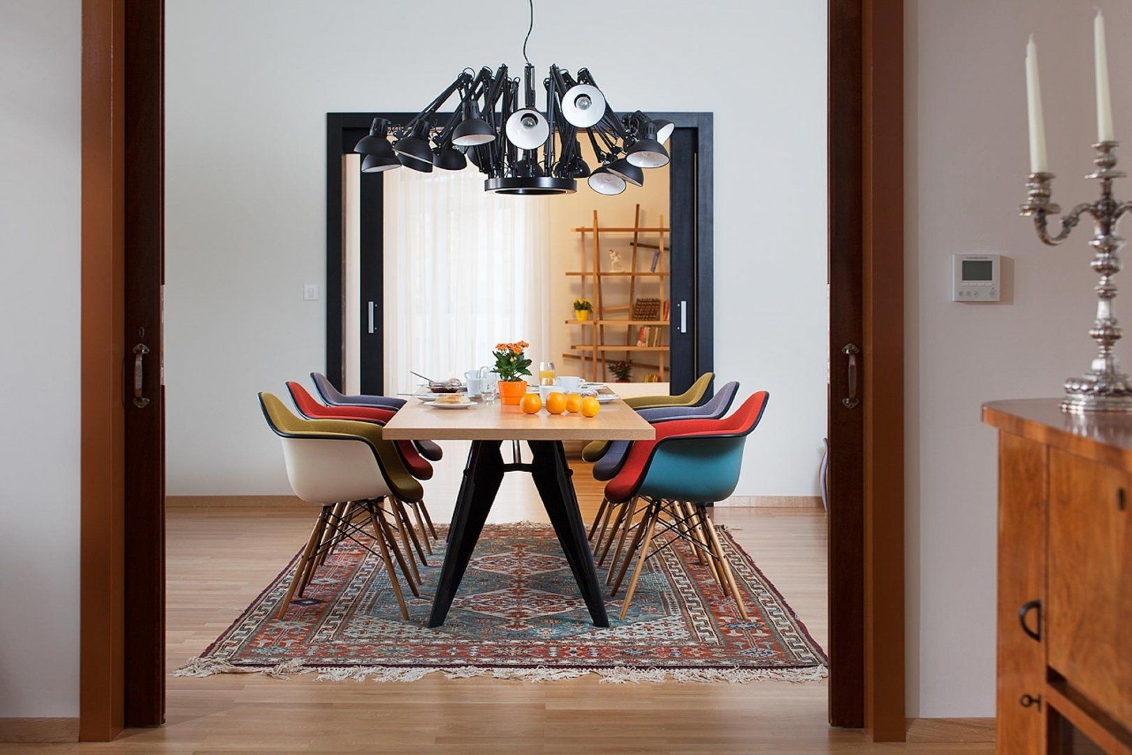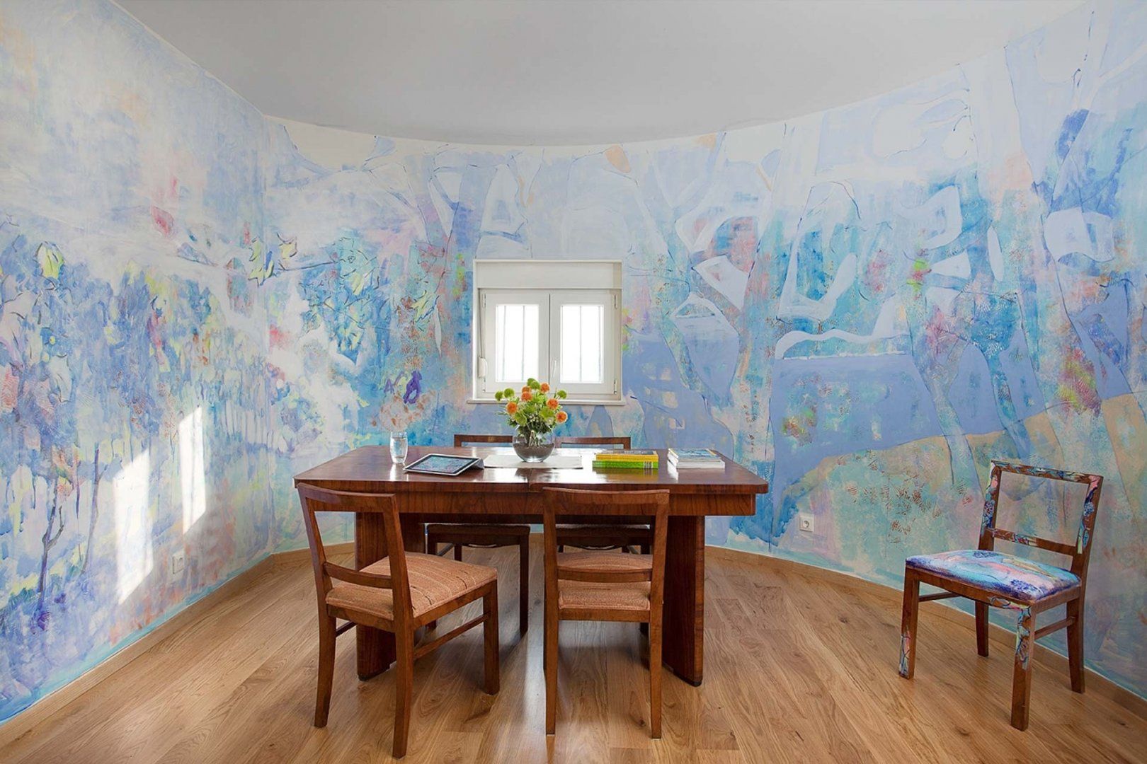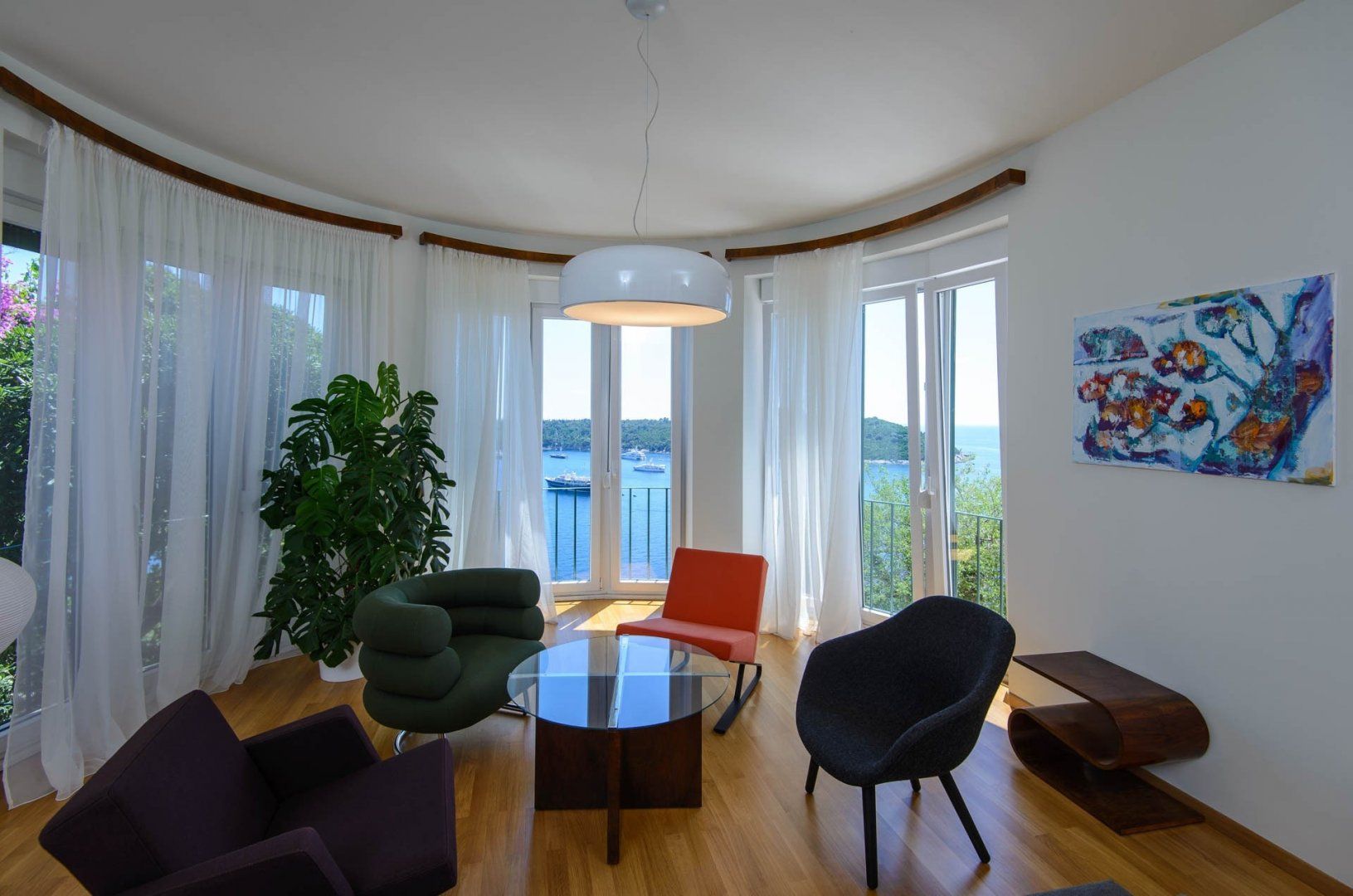 We love the interior, where the light fitting above the dining table looks like an installation in a modern art gallery, and the armchairs could feature in a mid-century museum. Vibrant pictures adorn the walls throughout and the paint-splattered walls of the second living room feel like a work of art in itself. Painting isn’t the only pursuit celebrated in this home – the chrome kitchen could be the canvas for a professional chef and there’s a piano for the maestro of the group in the turret lounge. Bedrooms are sanctuaries, some with access to private balconies, but our favourite has to be the room at the top of the house with its selection of literature for a quiet read.