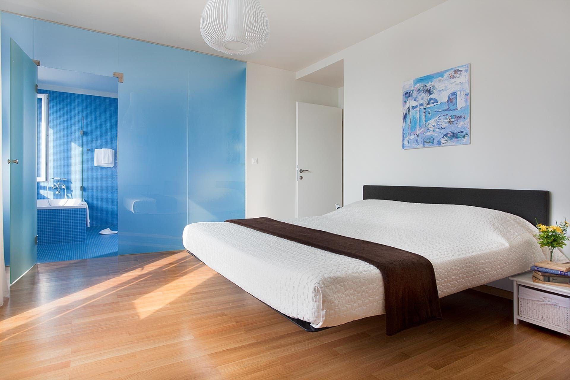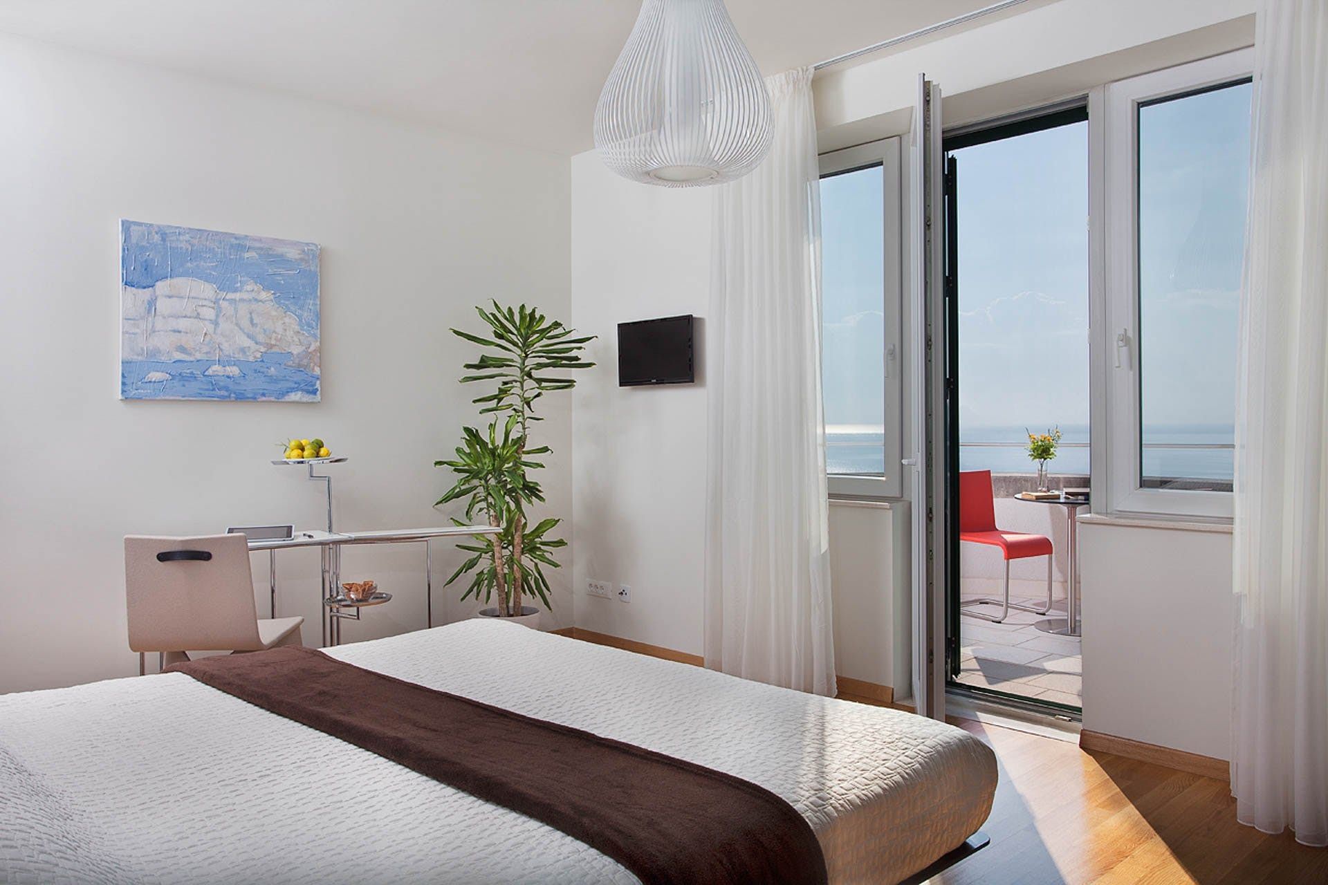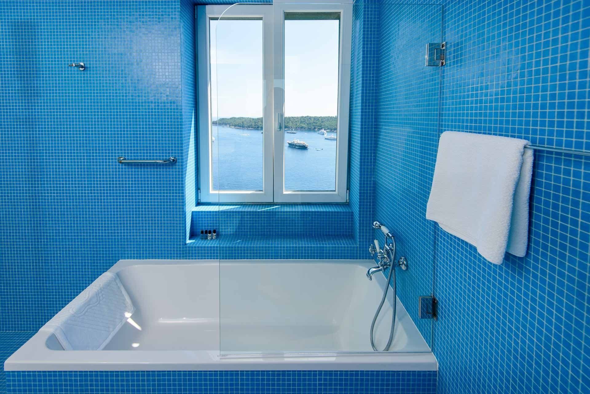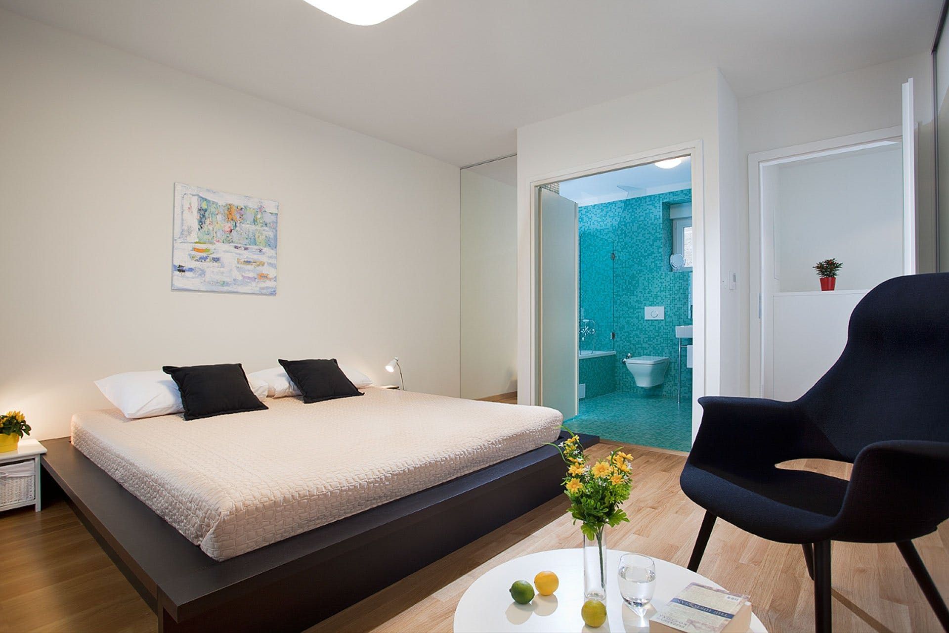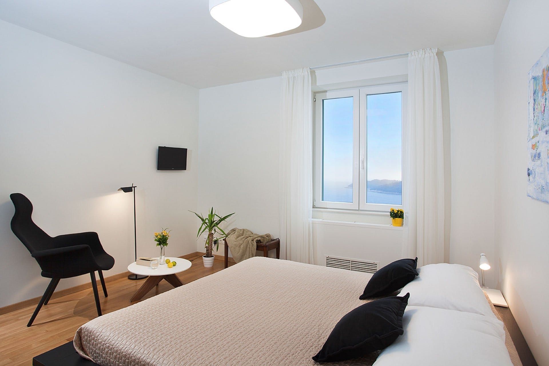 Tiered terraces hang on the hillside, affording fabulous views of Lokrum island, floating out in the crystal Adriatic Sea. Out here, you’ve got a private pool to cool off and, one level up, a sunken Jacuzzi tub for a soothing soak. Dining in the shade of a parasol is a delight with that view to keep the group talking.
