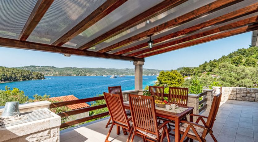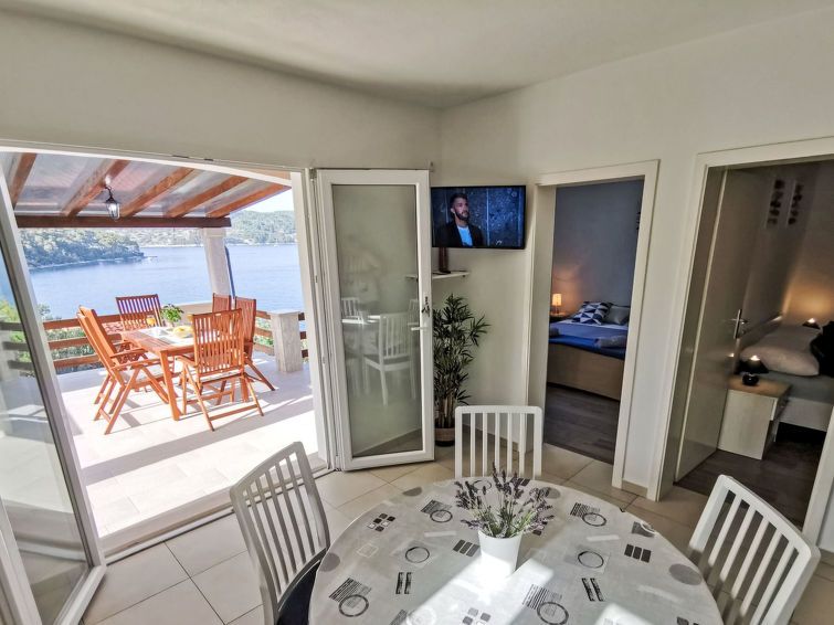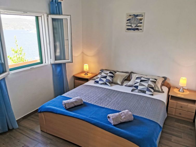 3-room house 55 m2, north facing position. 1 room with 1 french bed (160 cm, length 200 cm), shower/WC. 1 room with 2 beds (90 cm, length 190 cm). 1 room with 1 double bed (2 x 90 cm, length 200 cm). Open kitchen (2 hot plates, freezer) with dining table, satellite TV (flat screen).