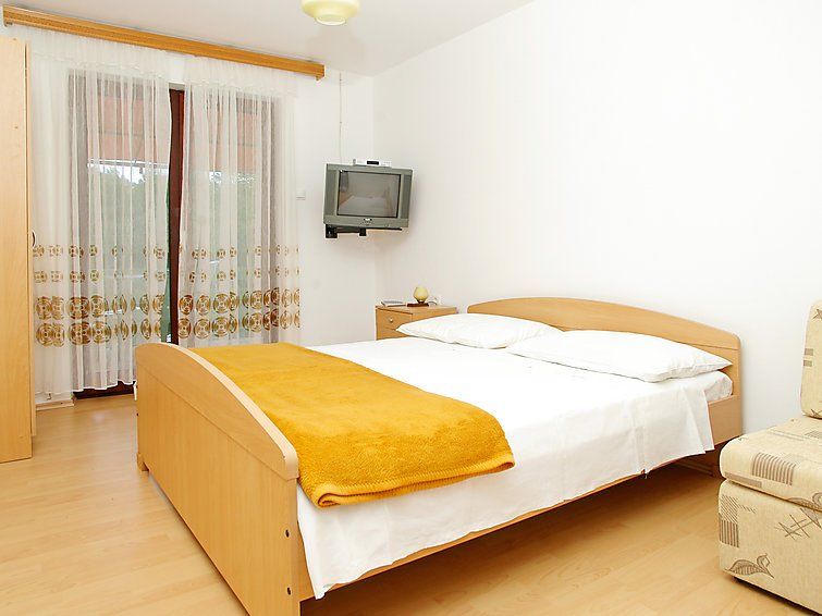 2-room apartment 35 m2 on 1st floor, south facing position. 1 room with 1 french bed (160 cm, length 190 cm), satellite TV. Exit to the balcony. 1 room with 1 bed (80 cm, length 190 cm), open-hearth fireplace. Kitchen (2 hot plates) with dining table. Shower/WC. Balcony 7 m2. Terrace furniture.