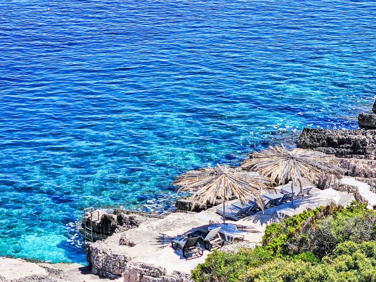 Large beautiful covered terrace with path to private sea-side plateau, on which worn palm leaf parasols. Apartment with worn bathroom, outdated furniture, too little kitchen equipment. The kitchen with sofa bed is far too small for 4 people. The most negative aspect is the lack of air conditioning. A pity because it is located on a cozy bay in the middle of the island, an ideal base.