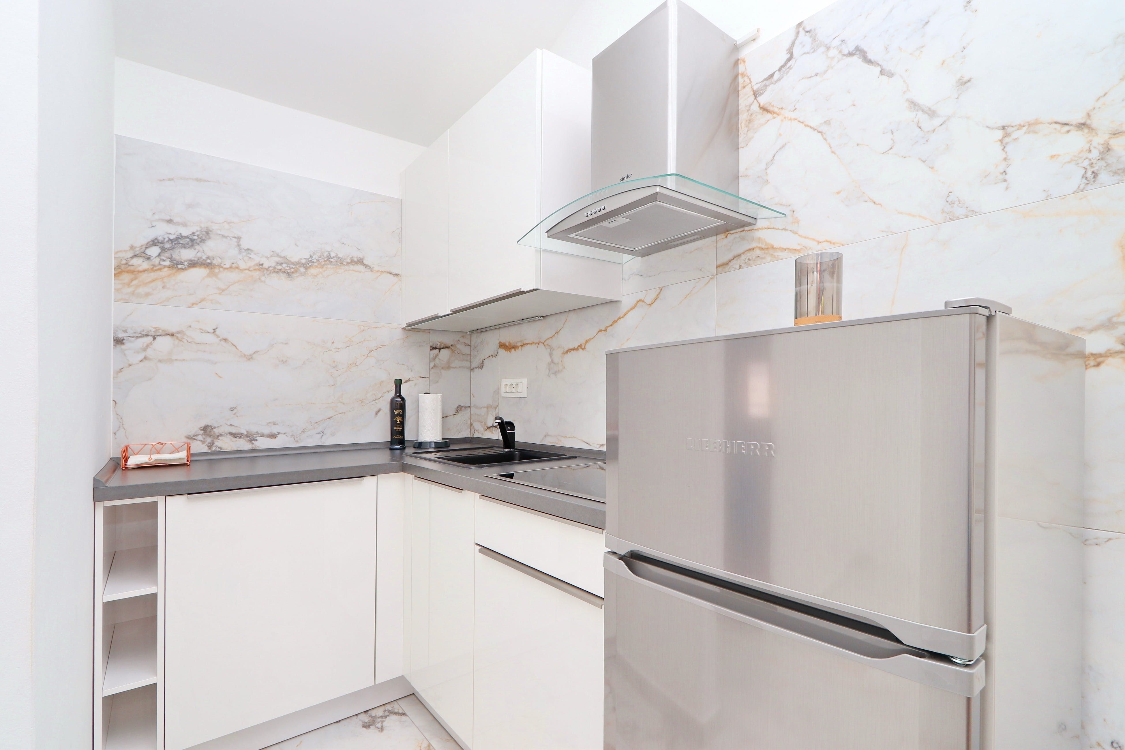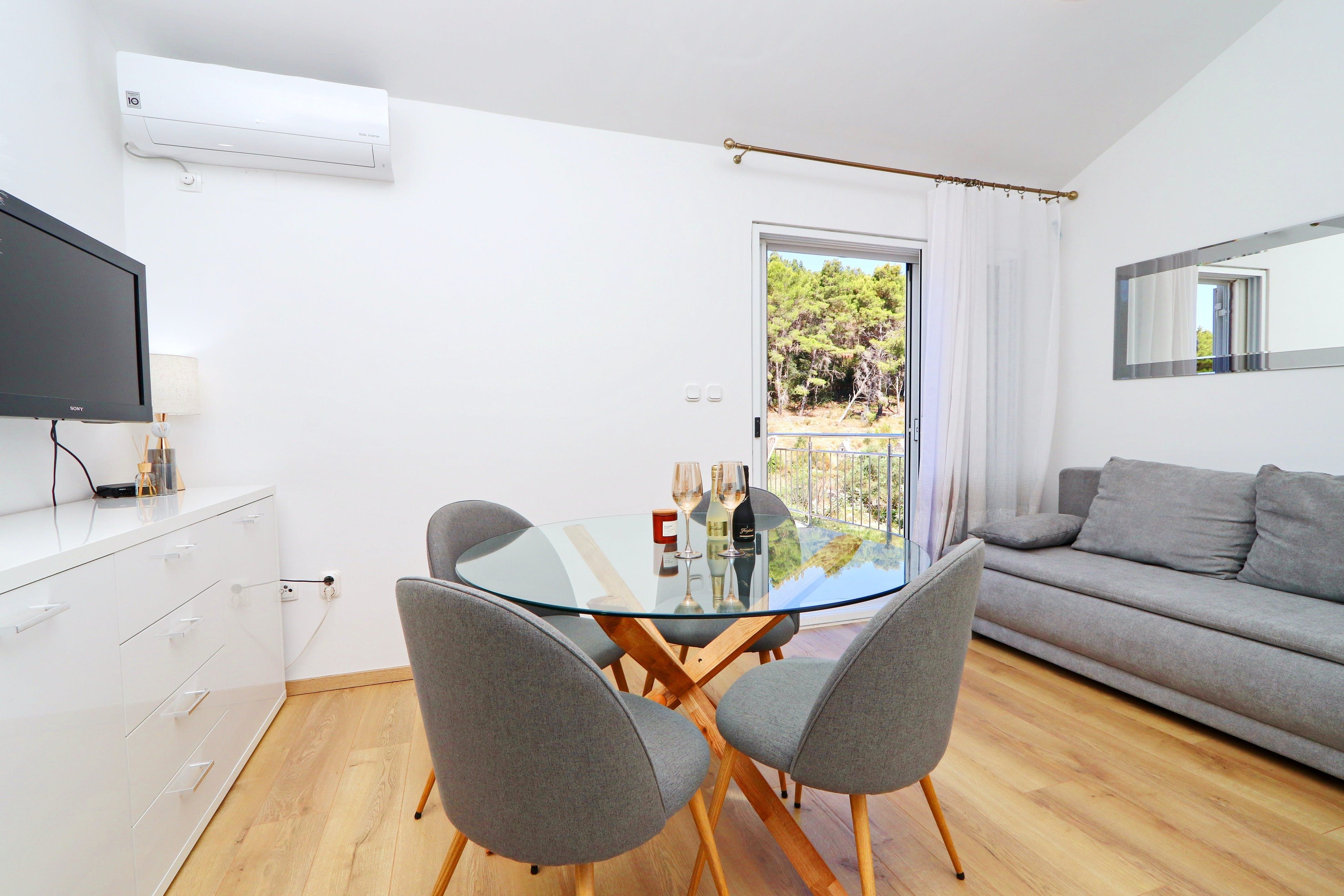 In the first building there are two apartments of 35 sqm. Each apartment has a living room, a kitchen, one double bedroom (with double bed, 160cm x 120cm) with ensuite bathroom (with shower). Each apartment has a balcony with comfortable outdoor seating and a beautiful view of the bay.