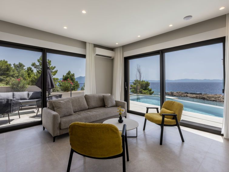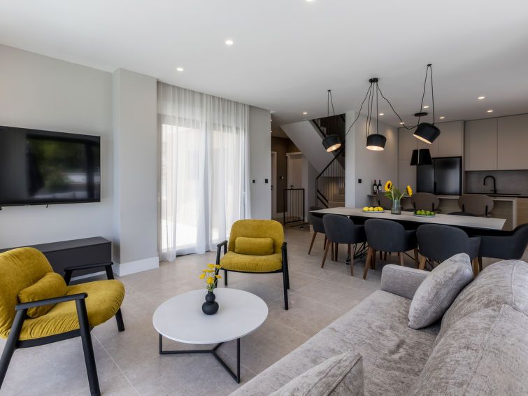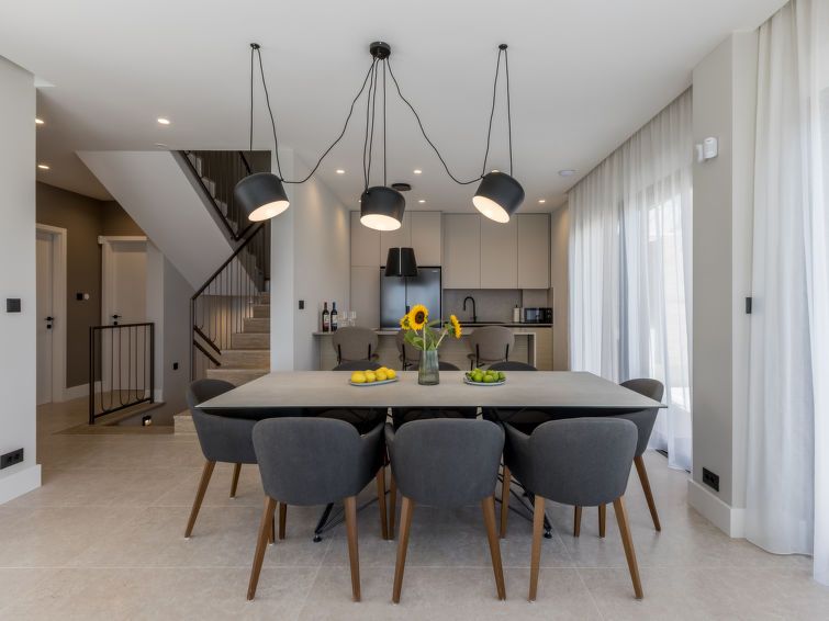 6-room villa 165 m2 on 3 levels. Living/dining room with satellite TV and air conditioning. Exit to the terrace. Open kitchen (oven, dishwasher, 4 ceramic glass hob hotplates, toaster, kettle, microwave, freezer, electric coffee machine) with dining table. Exit to the terrace. Sep.