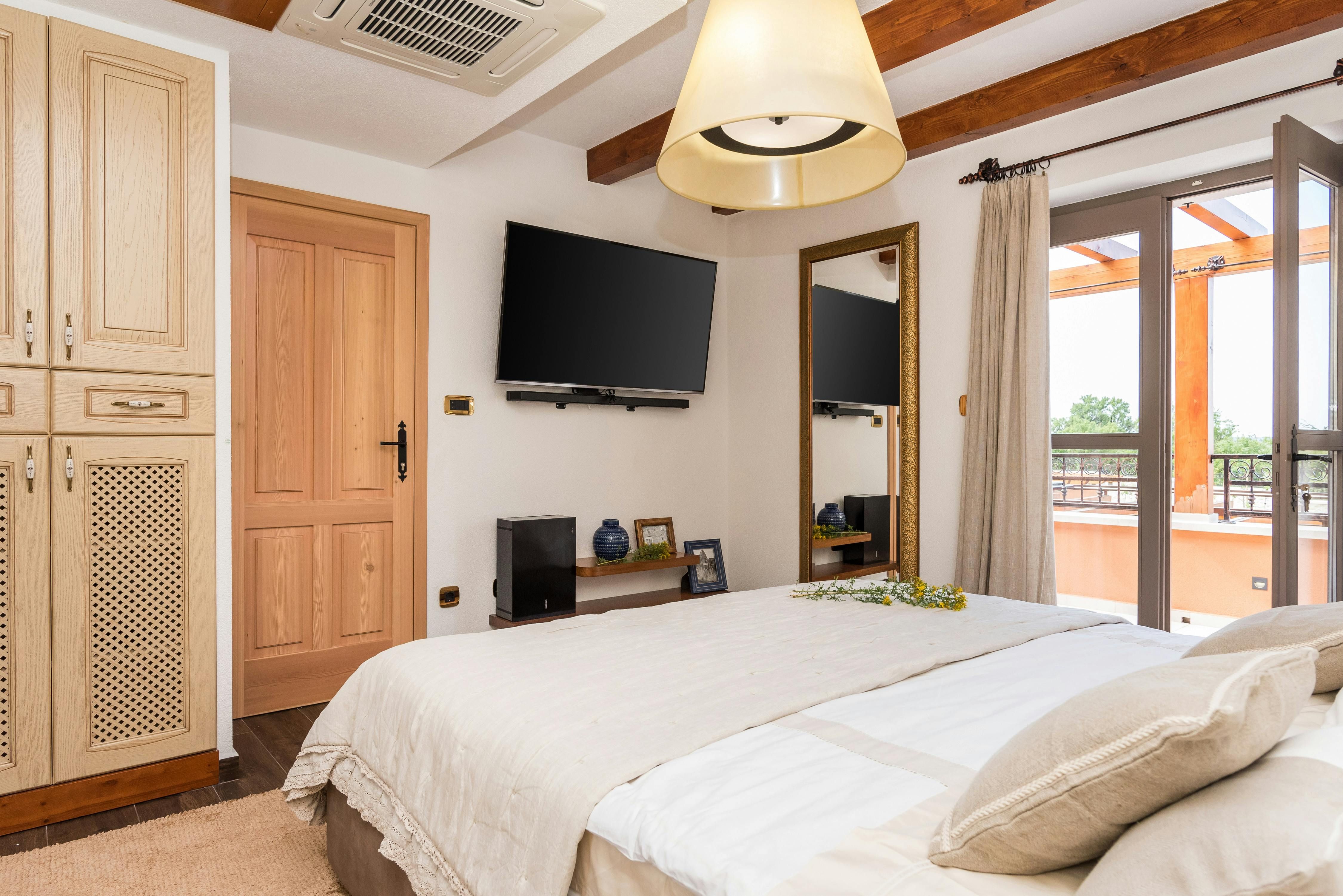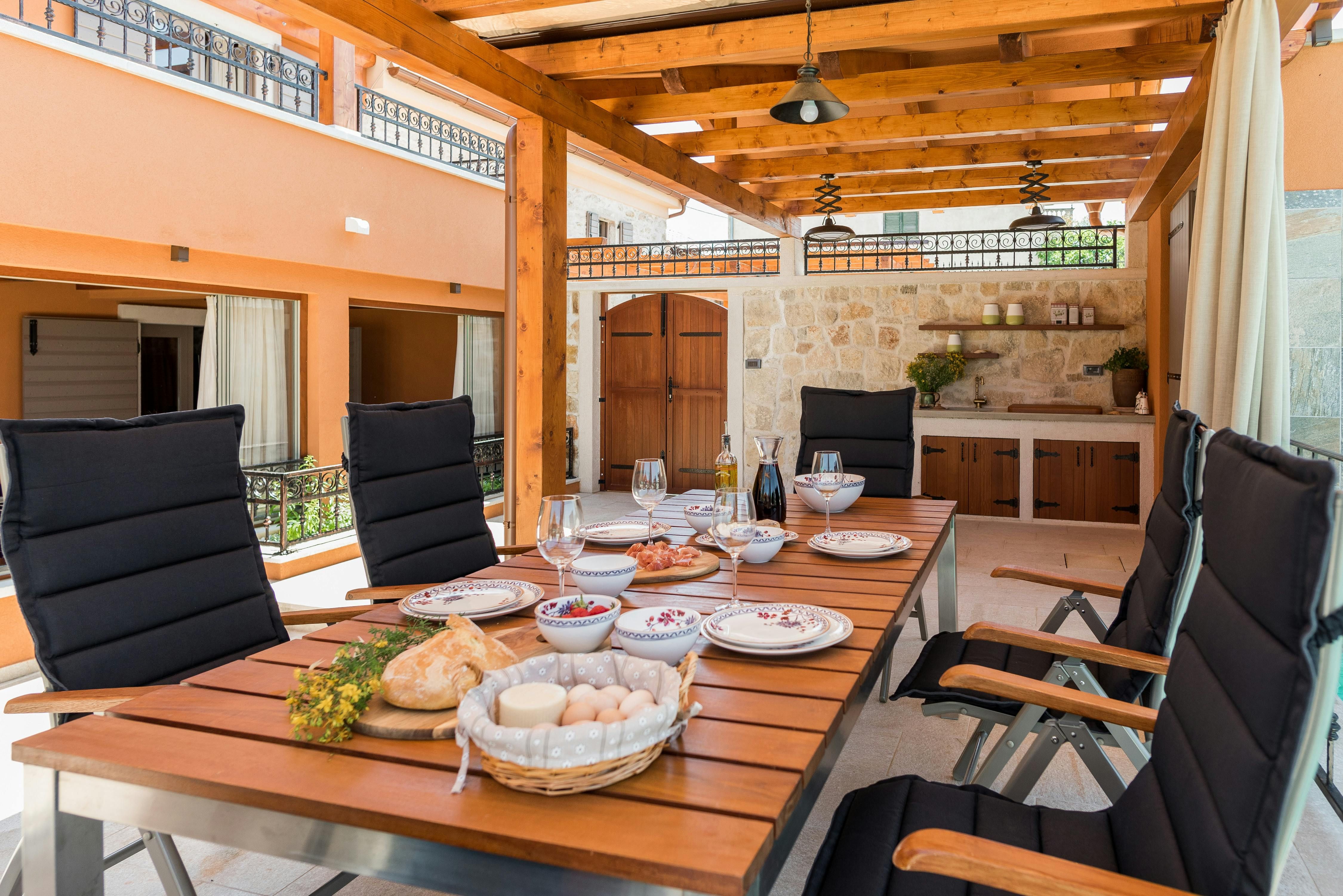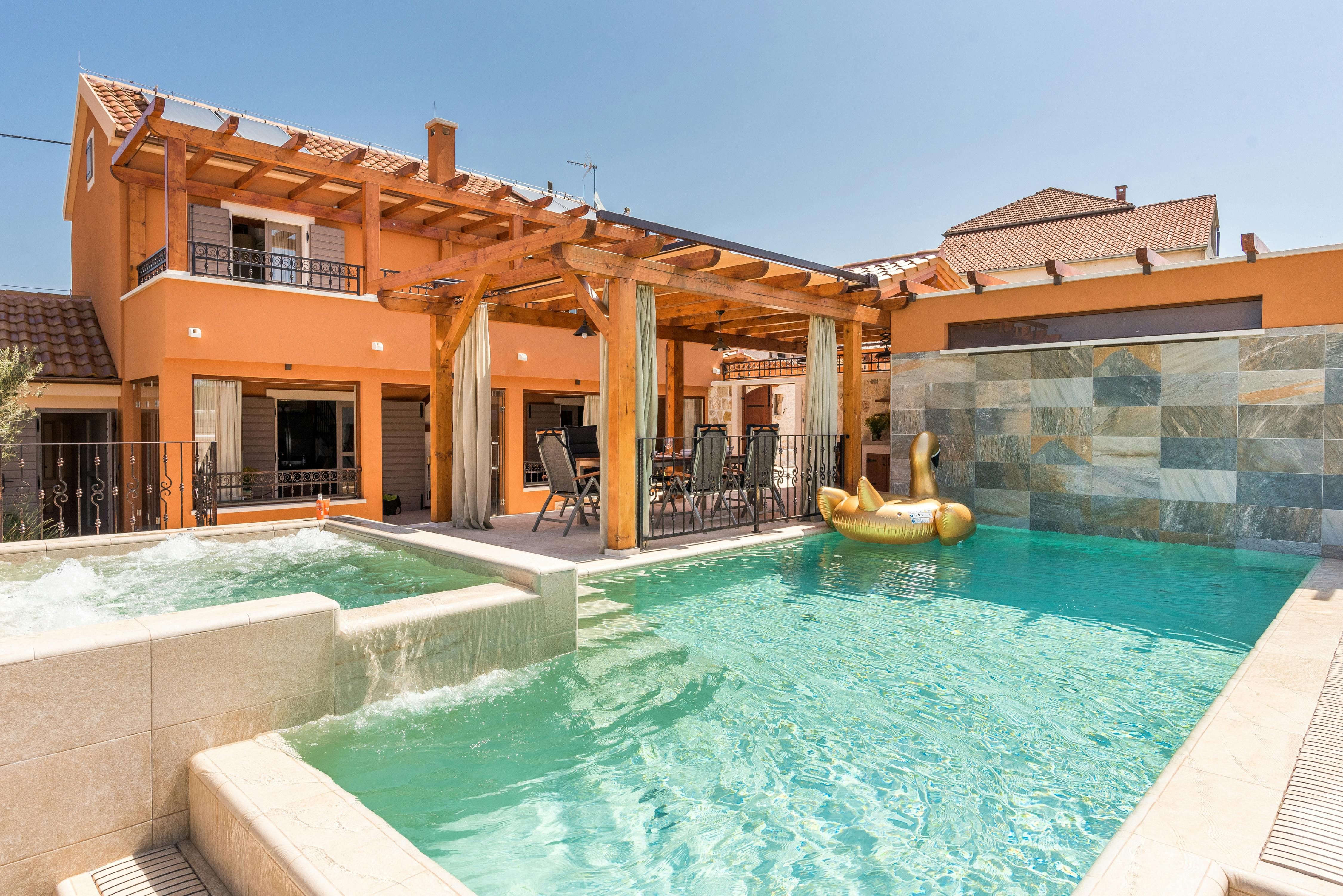 This stunning villa in Croatia is the perfect paradise for families or groups of friends looking for a luxurious and comfortable vacation. With 1,500 m² of completely fenced area, guests can relax in the outdoor area with amenities such as a heated pool with hydromassage, a Jacuzzi, and an infrared sauna. The outdoor space also includes comfortable loungers, seats at tables, roofed and open, a children's playground, a table tennis table, a basketball hoop, bicycles and a volleyball net. Inside, the villa is stylishly decorated with light walls and floors, natural stone elements and exposed beam ceilings. The air conditioning system ensures individually suitable comfort temperatures and modern technical equipment with satellite TV, wireless internet and Bluetooth sound system provide contemporary entertainment. The open living-dining area is perfect for relaxing or enjoying meals together while the fully equipped kitchen is conveniently integrated. All three double bedrooms have en suite bathrooms with showers or bathtubs. Overall, this villa offers the perfect combination of luxury and comfort for an unforgettable vacation.