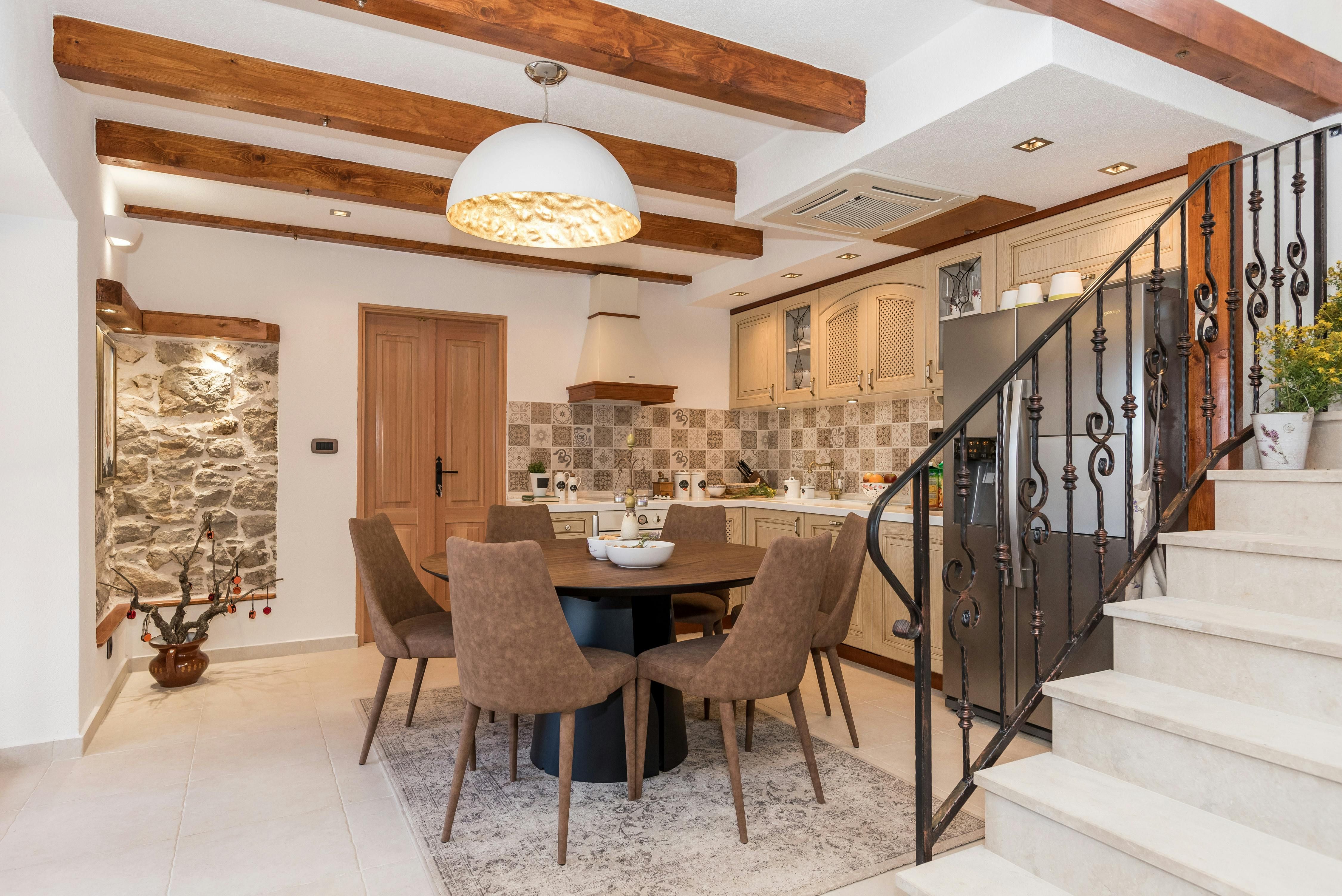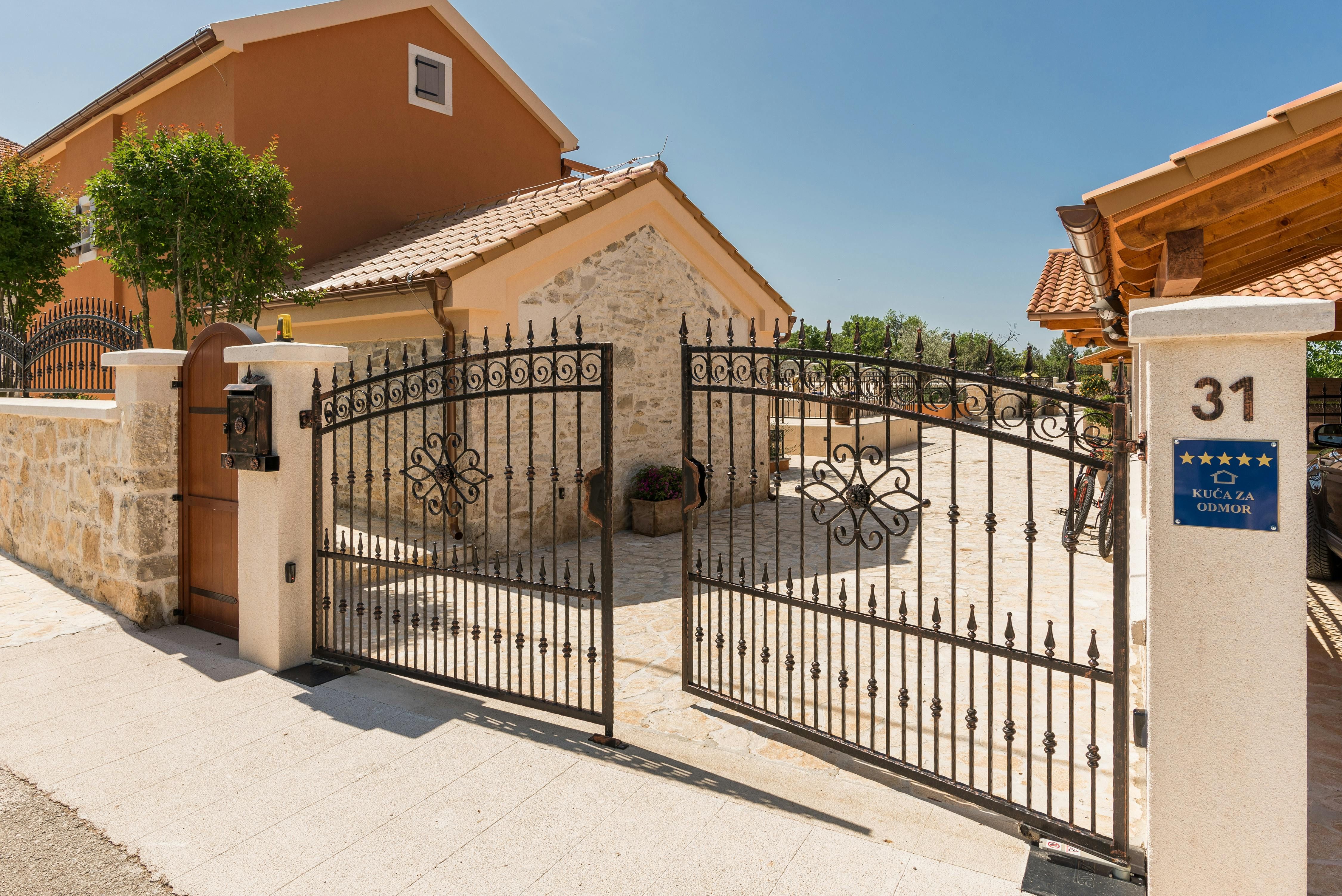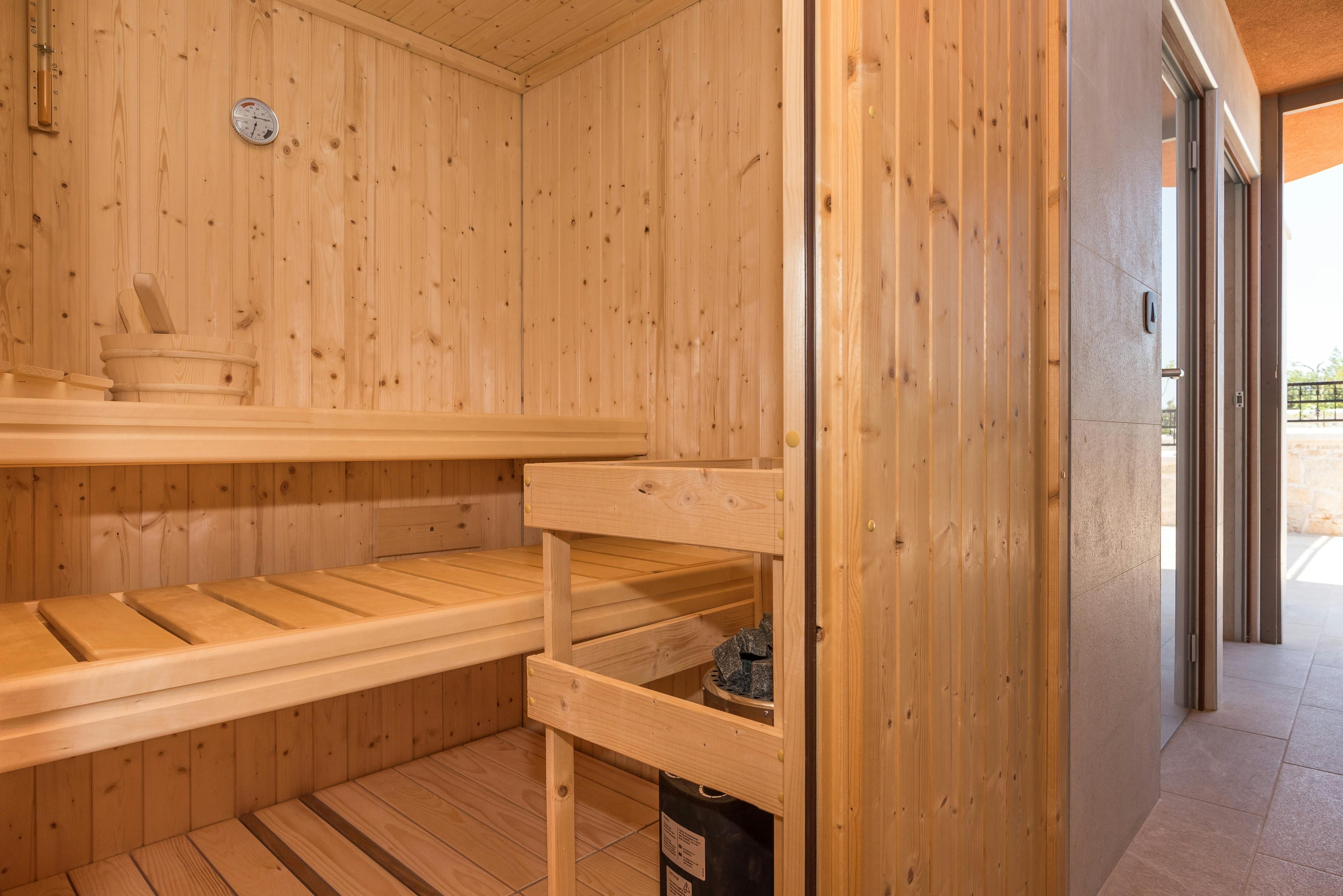 This stunning villa in Croatia is the perfect paradise for families or groups of friends looking for a luxurious and comfortable vacation. With 1,500 m² of completely fenced area, guests can relax in the outdoor area with amenities such as a heated pool with hydromassage, a Jacuzzi, and an infrared sauna. The outdoor space also includes comfortable loungers, seats at tables, roofed and open, a children's playground, a table tennis table, a basketball hoop, bicycles and a volleyball net. Inside, the villa is stylishly decorated with light walls and floors, natural stone elements and exposed beam ceilings. The air conditioning system ensures individually suitable comfort temperatures and modern technical equipment with satellite TV, wireless internet and Bluetooth sound system provide contemporary entertainment. The open living-dining area is perfect for relaxing or enjoying meals together while the fully equipped kitchen is conveniently integrated. All three double bedrooms have en suite bathrooms with showers or bathtubs. Overall, this villa offers the perfect combination of luxury and comfort for an unforgettable vacation.