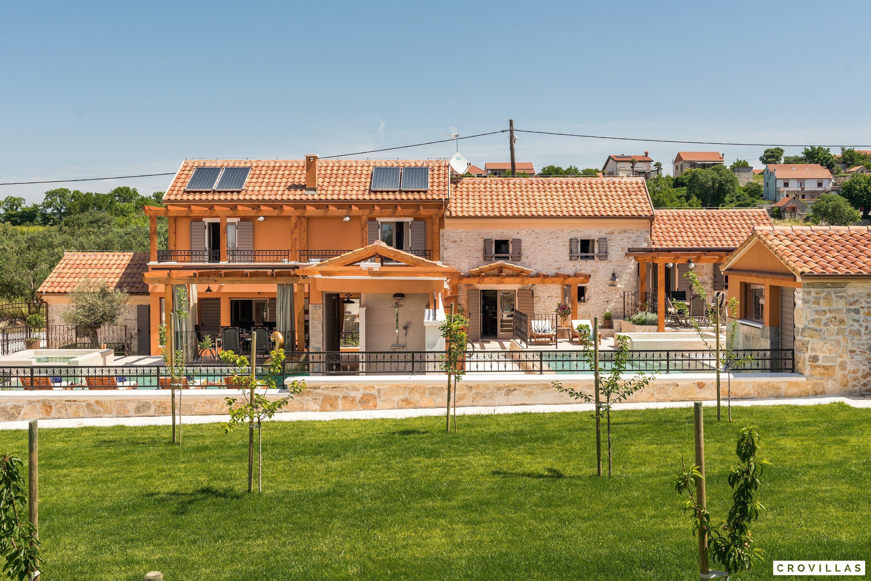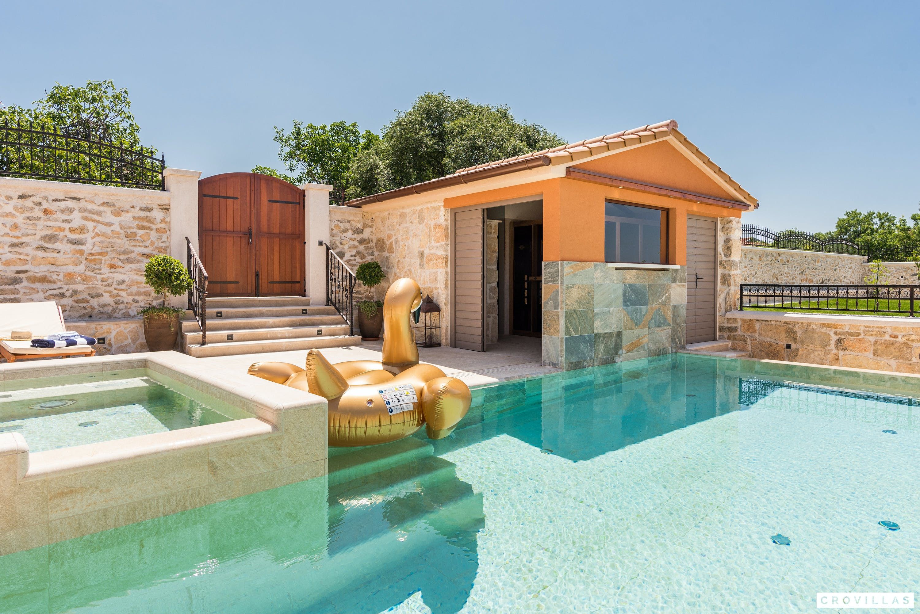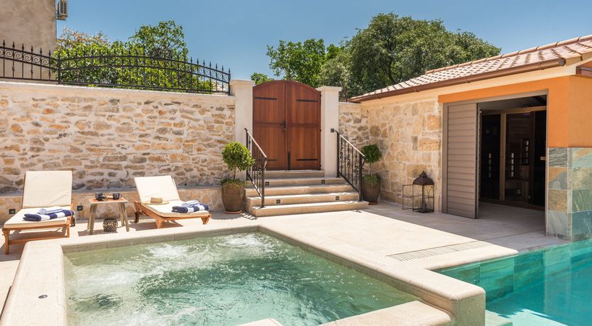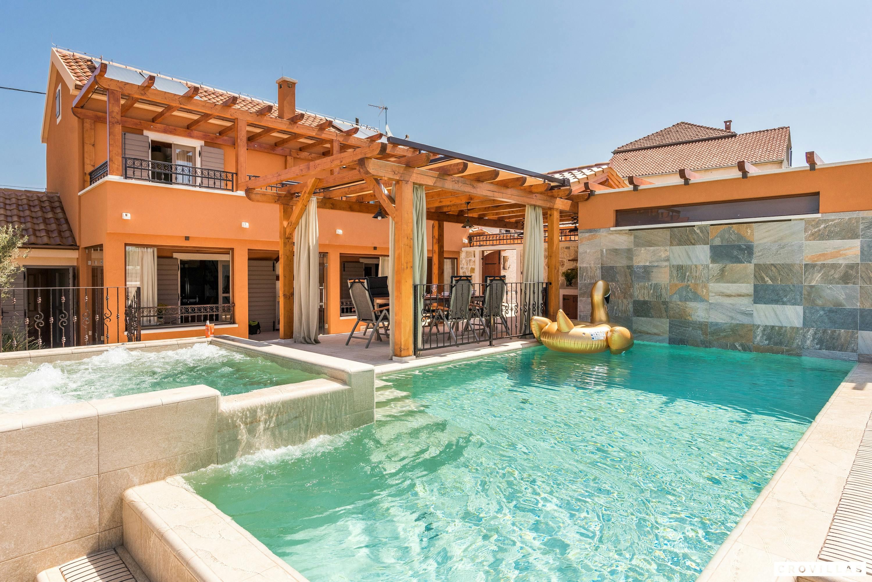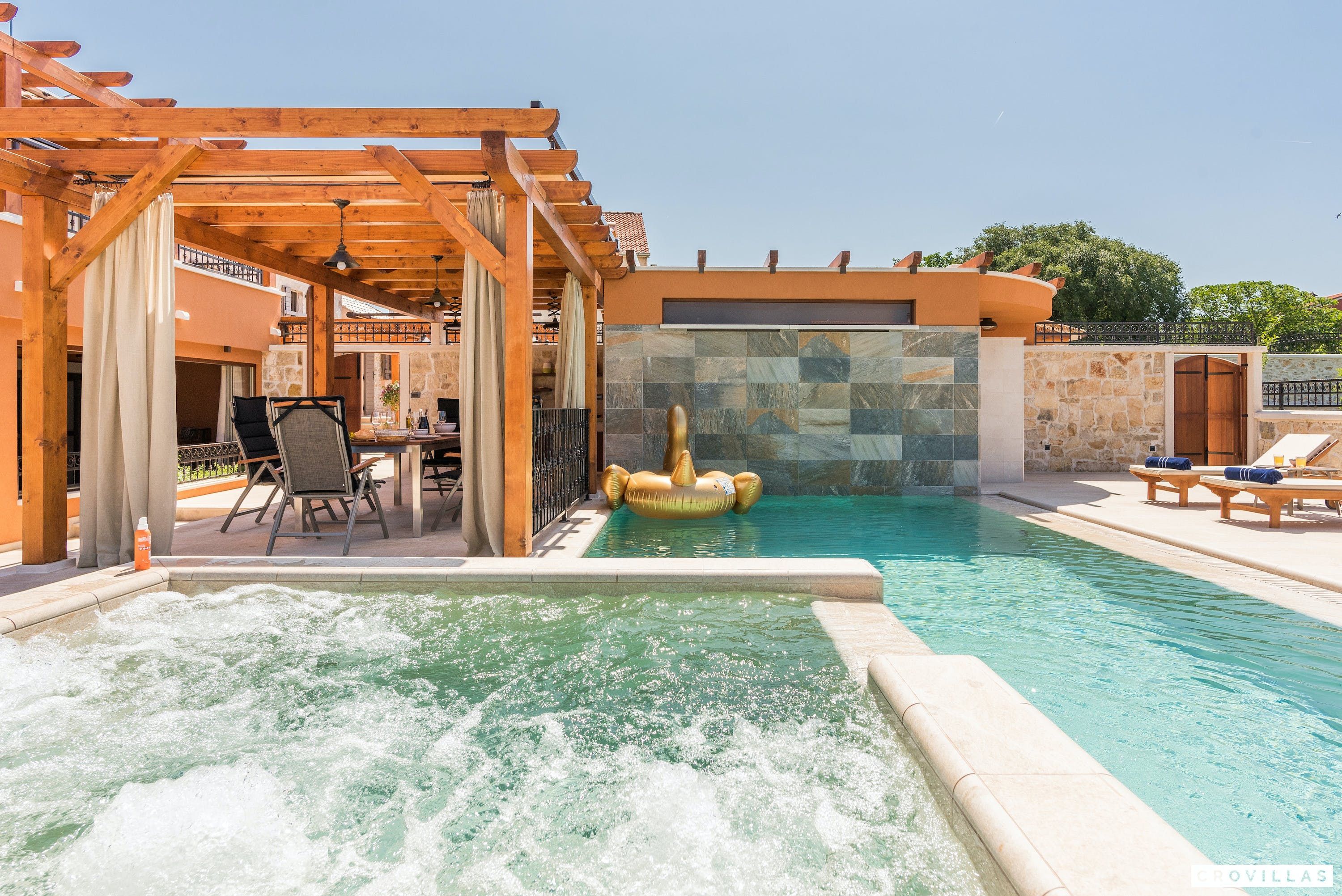 This stunning vacation rental is perfect for families or groups of friends seeking a luxurious retreat that offers both privacy and plenty of space to spread out. The home consists of two beautiful semi-detached villas, each with five double bedrooms and en-suite bathrooms equipped with either showers or bathtubs. The stylishly decorated interior boasts light walls and floors, natural stone elements, and exposed beam ceilings. Guests can relax together in the open living-dining area, which includes a fully equipped kitchen conveniently integrated into the space. Outside on the fenced grounds, guests can enjoy two heated pools with hydromassage, a Jacuzzi, two saunas (infrared and steam), an outdoor kitchen, a children's playground, table tennis, basketball hoop, bicycles and volleyball net. The location in Croatia is perfect for those looking for a beach holiday with modern amenities.