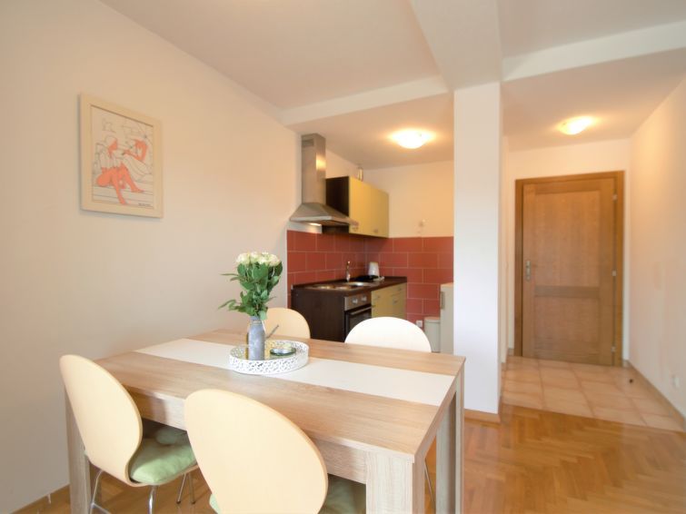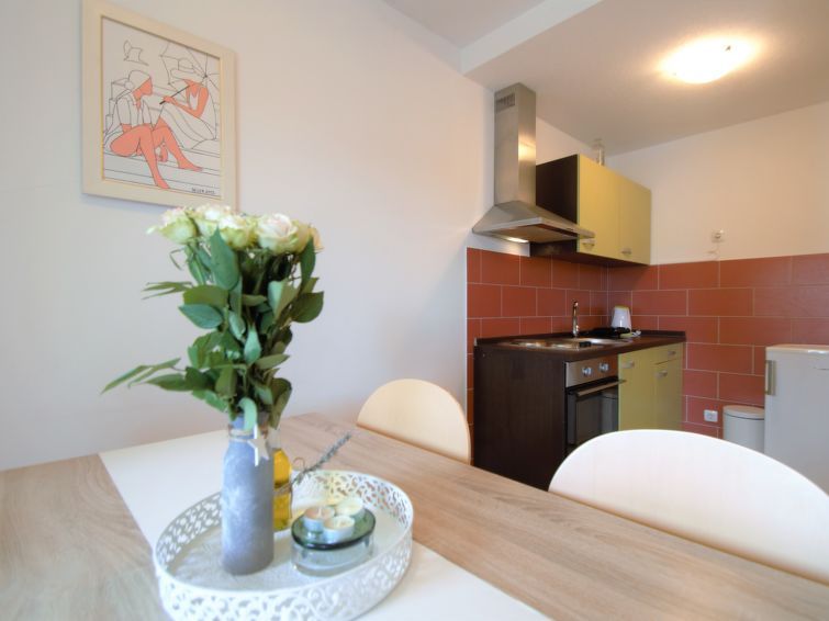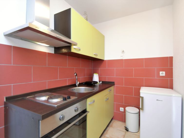2-room apartment 46 m2, on the ground floor, south-west facing position. Living/dining room with 1 double sofabed (150 cm, length 200 cm), satellite TV (flat screen), air conditioning. Exit to the balcony. 1 room with 1 french bed (160 cm, length 200 cm). Open kitchen (2 hot plates, oven, kettle, freezer, electric coffee machine).
