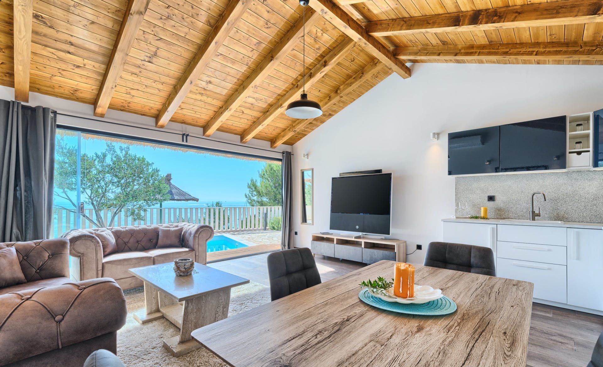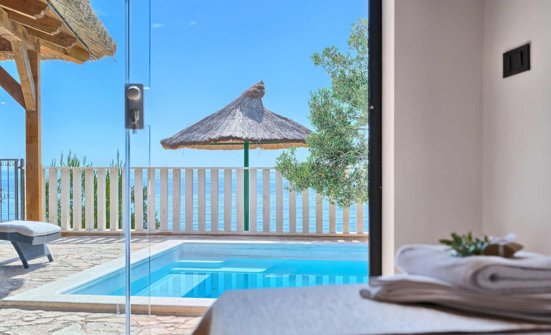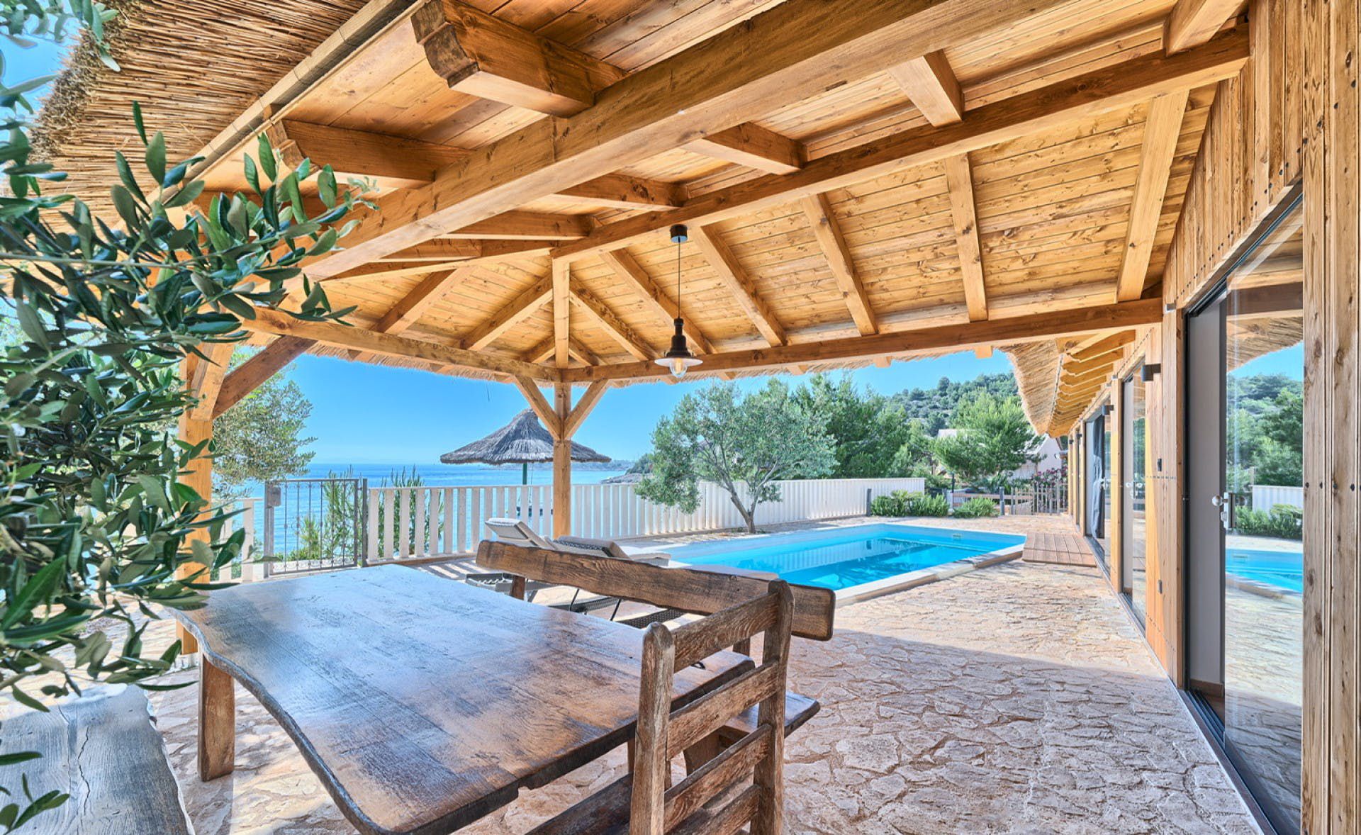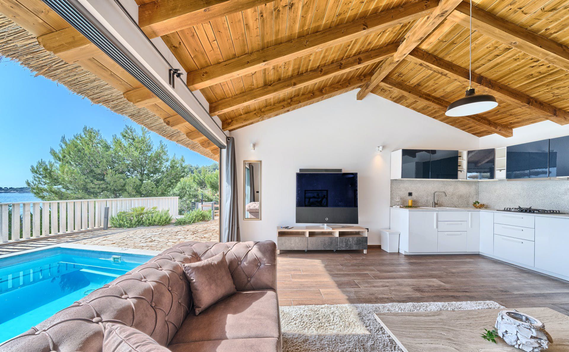 With fantastic views of the Adriatic Sea, this villa has a great location on the island of Murter in Northern Dalmatia. You can enjoy the vistas from the private pool and terrace, and there’s access to a tennis court here, too. We particularly love the open-plan living room with its large sliding doors, making the most of the panorama beyond. Just one thing to mention. The kitchen has no oven or microwave, but there’s a hob and there’s a restaurant 10 metres away. Which brings us onto the setting – it’s a highlight for sure. There’s a beach 10 metres away, and there are countless other bays to discover.