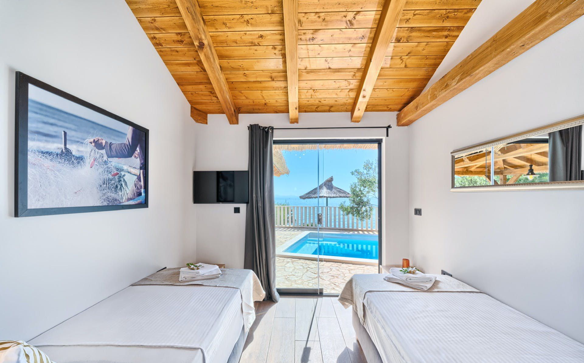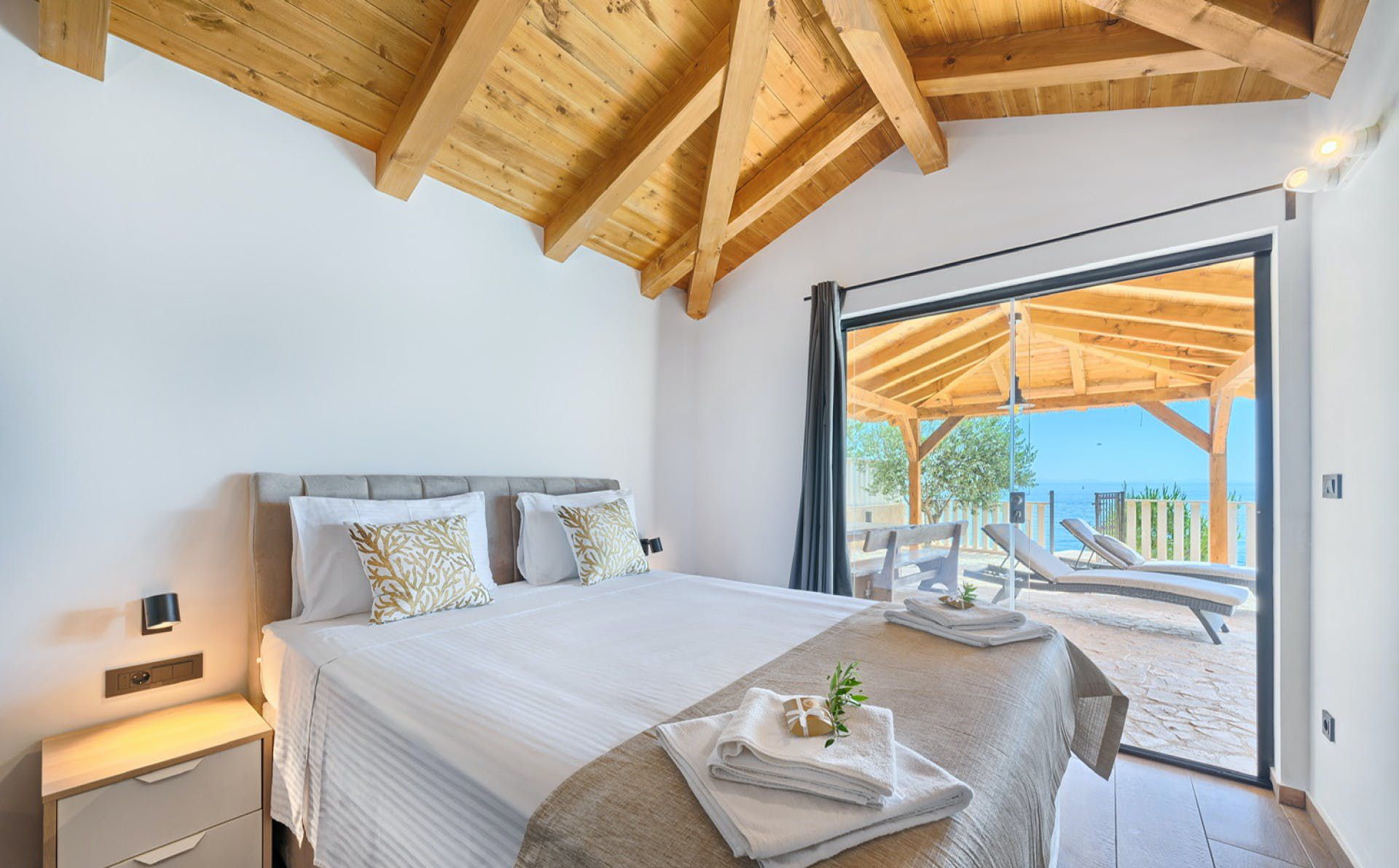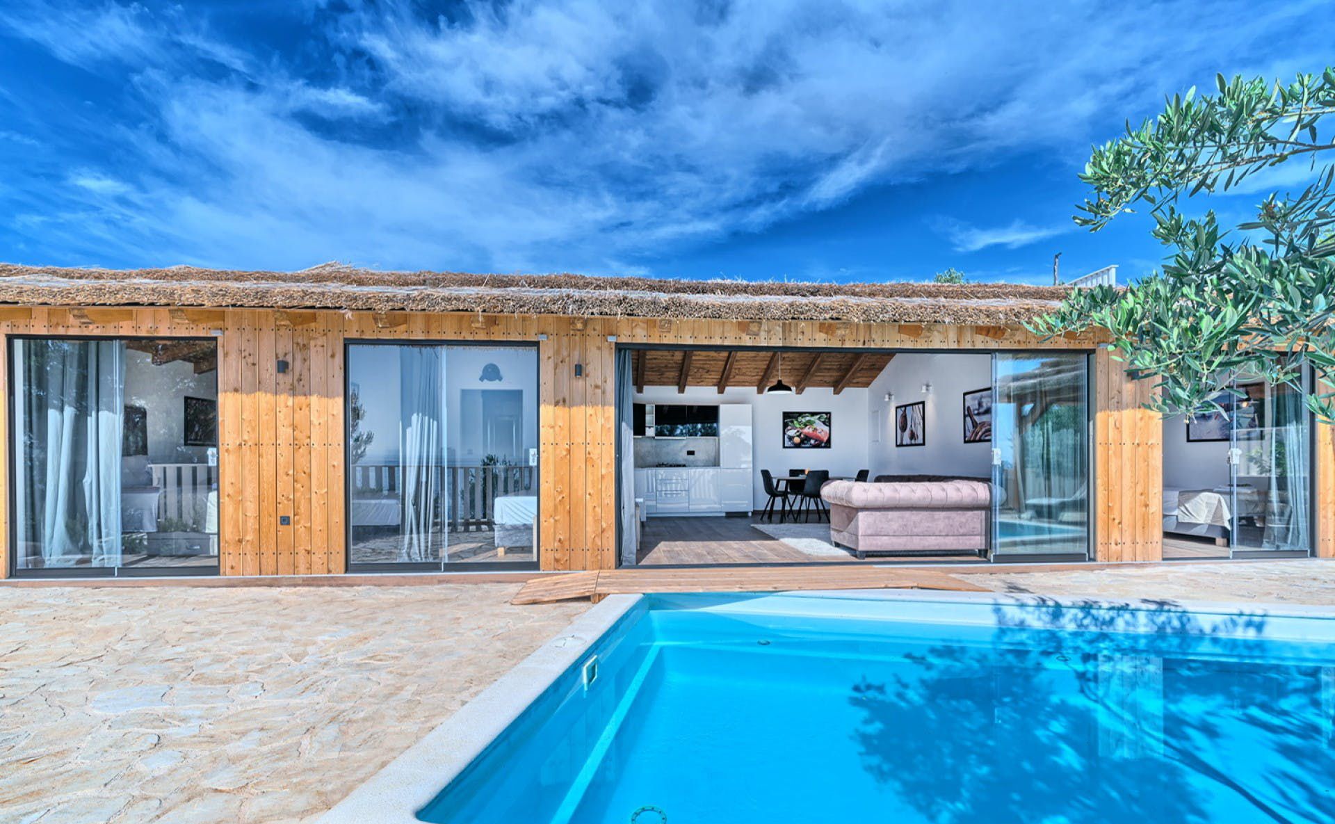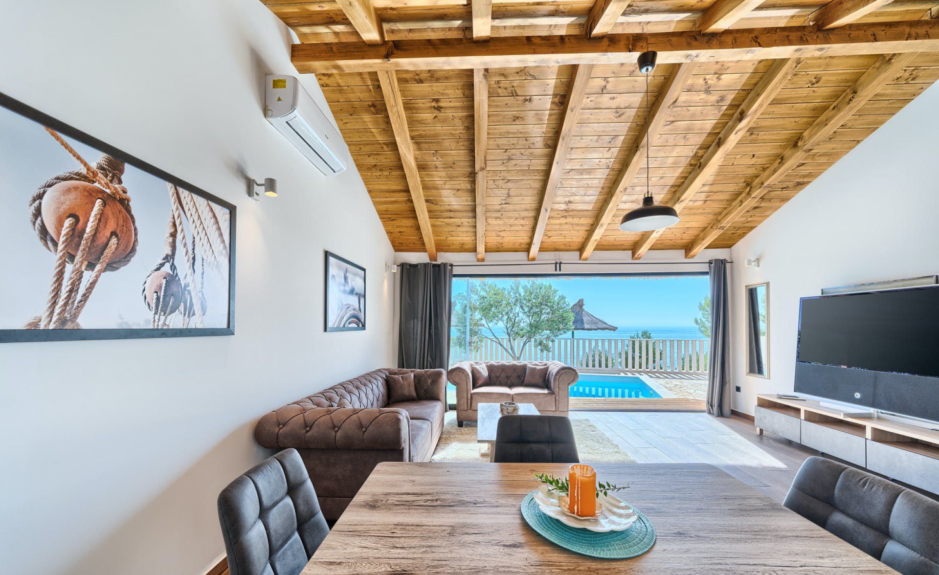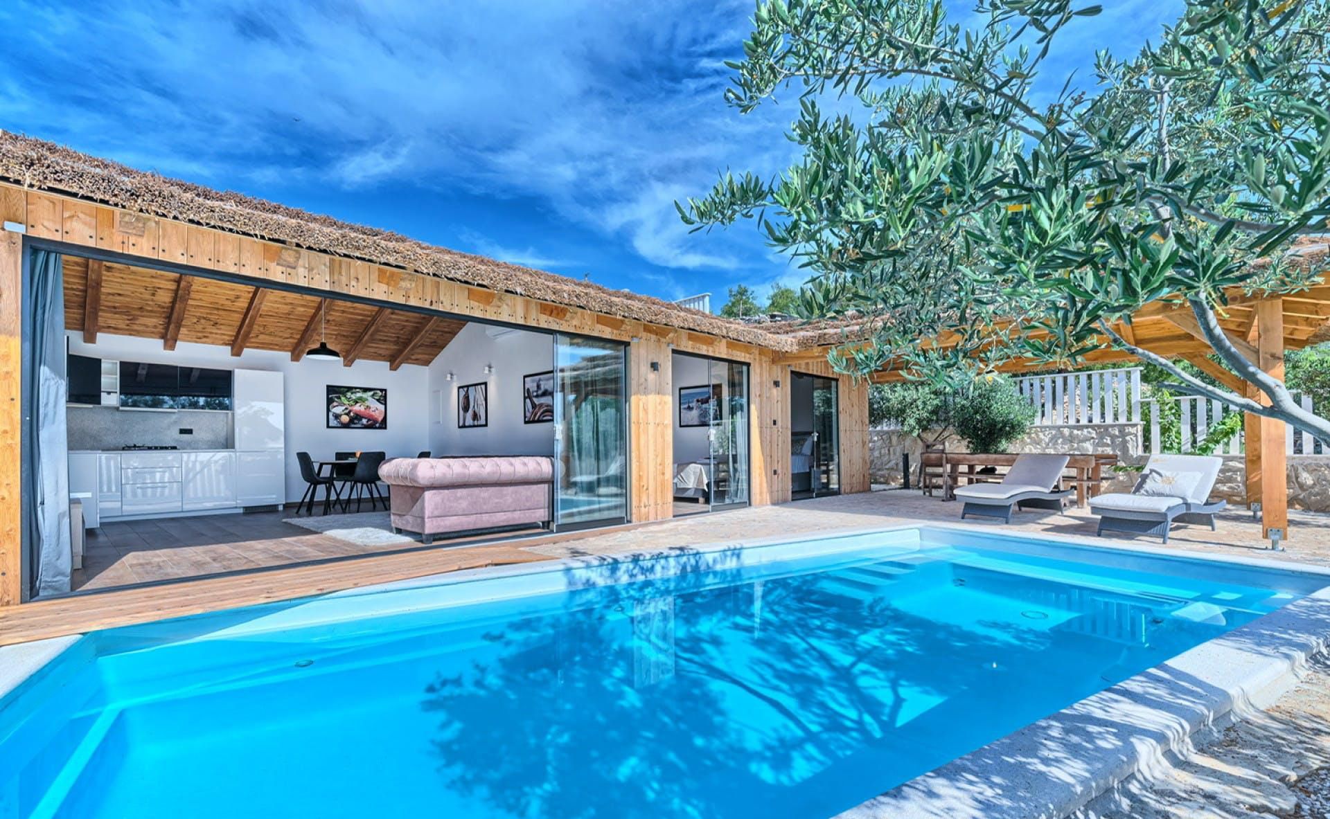 With fantastic views of the Adriatic Sea, this villa has a great location on the island of Murter in Northern Dalmatia. You can enjoy the vistas from the private pool and terrace, and there’s access to a tennis court here, too. We particularly love the open-plan living room with its large sliding doors, making the most of the panorama beyond. Just one thing to mention. The kitchen has no oven or microwave, but there’s a hob and there’s a restaurant 10 metres away. Which brings us onto the setting – it’s a highlight for sure. There’s a beach 10 metres away, and there are countless other bays to discover.