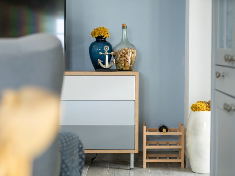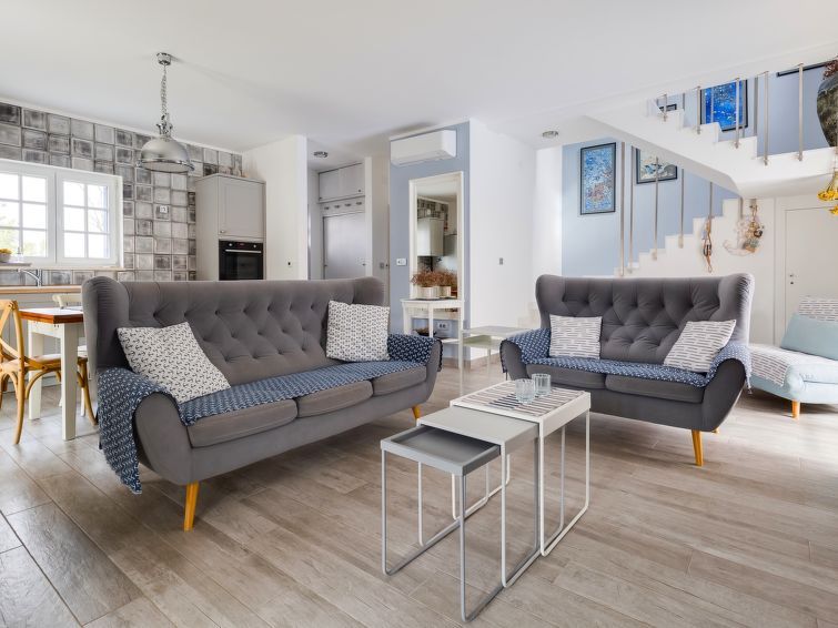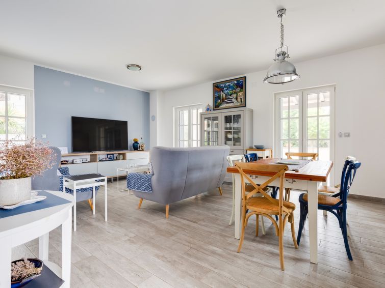 3-room semi-detached house 120 m2 on 2 levels. Living/dining room 30 m2 with 2 beds (100 cm, length 200 cm), TV (flat screen), air conditioning. Exit to the terrace. Open kitchen (oven, dishwasher, 4 ceramic glass hob hotplates, toaster, freezer, electric coffee machine). Exit to the terrace.