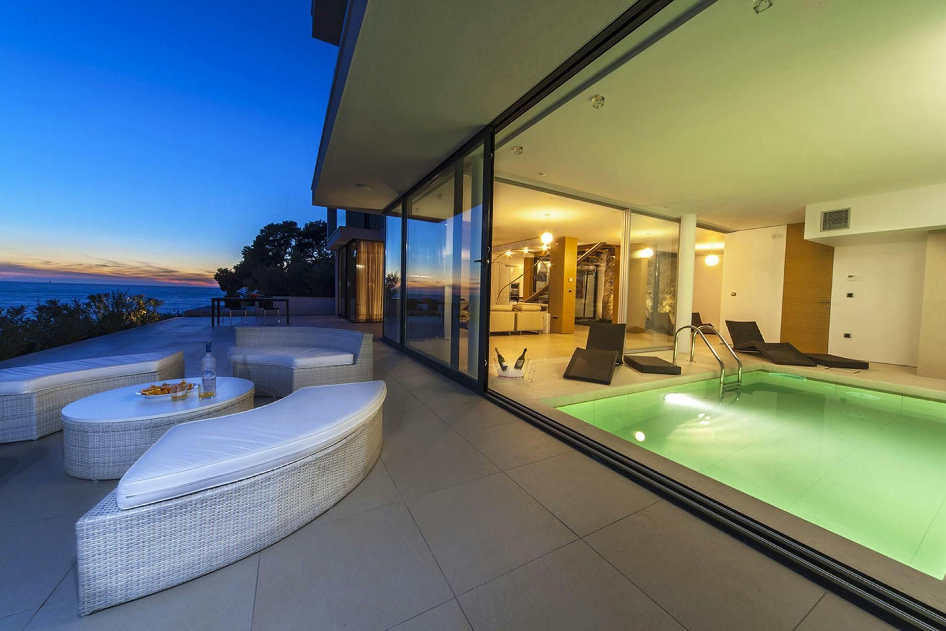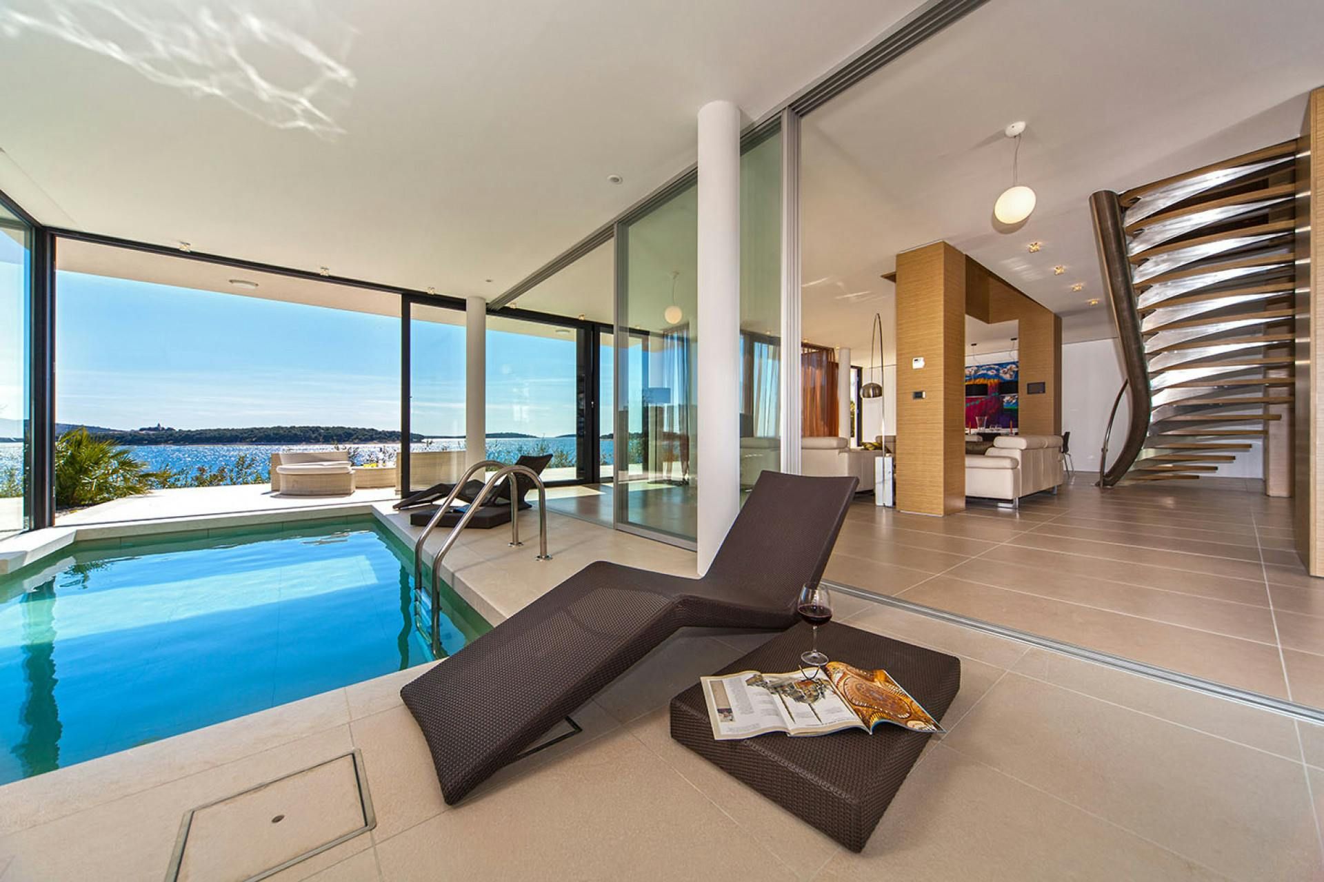 This modern villa is all light and sea breeze. Set along the craggy coastline on the outskirts of historic Primošten and surrounded by vineyards, it feels like a serene retreat while remaining close to shops and tavernas. The focus here is on outdoor living, with floor-to-ceiling windows framing endless blues from both floors. Dine on the terrace, take an evening dip in the indoor swimming pool, or unwind in the sauna – you may find it hard to leave this tranquil hideaway.
