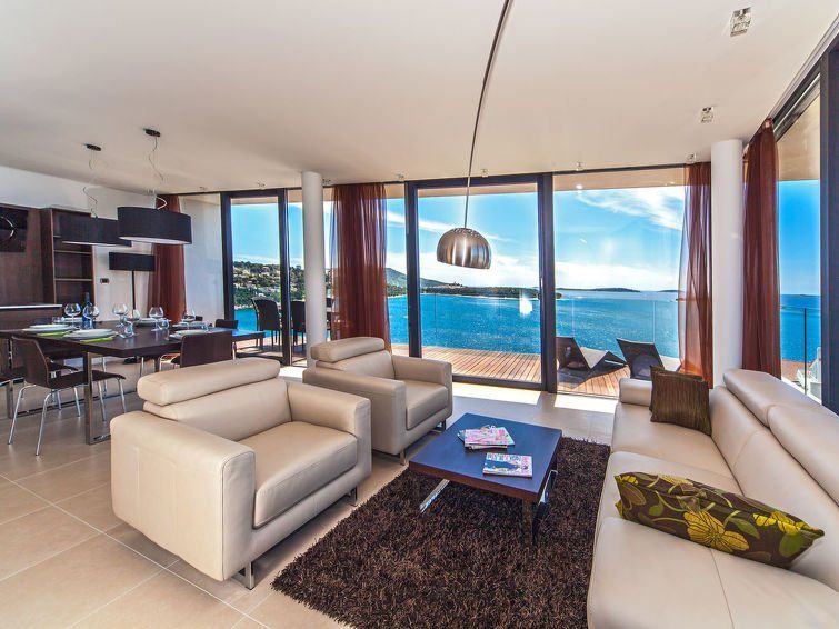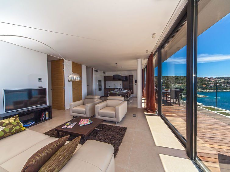 4-room apartment 116 m2 on 1st floor. Living/dining room with satellite TV (flat screen). Exit to the balcony. 2 rooms, each room with 1 double bed (2 x 90 cm, length 200 cm), satellite TV (flat screen). 1 room with 2 beds (90 cm, length 200 cm), satellite TV (flat screen). Open kitchen (oven, dishwasher, 4 ceramic glass hob hotplates, microwave, freezer).