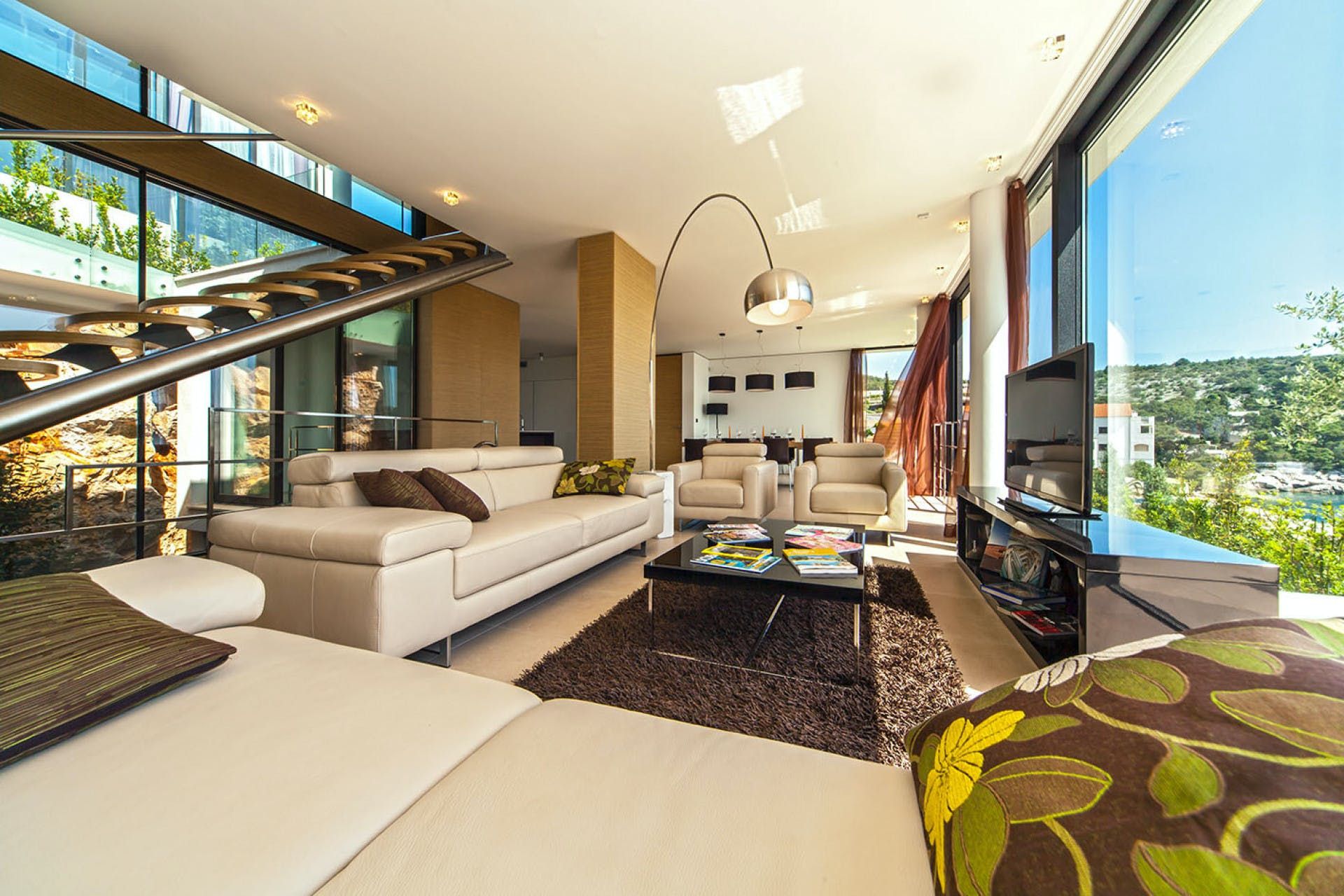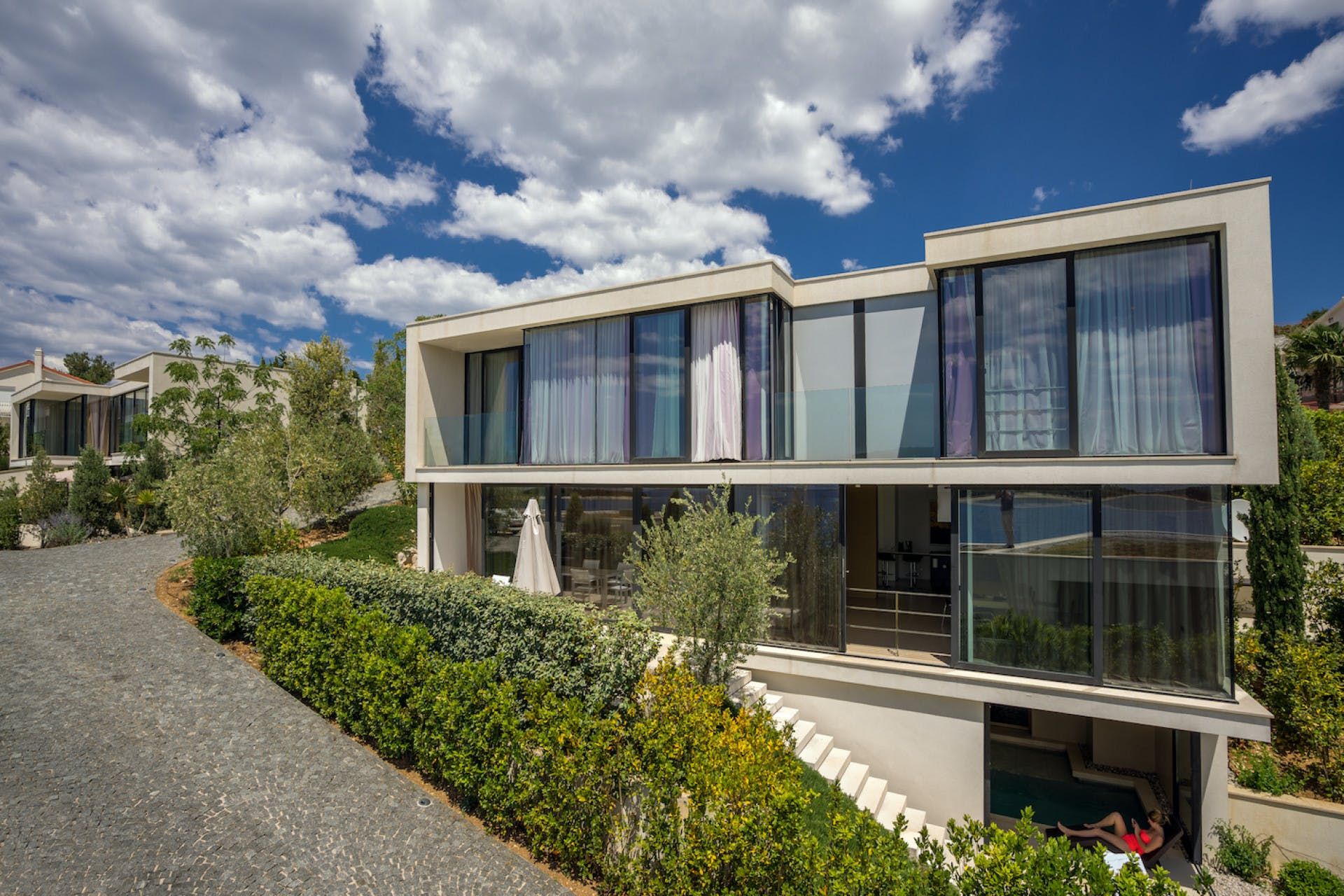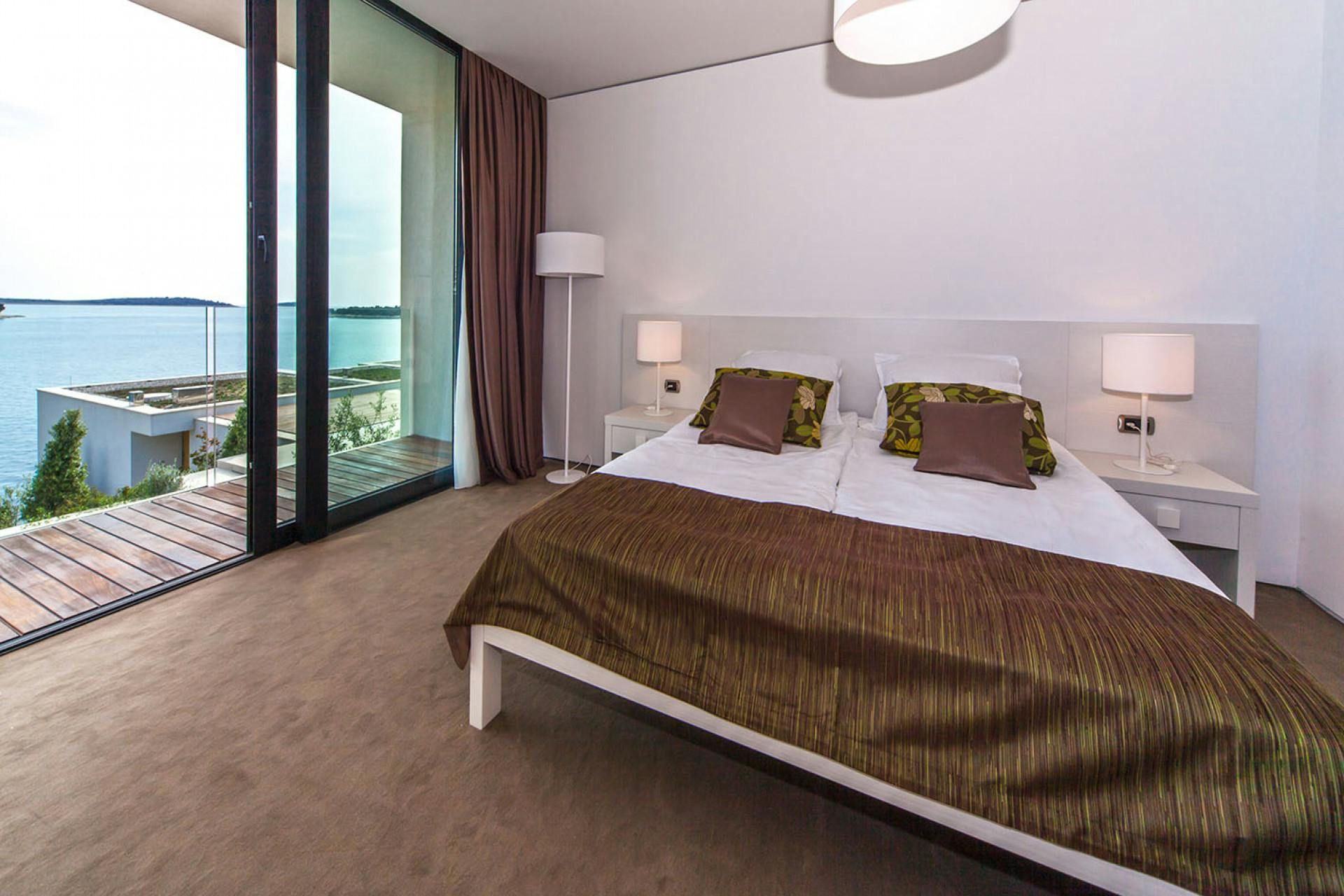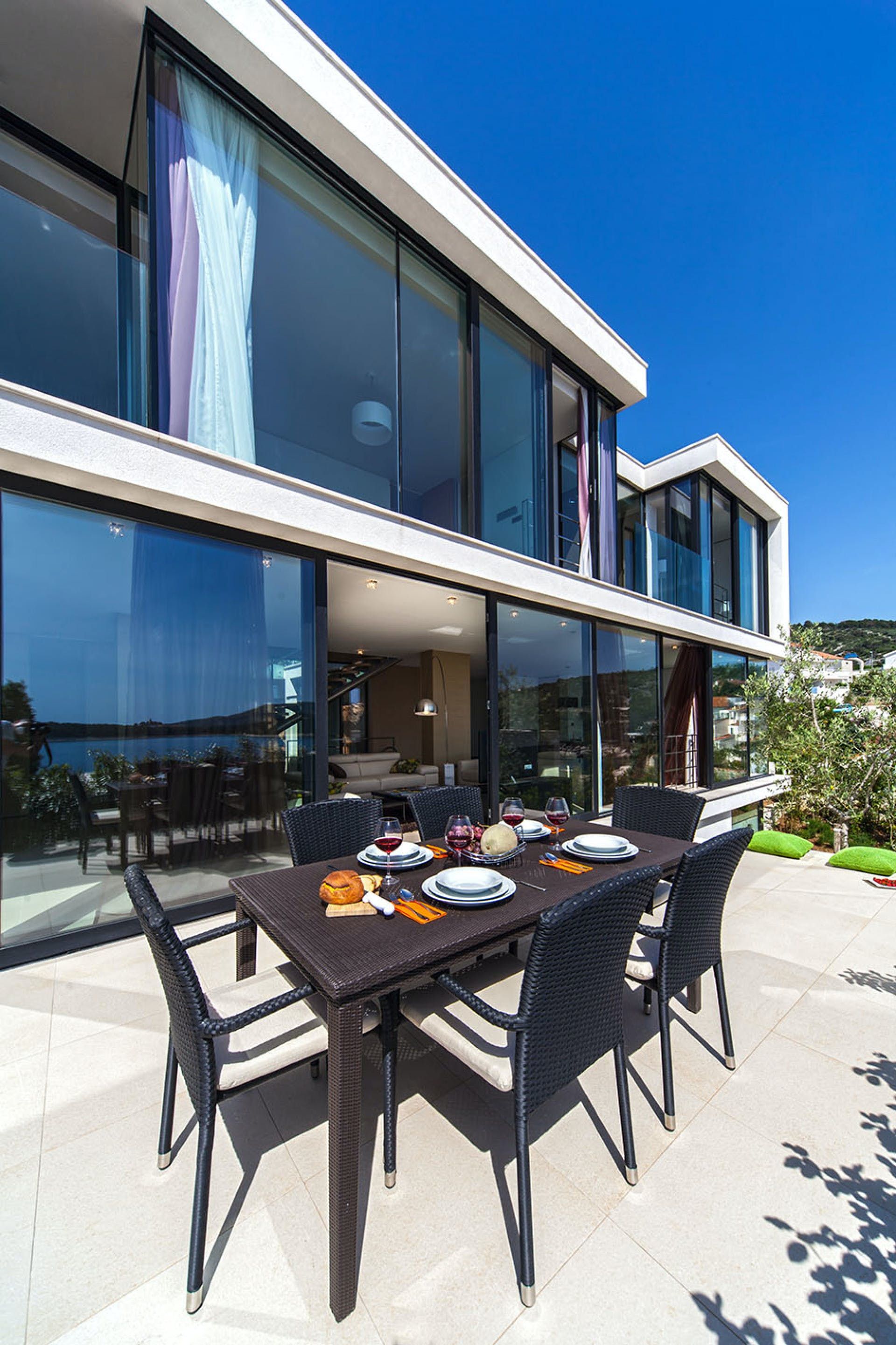 Experience luxury and exclusivity at this home in Primosten. With 380 m² of living space, this modern villa features a 16 m² indoor pool and panoramic windows offering stunning sea views. Relax on the loungers by the pool or dine alfresco on the open terrace with a mobile grill at your disposal. The villa's interior is stylishly designed with white and light brown tones, clear lines and quality furnishings, including a cosy mezzanine-level living room. There are three elegantly appointed bedrooms with exquisite en suite bathrooms and French balconies. The upper hallway opens out to a glass terrace with breathtaking sea views. On the lower level, guests can enjoy a sauna with shower and an indoor bike for fitness enthusiasts. The resort property is fenced and video monitored, offering various services such as airport transfers, cleaning or breakfast service, bike rentals and excursion offers. Explore nearby attractions such as Trogir (34 km), Split (61 km), Šibenik (29 km) and UNESCO World Heritage Site Sveti Cathedral in Šibenik.