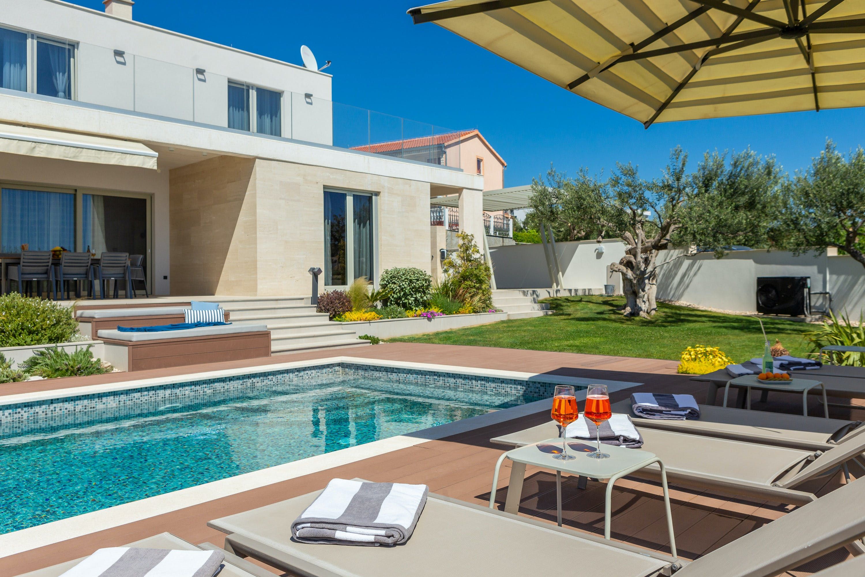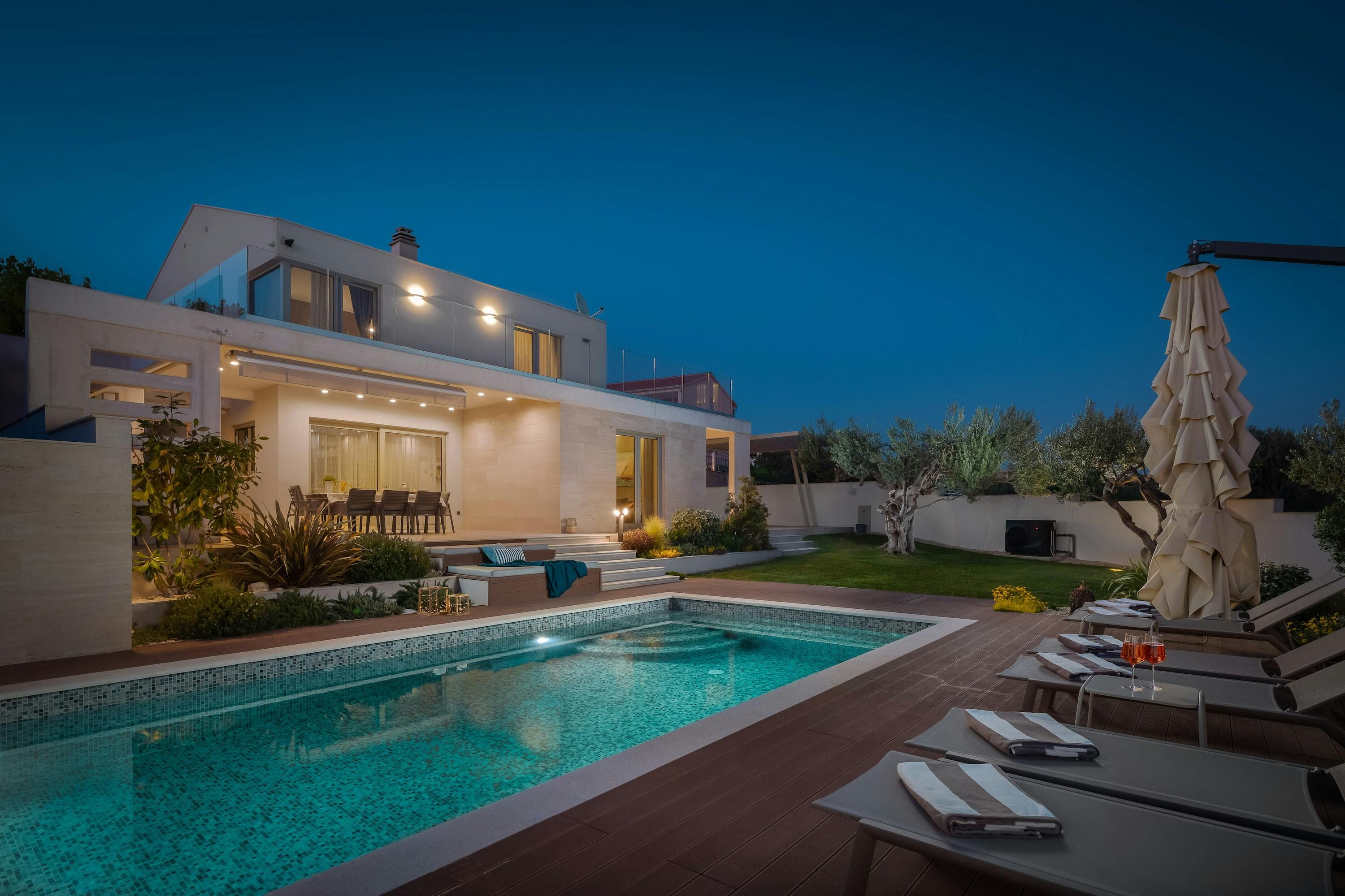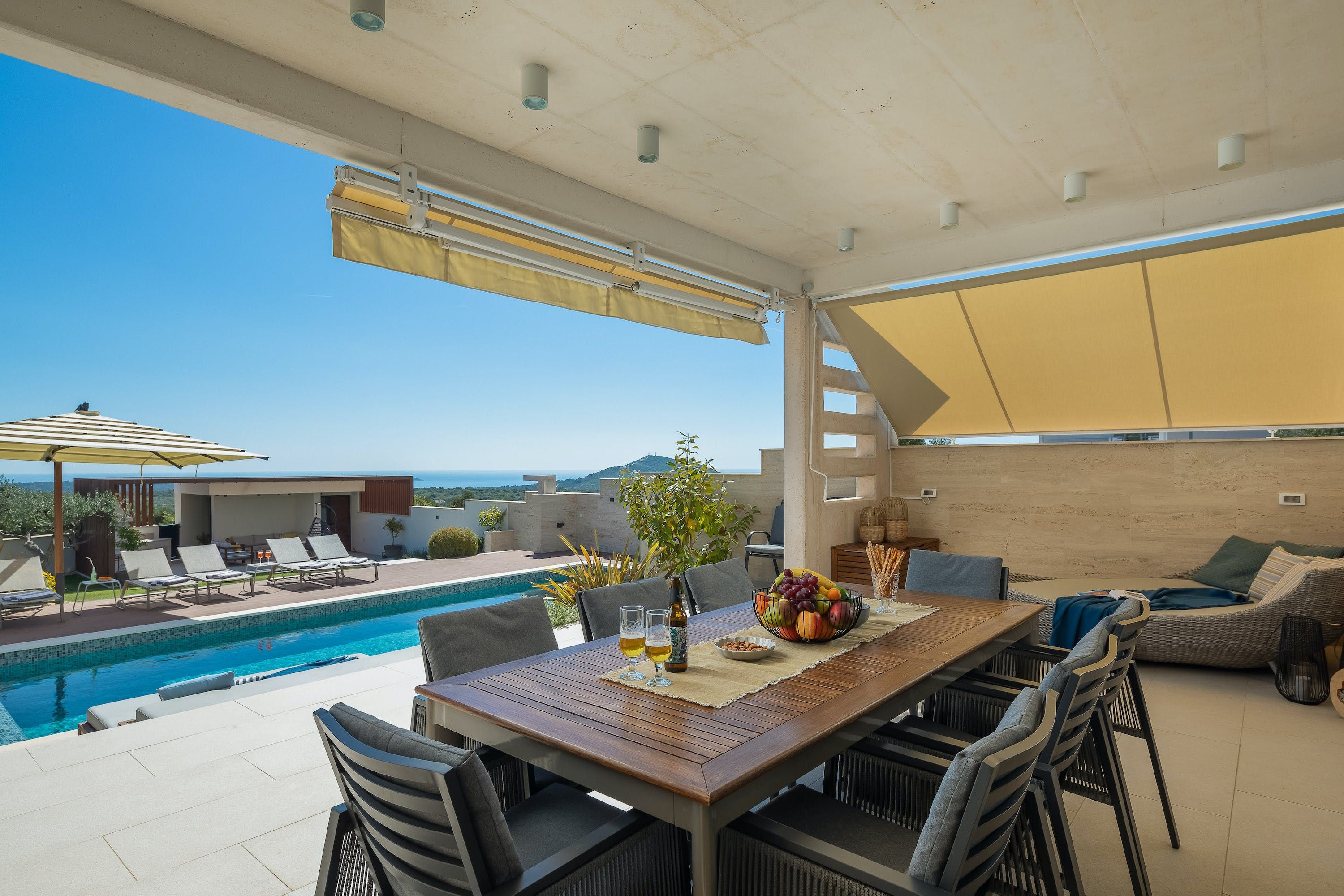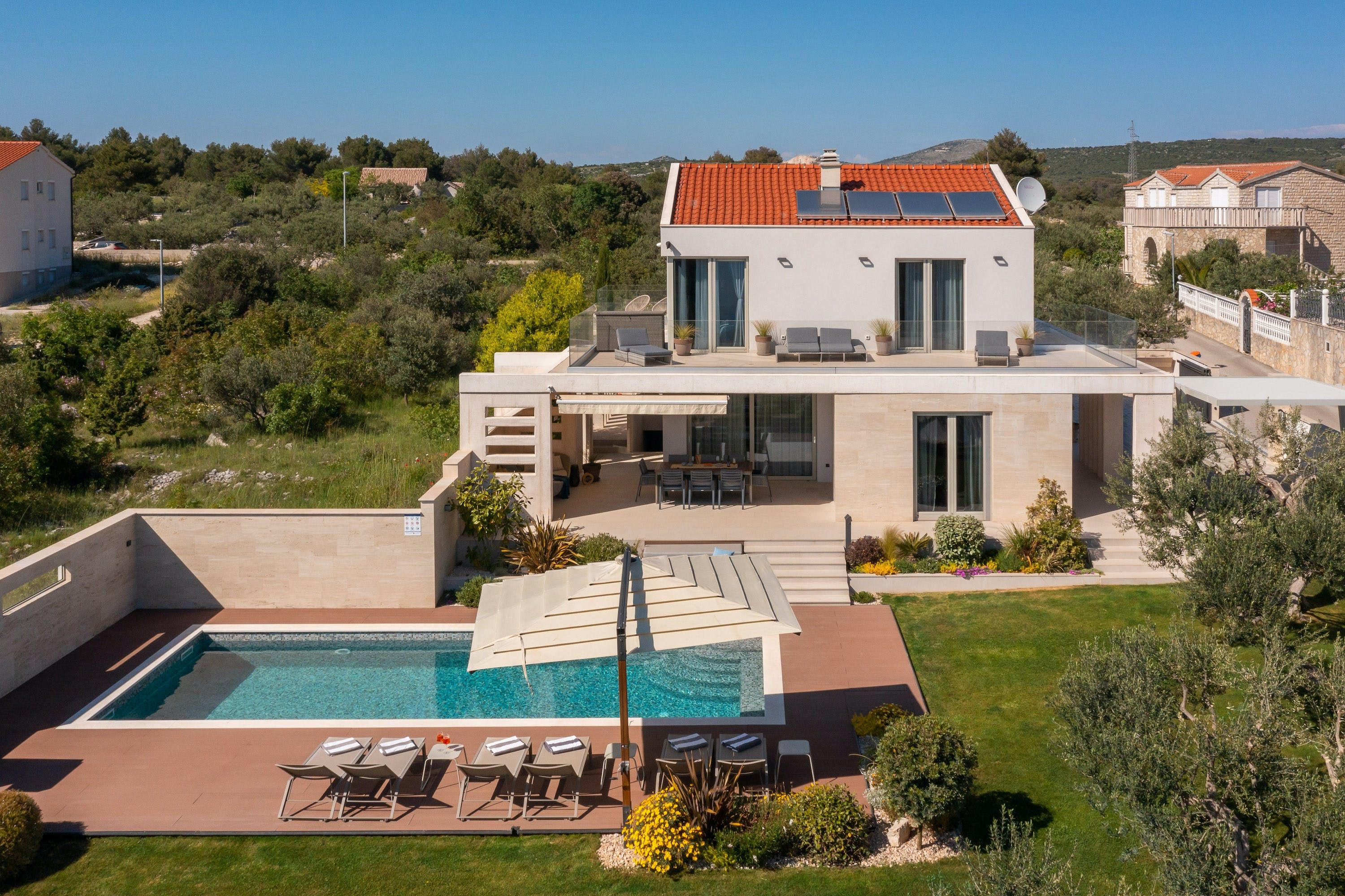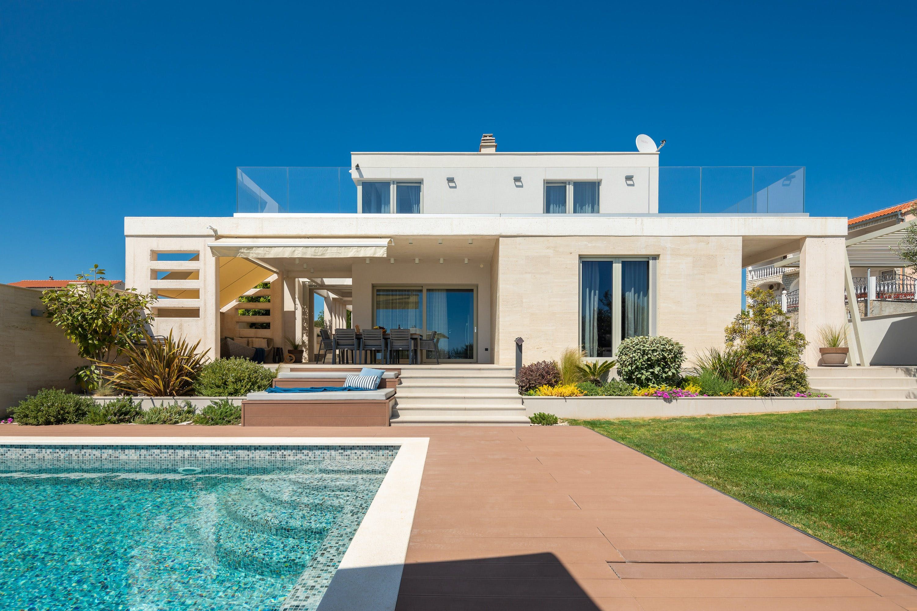 This home is a luxurious villa that offers maritime flair with its white and blue decor, airy fabrics, and distant sea view. The 10m heated pool with surrounding sun terrace and lawn is the heart of the garden, perfect for relaxation on a lounger. The separate lounge corner provides privacy for small groups, while the covered terrace offers a great view of the pool and distant sea. The villa's modern living area has an open-plan design with various niches for privacy. The living-dining room with adjoining kitchen is perfect for indoor relaxation, while the top-modern kitchen is equipped first class for self-catering. The villa has four elegant en-suite bedrooms located on the upper floor, each with high-quality amenities. With TV, sound system, internet, safe, air conditioning, heating, and other impressive amenities, the home is a perfect vacation home in Croatia for eight adults and two children.