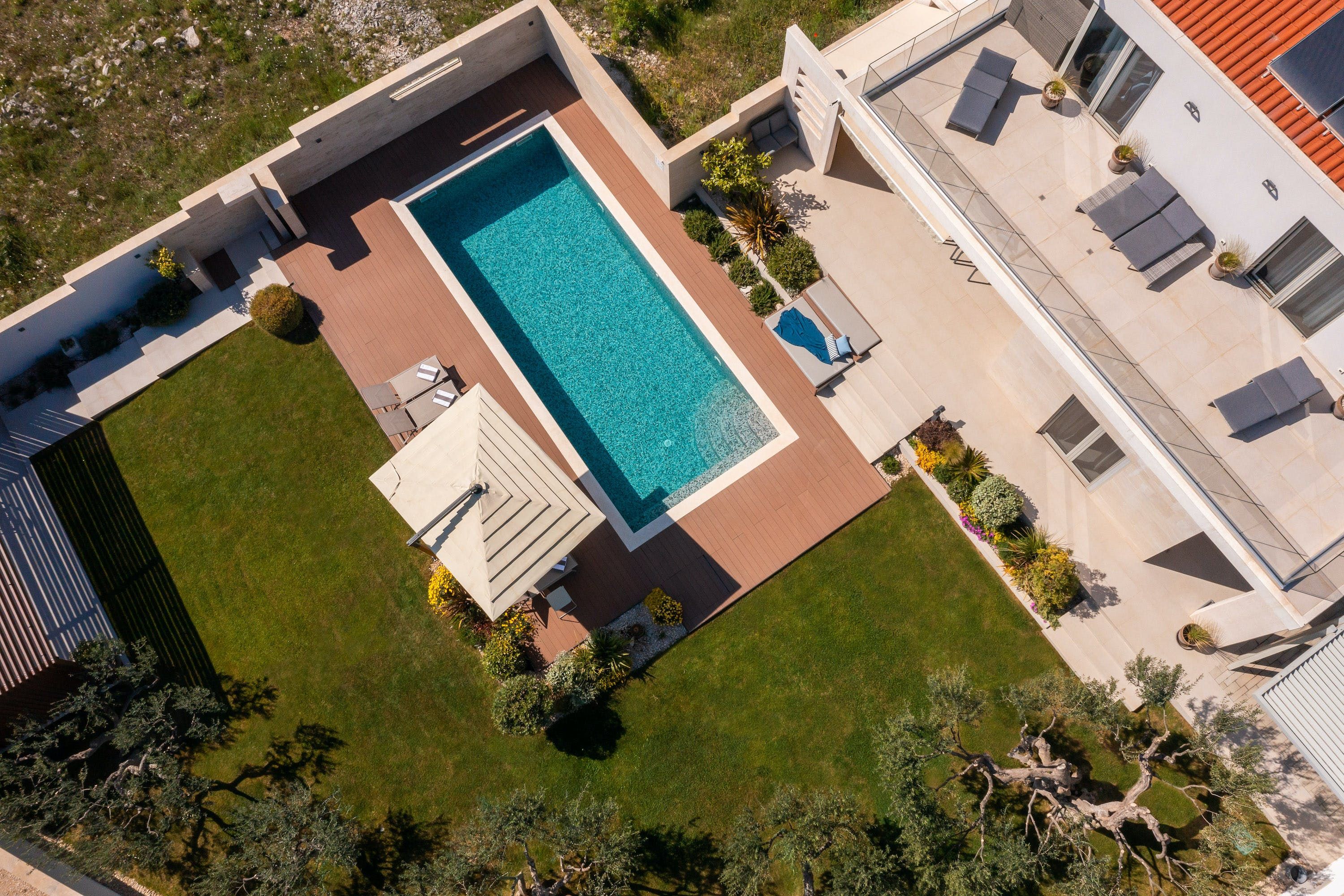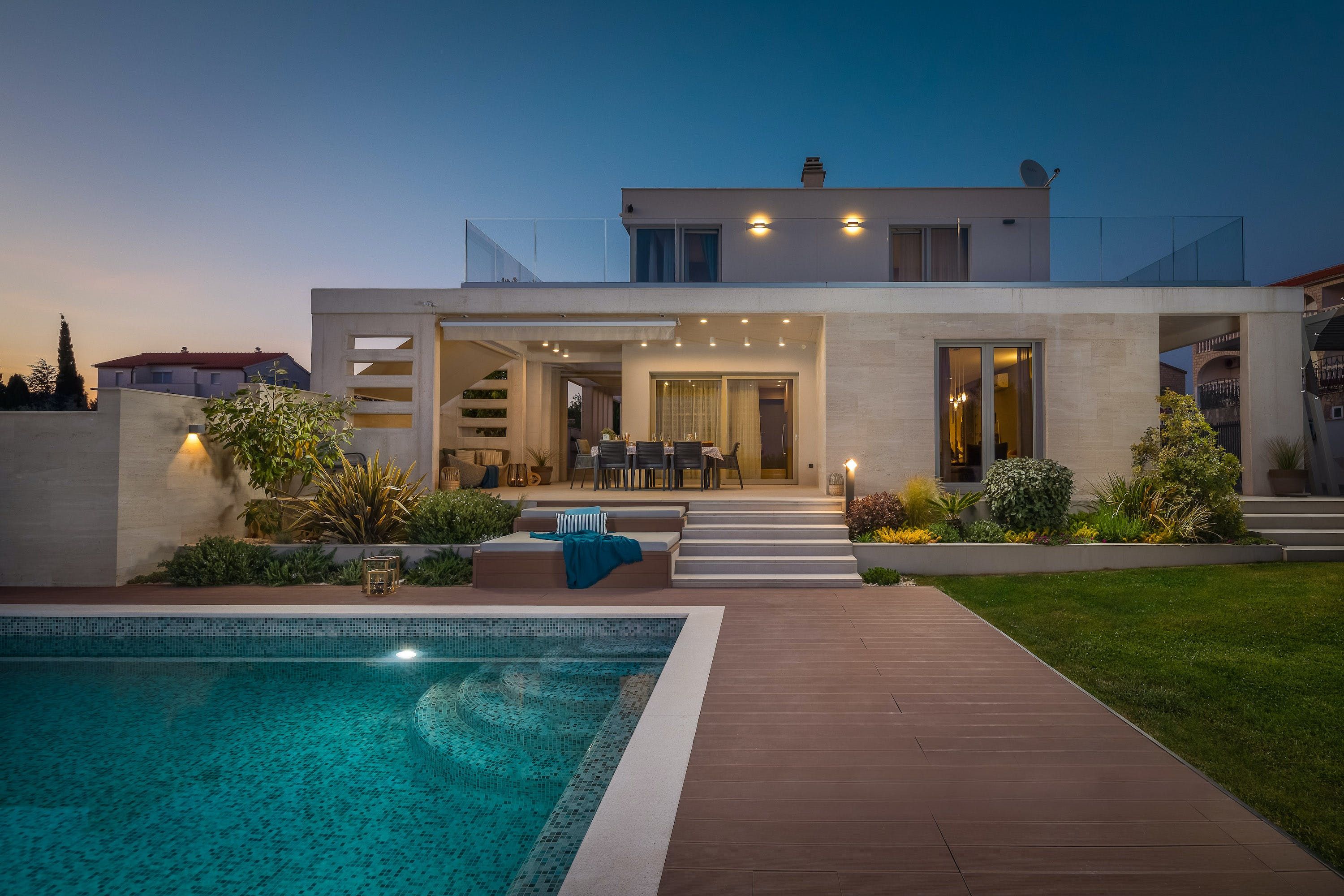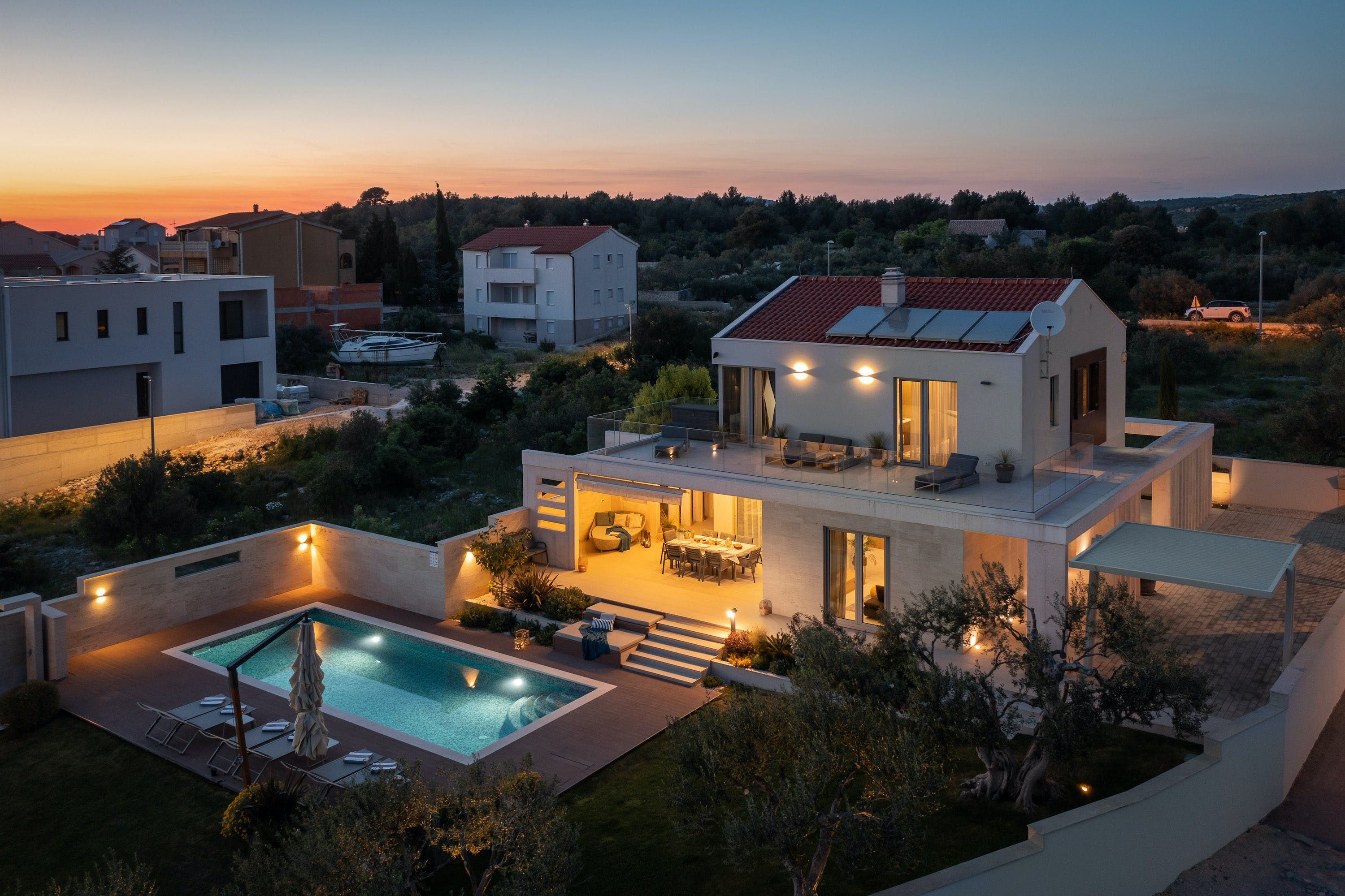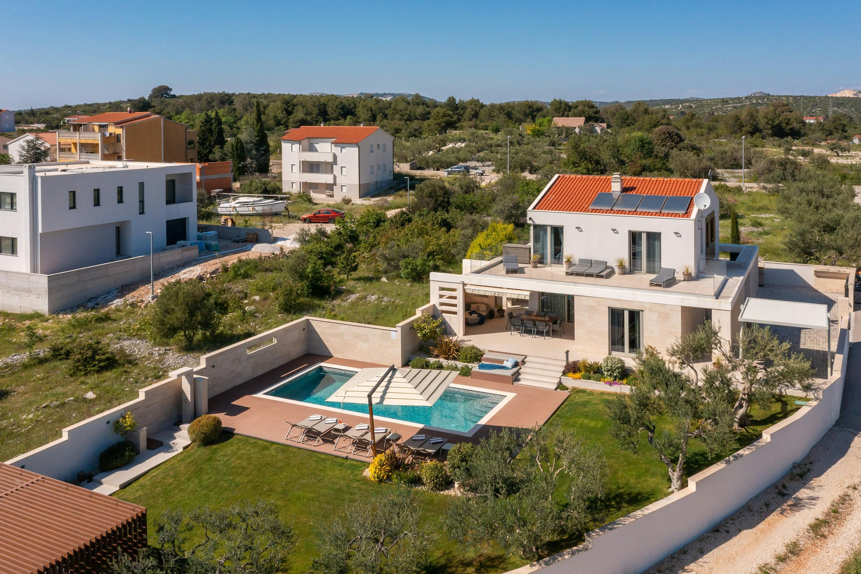This home is a luxurious villa that offers maritime flair with its white and blue decor, airy fabrics, and distant sea view. The 10m heated pool with surrounding sun terrace and lawn is the heart of the garden, perfect for relaxation on a lounger. The separate lounge corner provides privacy for small groups, while the covered terrace offers a great view of the pool and distant sea. The villa's modern living area has an open-plan design with various niches for privacy. The living-dining room with adjoining kitchen is perfect for indoor relaxation, while the top-modern kitchen is equipped first class for self-catering. The villa has four elegant en-suite bedrooms located on the upper floor, each with high-quality amenities. With TV, sound system, internet, safe, air conditioning, heating, and other impressive amenities, the home is a perfect vacation home in Croatia for eight adults and two children.