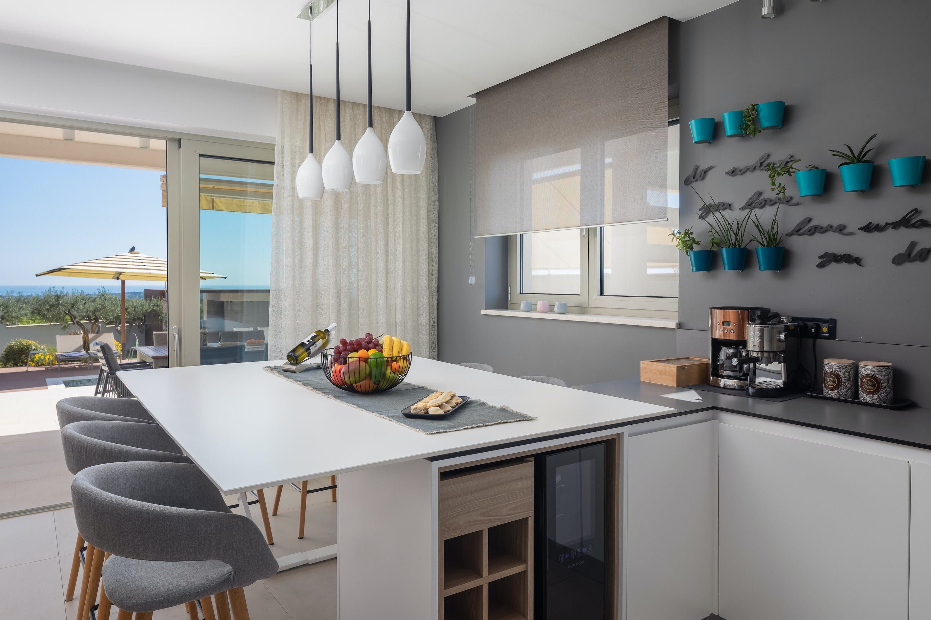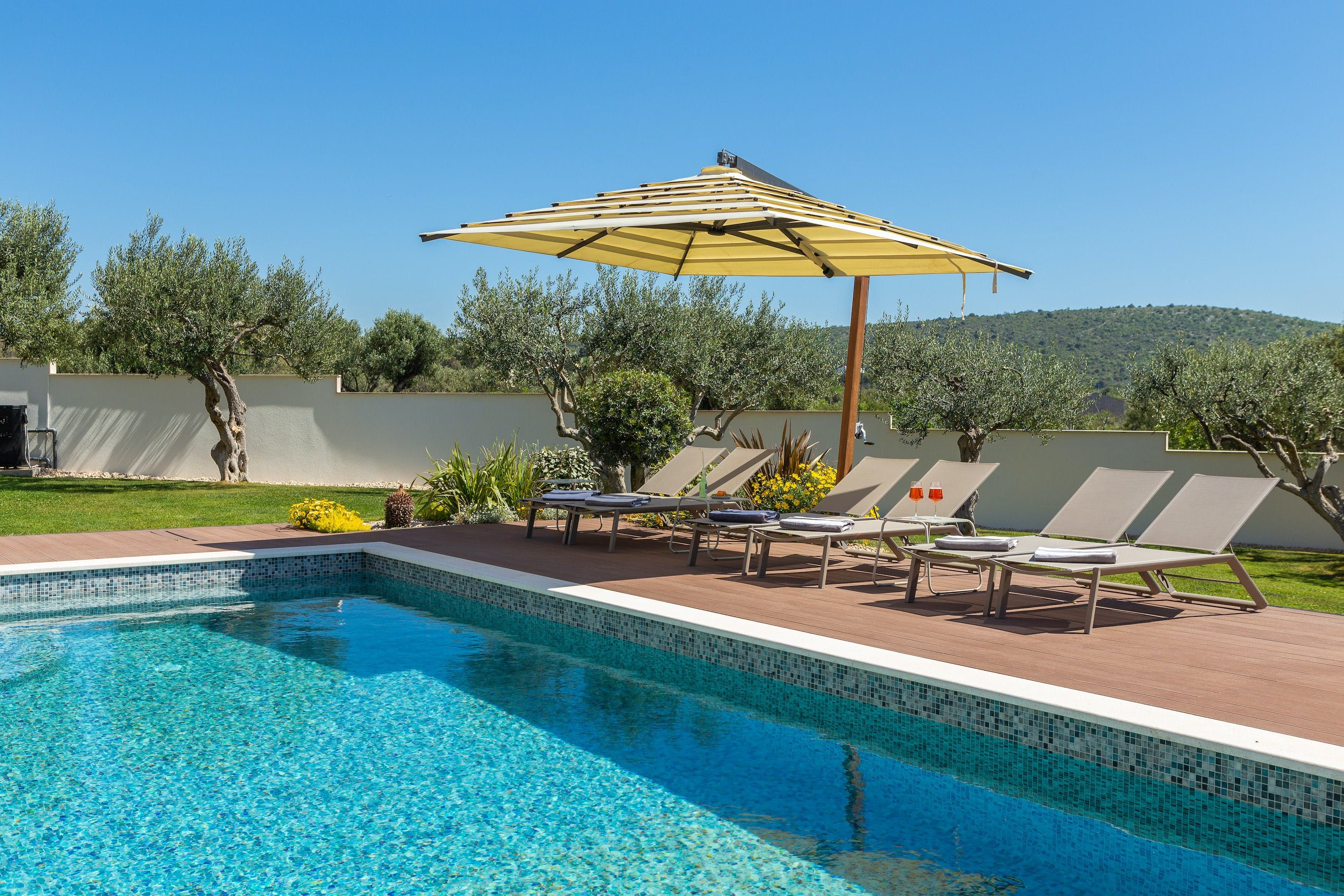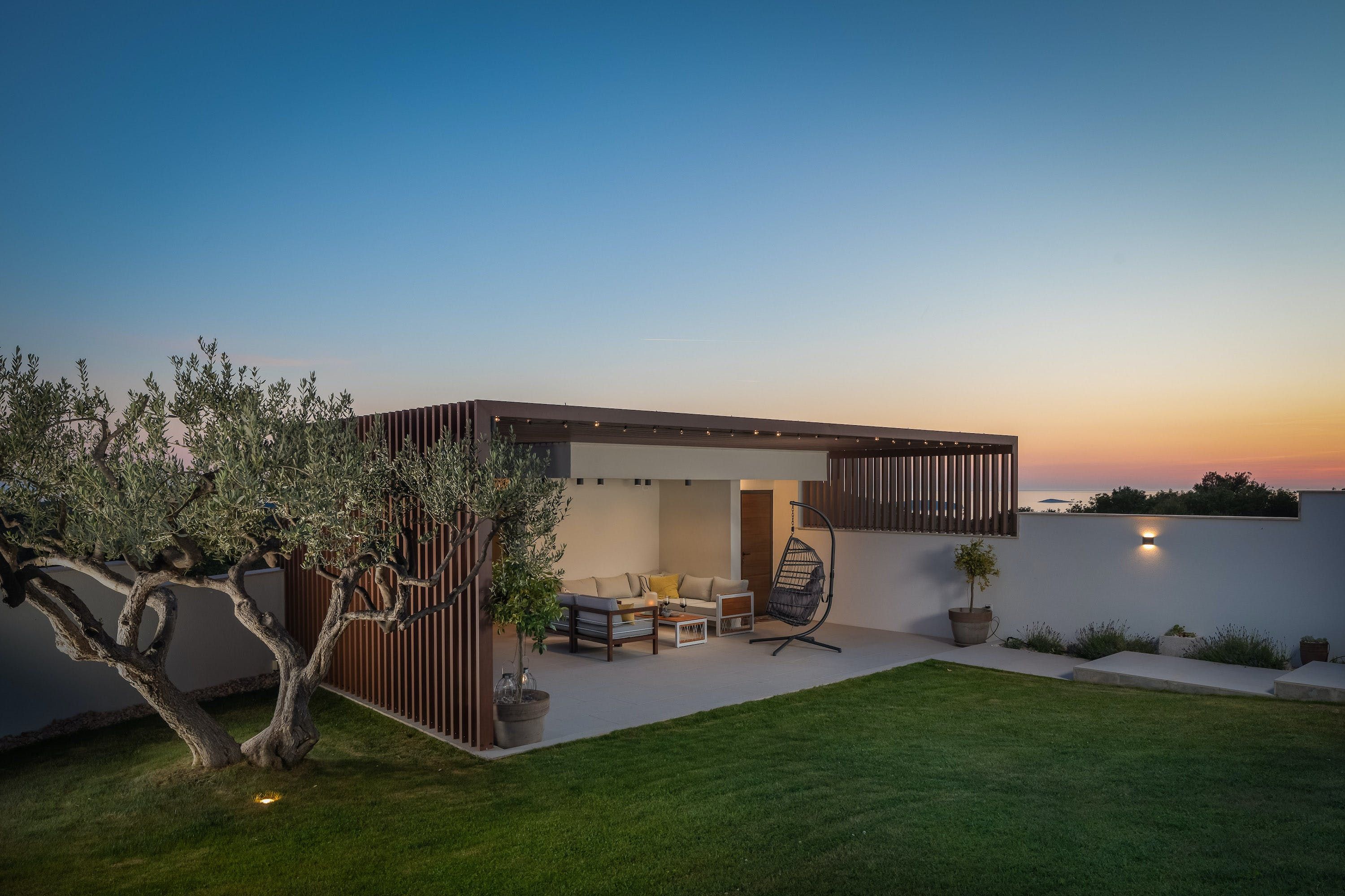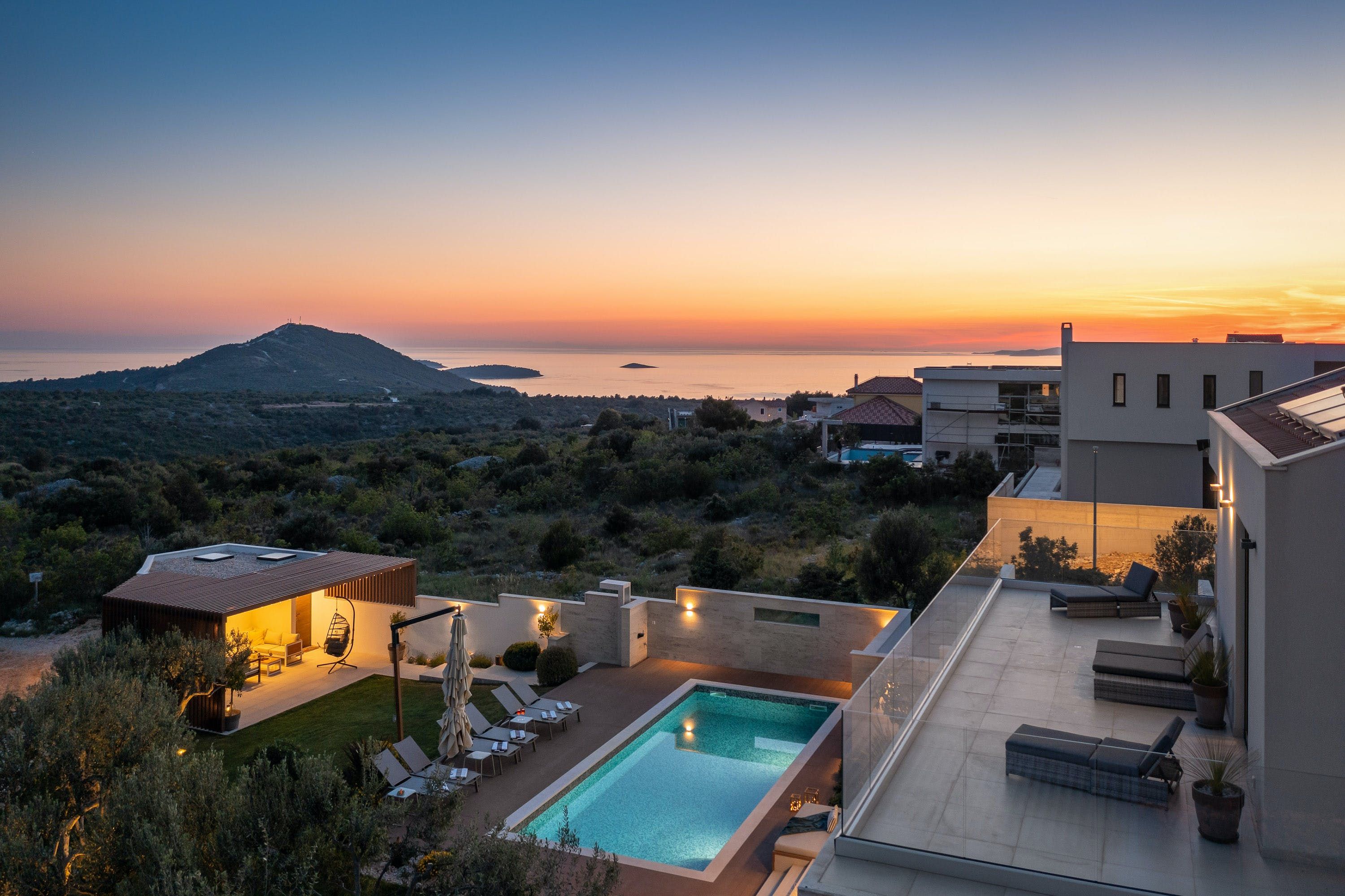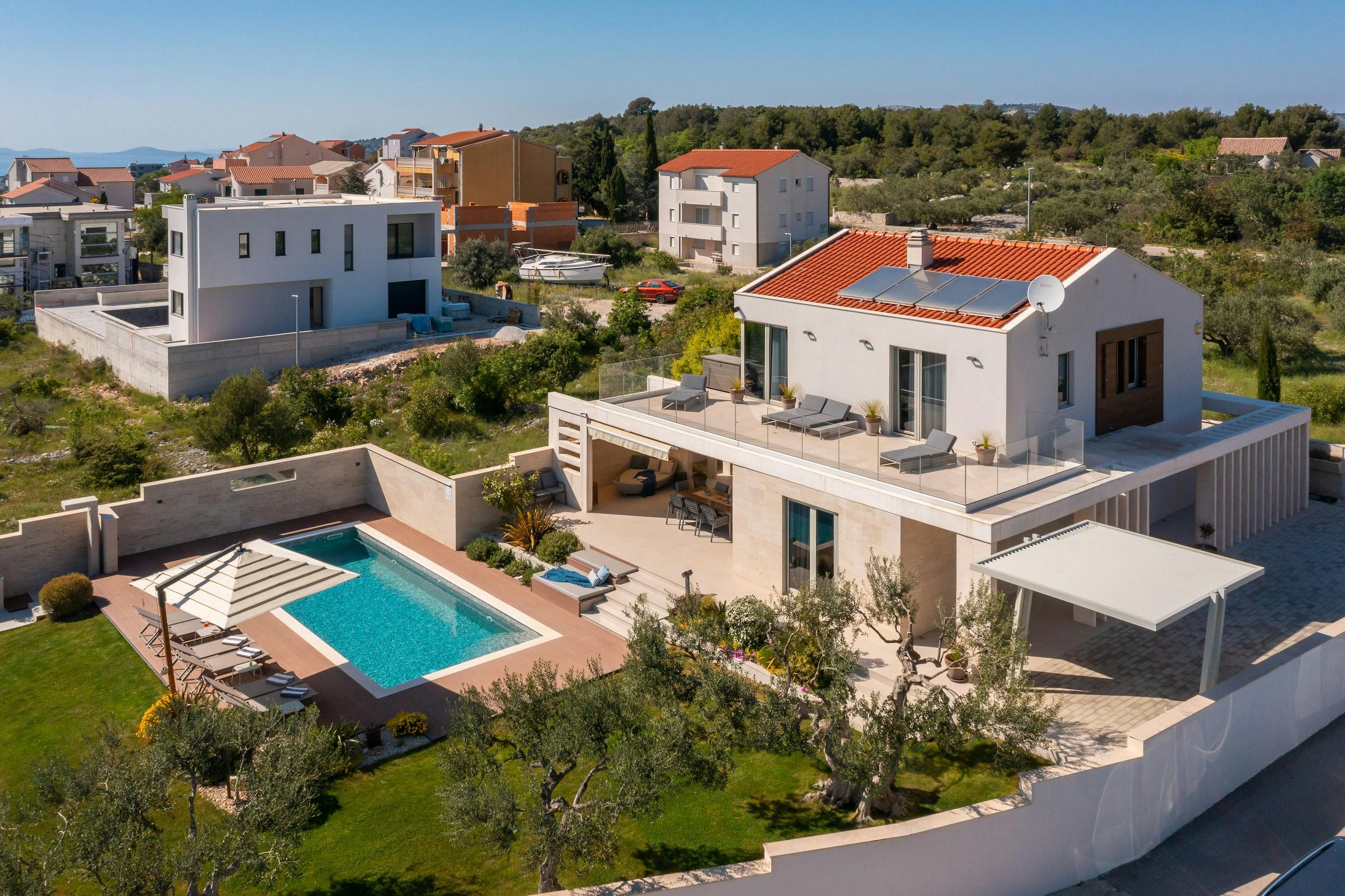 This home is a luxurious villa that offers maritime flair with its white and blue decor, airy fabrics, and distant sea view. The 10m heated pool with surrounding sun terrace and lawn is the heart of the garden, perfect for relaxation on a lounger. The separate lounge corner provides privacy for small groups, while the covered terrace offers a great view of the pool and distant sea. The villa's modern living area has an open-plan design with various niches for privacy. The living-dining room with adjoining kitchen is perfect for indoor relaxation, while the top-modern kitchen is equipped first class for self-catering. The villa has four elegant en-suite bedrooms located on the upper floor, each with high-quality amenities. With TV, sound system, internet, safe, air conditioning, heating, and other impressive amenities, the home is a perfect vacation home in Croatia for eight adults and two children.