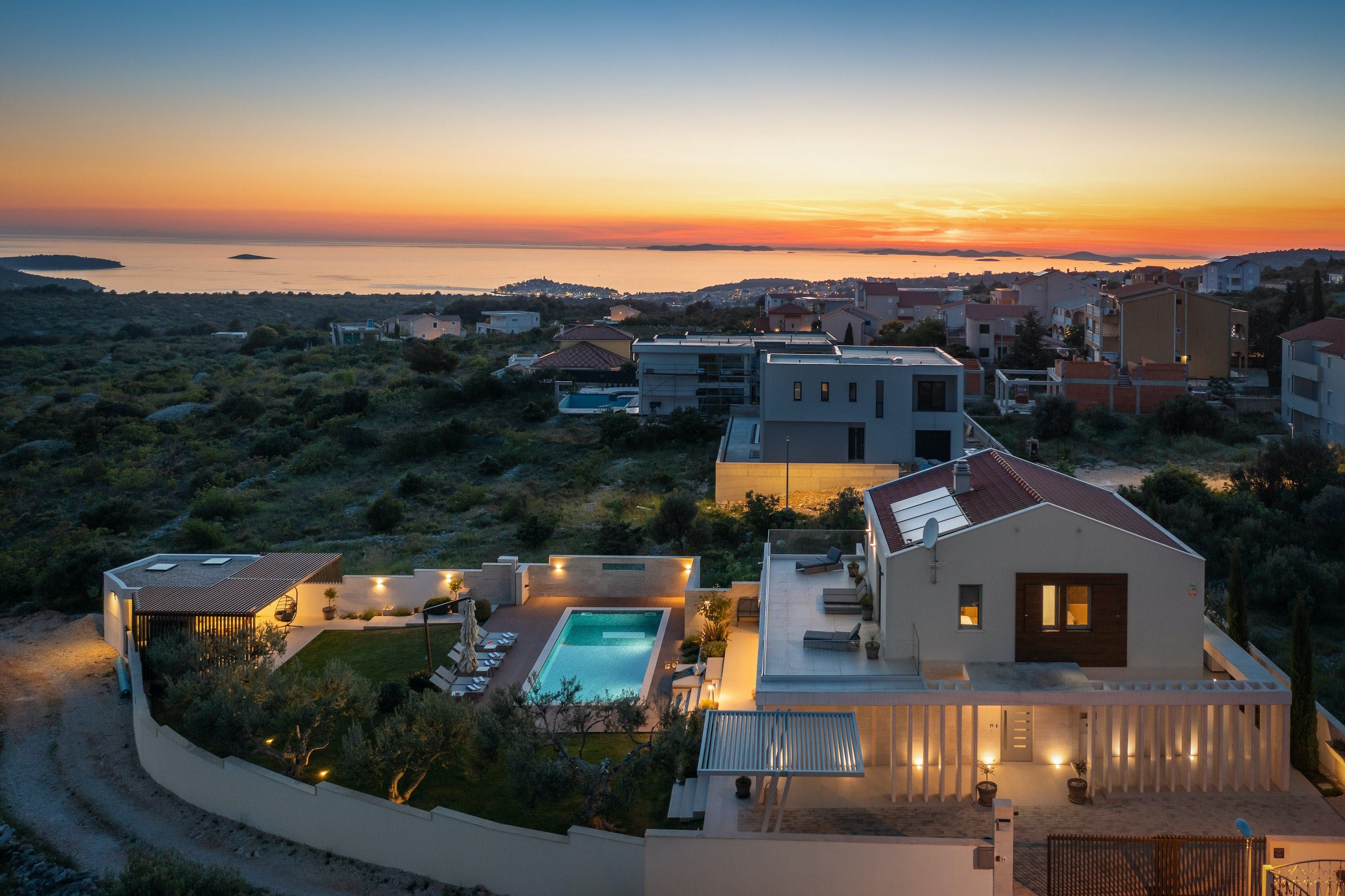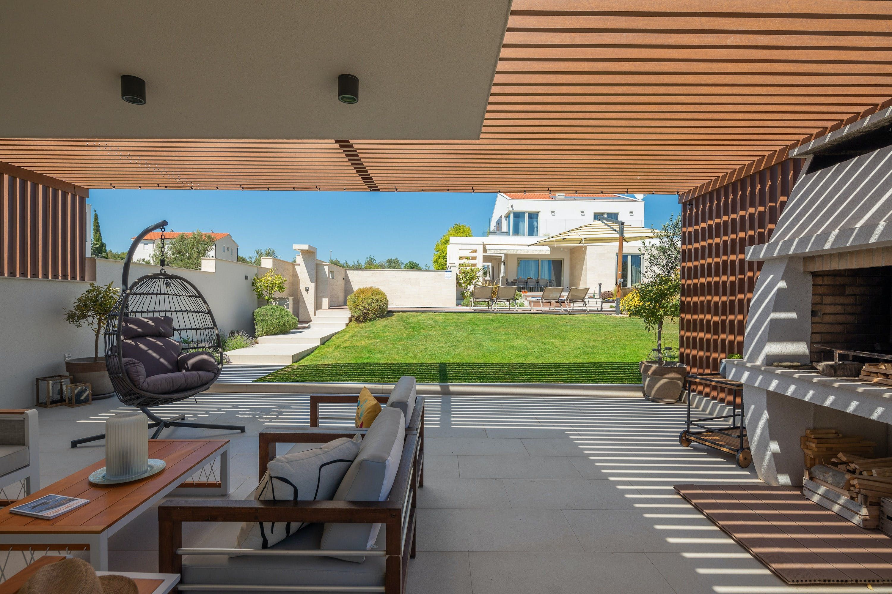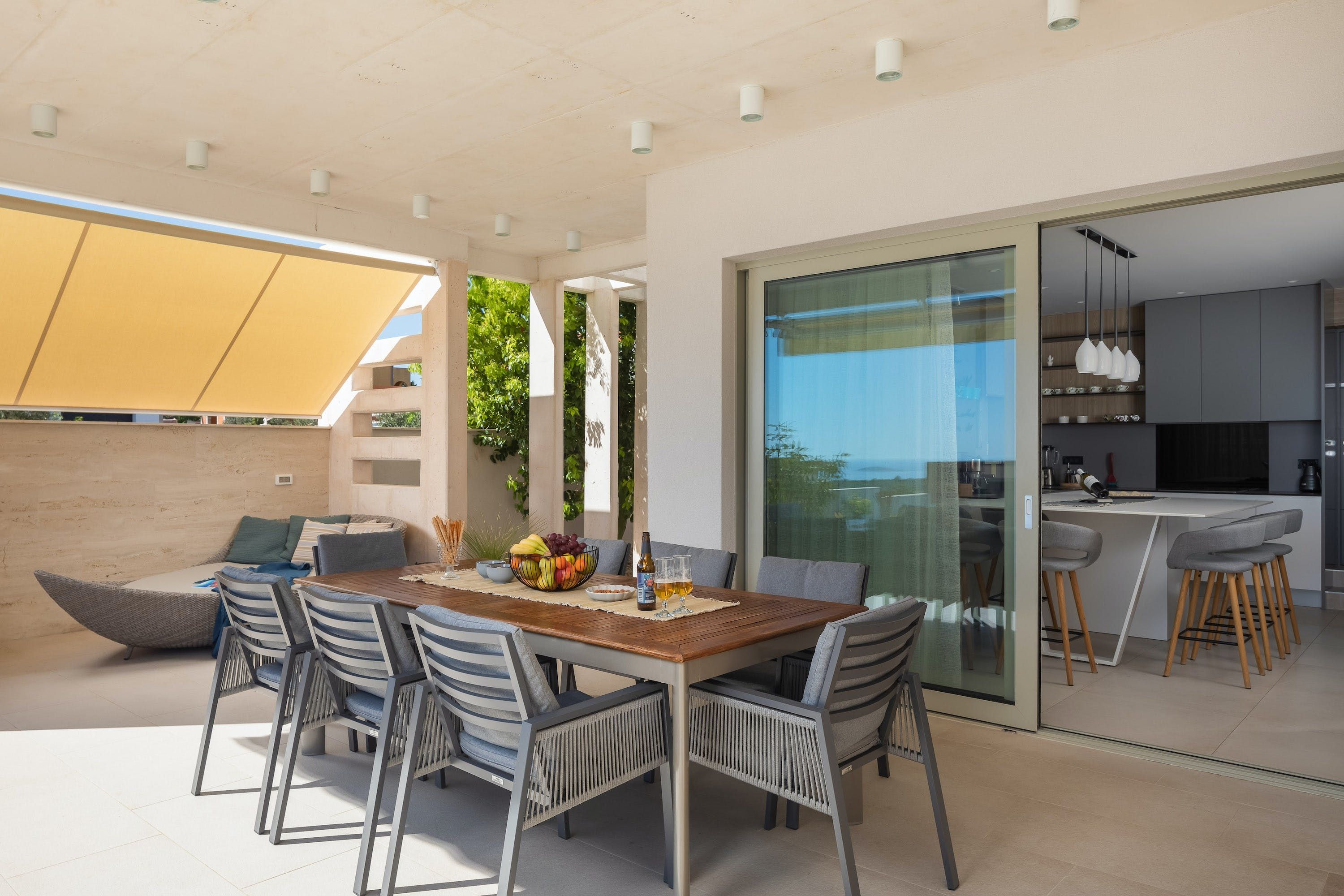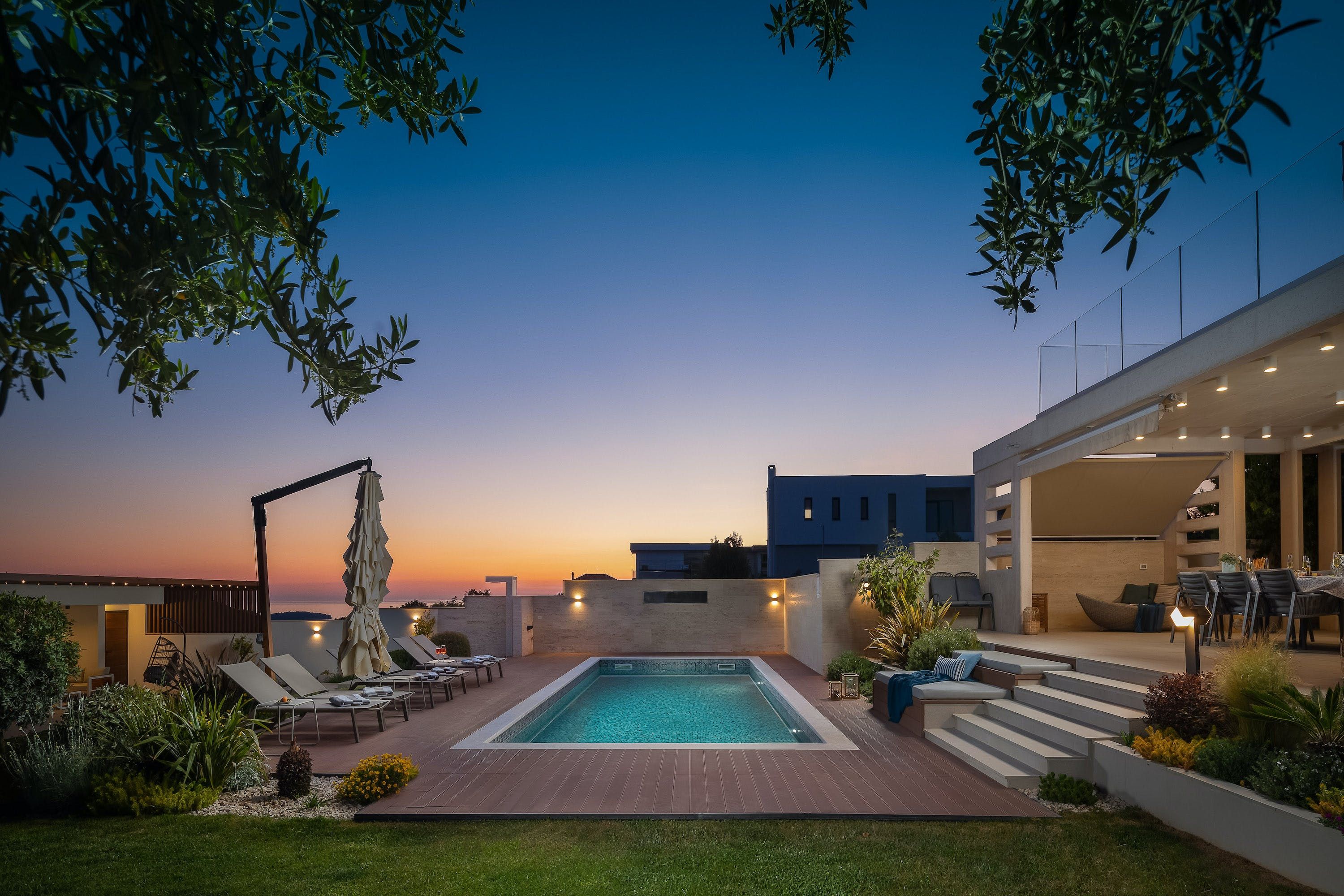 This home is a luxurious villa that offers maritime flair with its white and blue decor, airy fabrics, and distant sea view. The 10m heated pool with surrounding sun terrace and lawn is the heart of the garden, perfect for relaxation on a lounger. The separate lounge corner provides privacy for small groups, while the covered terrace offers a great view of the pool and distant sea. The villa's modern living area has an open-plan design with various niches for privacy. The living-dining room with adjoining kitchen is perfect for indoor relaxation, while the top-modern kitchen is equipped first class for self-catering. The villa has four elegant en-suite bedrooms located on the upper floor, each with high-quality amenities. With TV, sound system, internet, safe, air conditioning, heating, and other impressive amenities, the home is a perfect vacation home in Croatia for eight adults and two children.