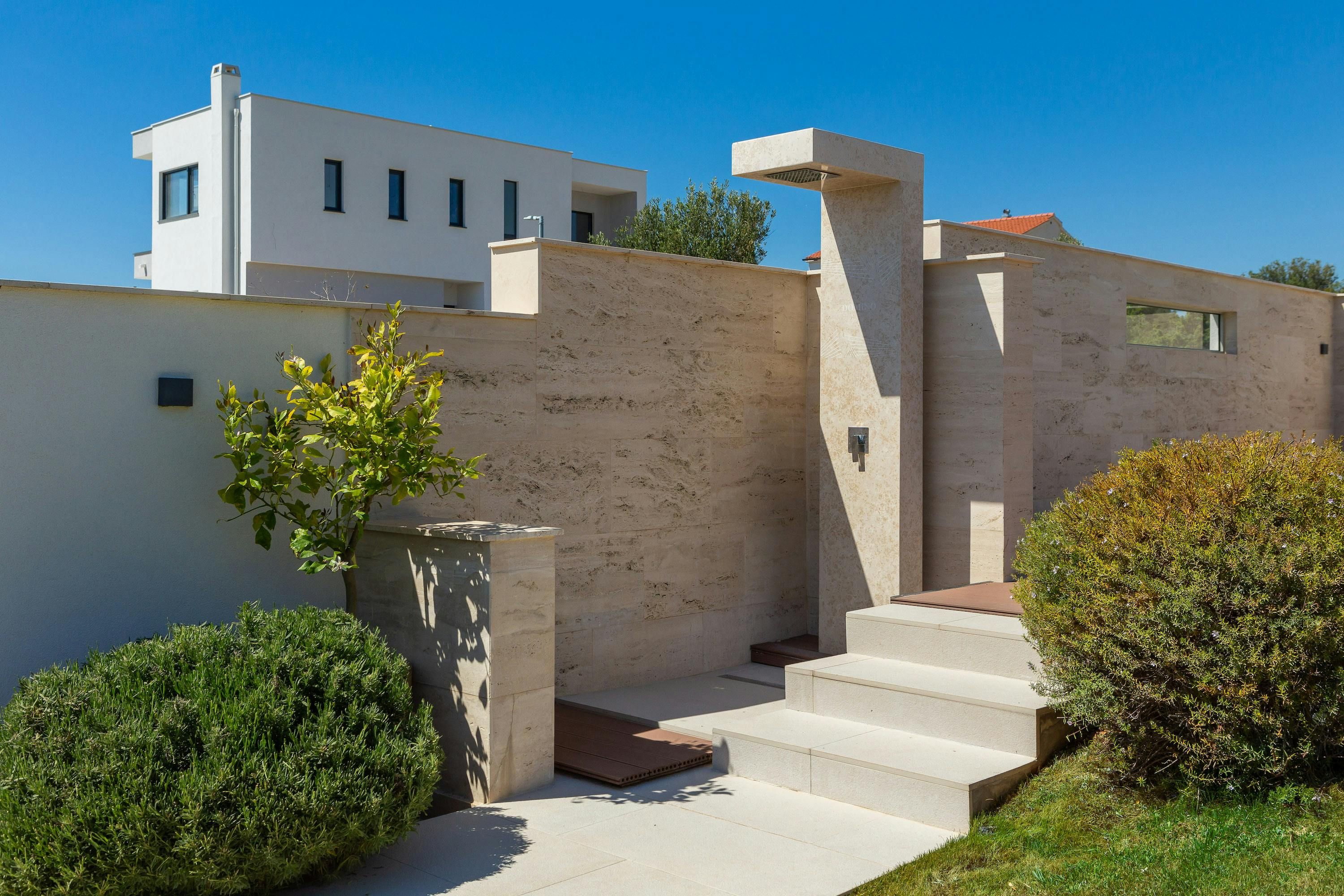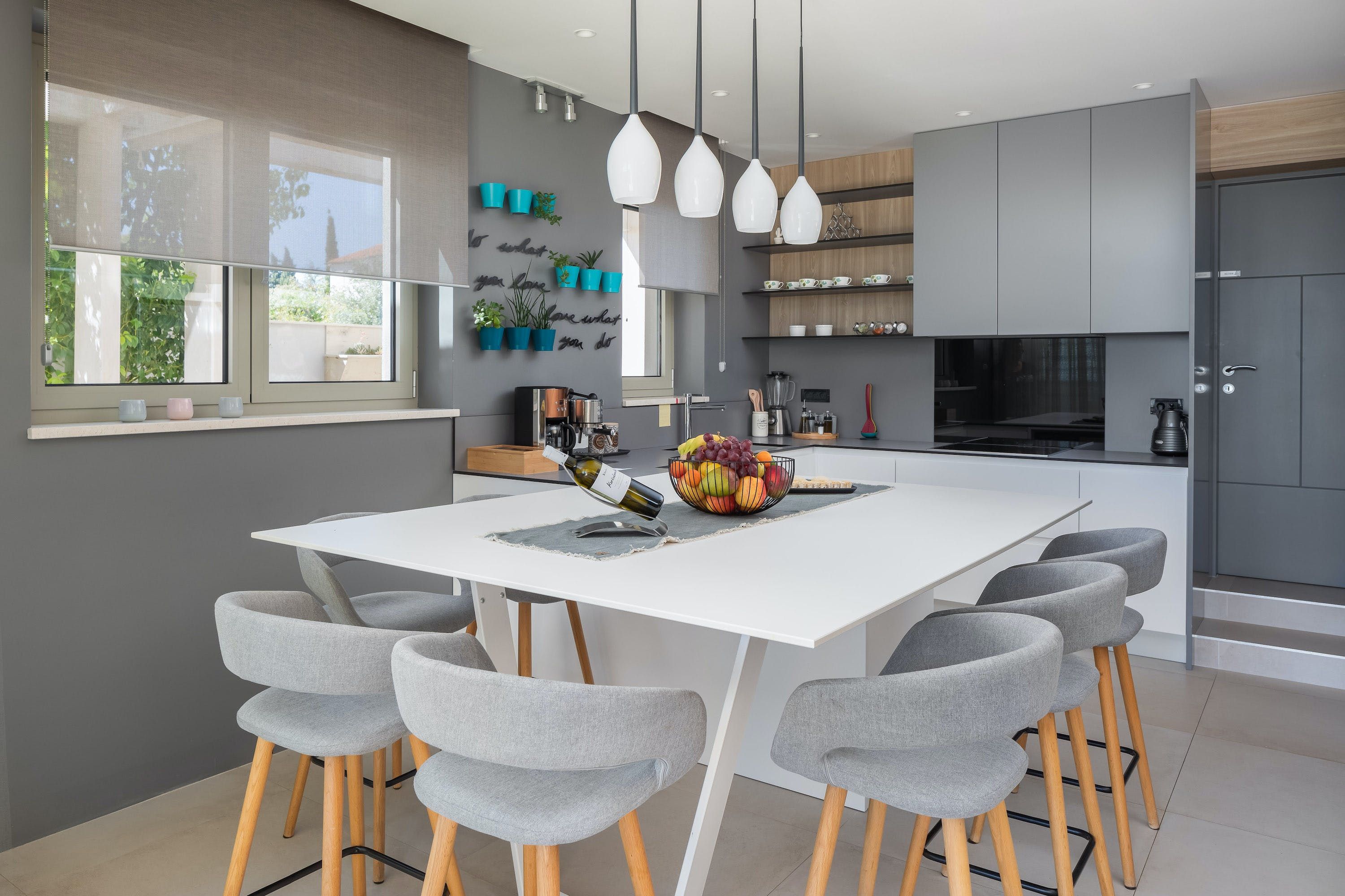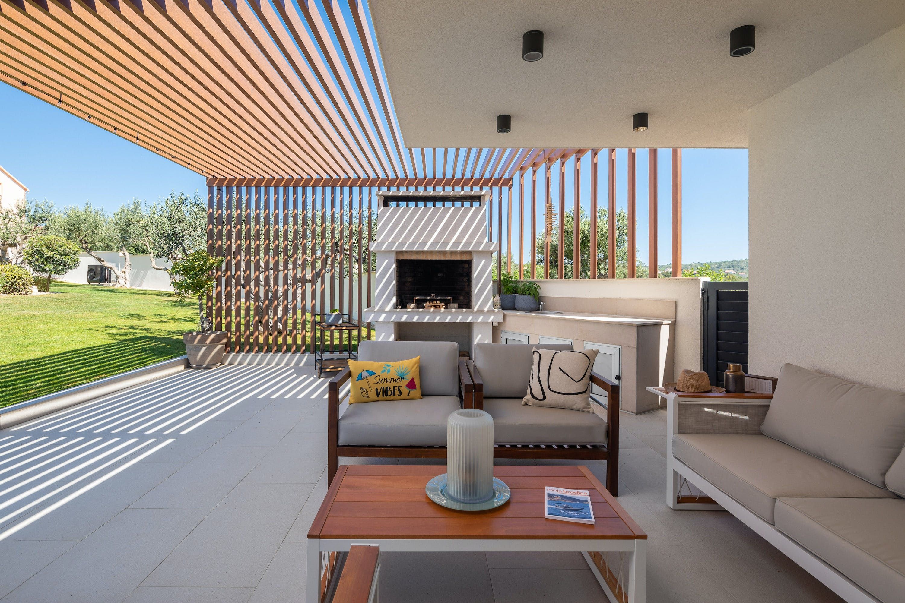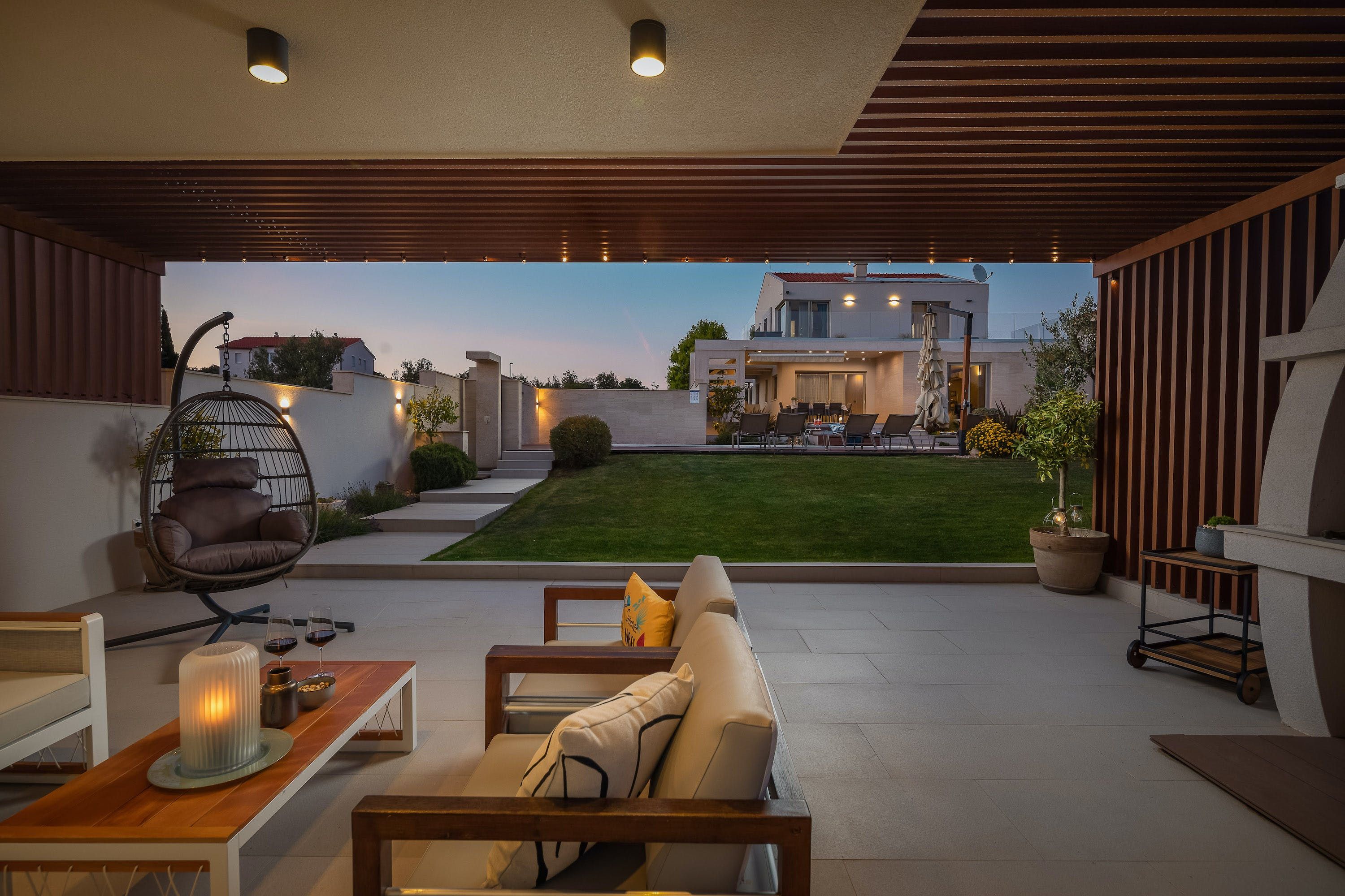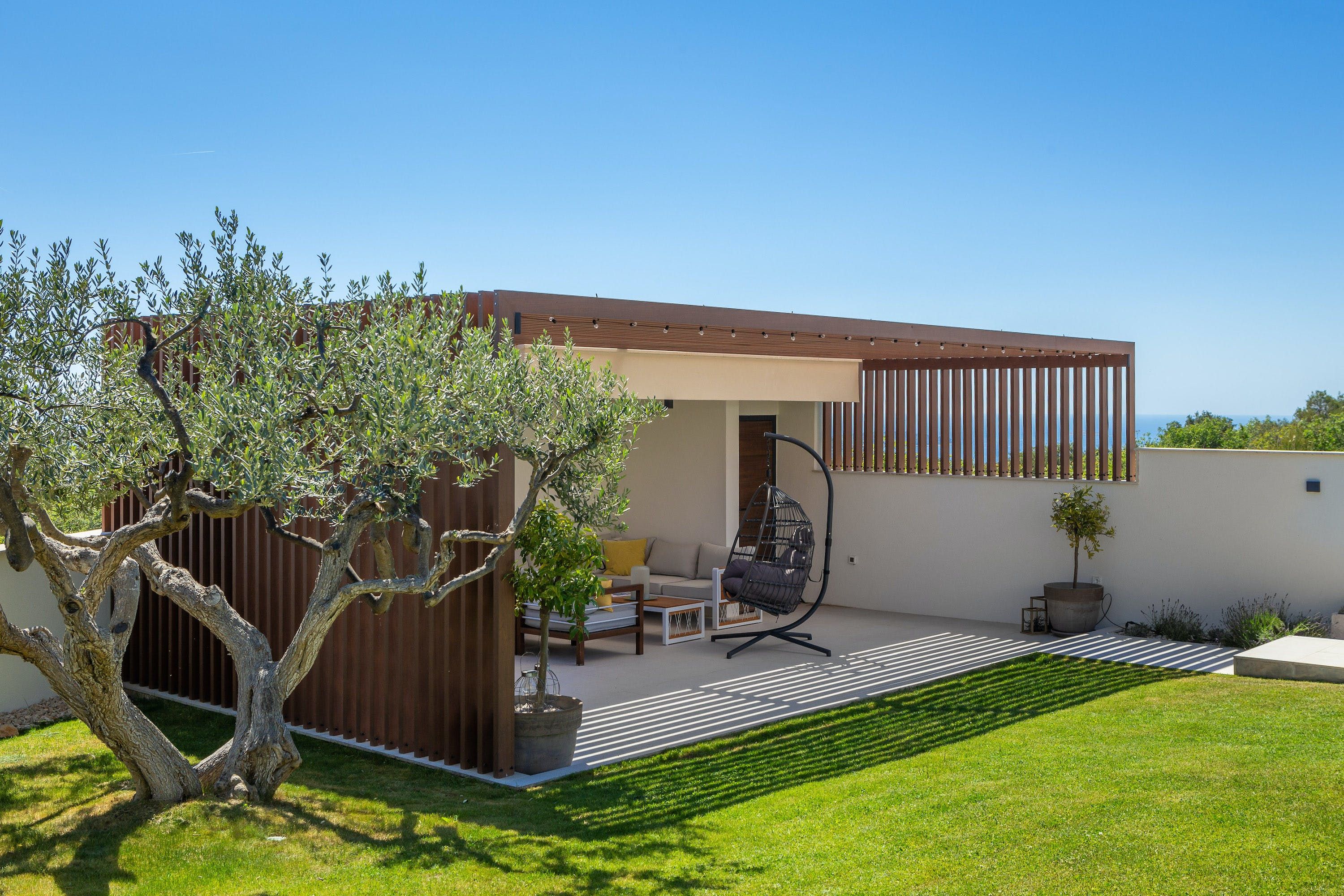 This home is a luxurious villa that offers maritime flair with its white and blue decor, airy fabrics, and distant sea view. The 10m heated pool with surrounding sun terrace and lawn is the heart of the garden, perfect for relaxation on a lounger. The separate lounge corner provides privacy for small groups, while the covered terrace offers a great view of the pool and distant sea. The villa's modern living area has an open-plan design with various niches for privacy. The living-dining room with adjoining kitchen is perfect for indoor relaxation, while the top-modern kitchen is equipped first class for self-catering. The villa has four elegant en-suite bedrooms located on the upper floor, each with high-quality amenities. With TV, sound system, internet, safe, air conditioning, heating, and other impressive amenities, the home is a perfect vacation home in Croatia for eight adults and two children.