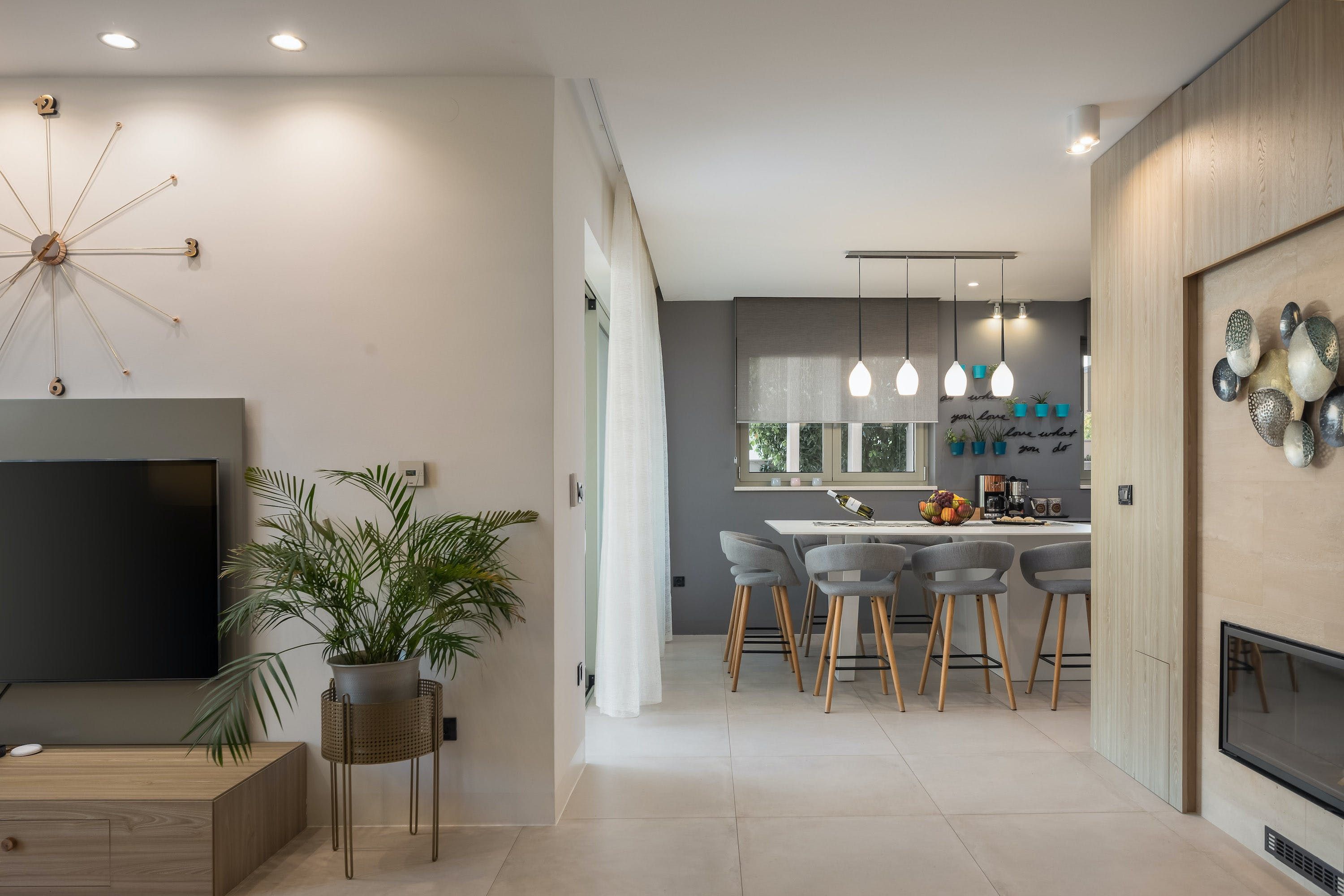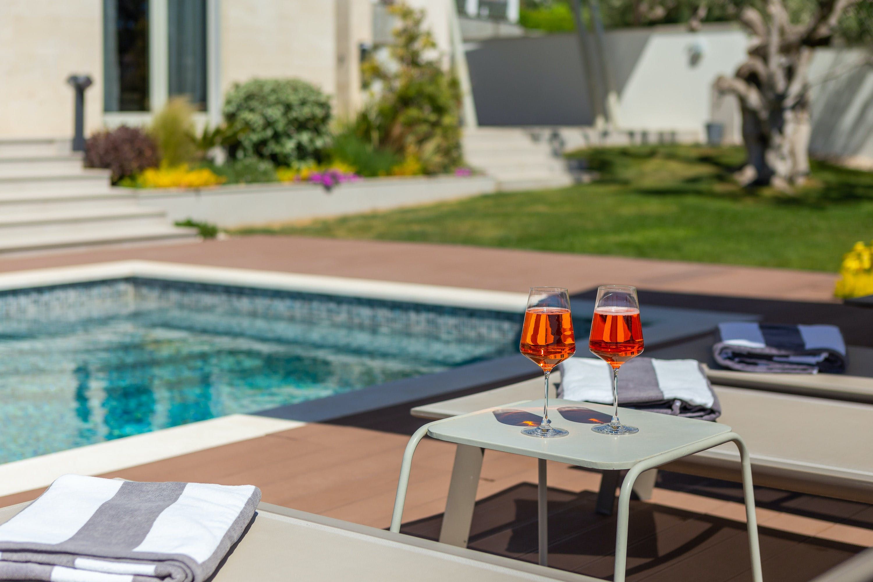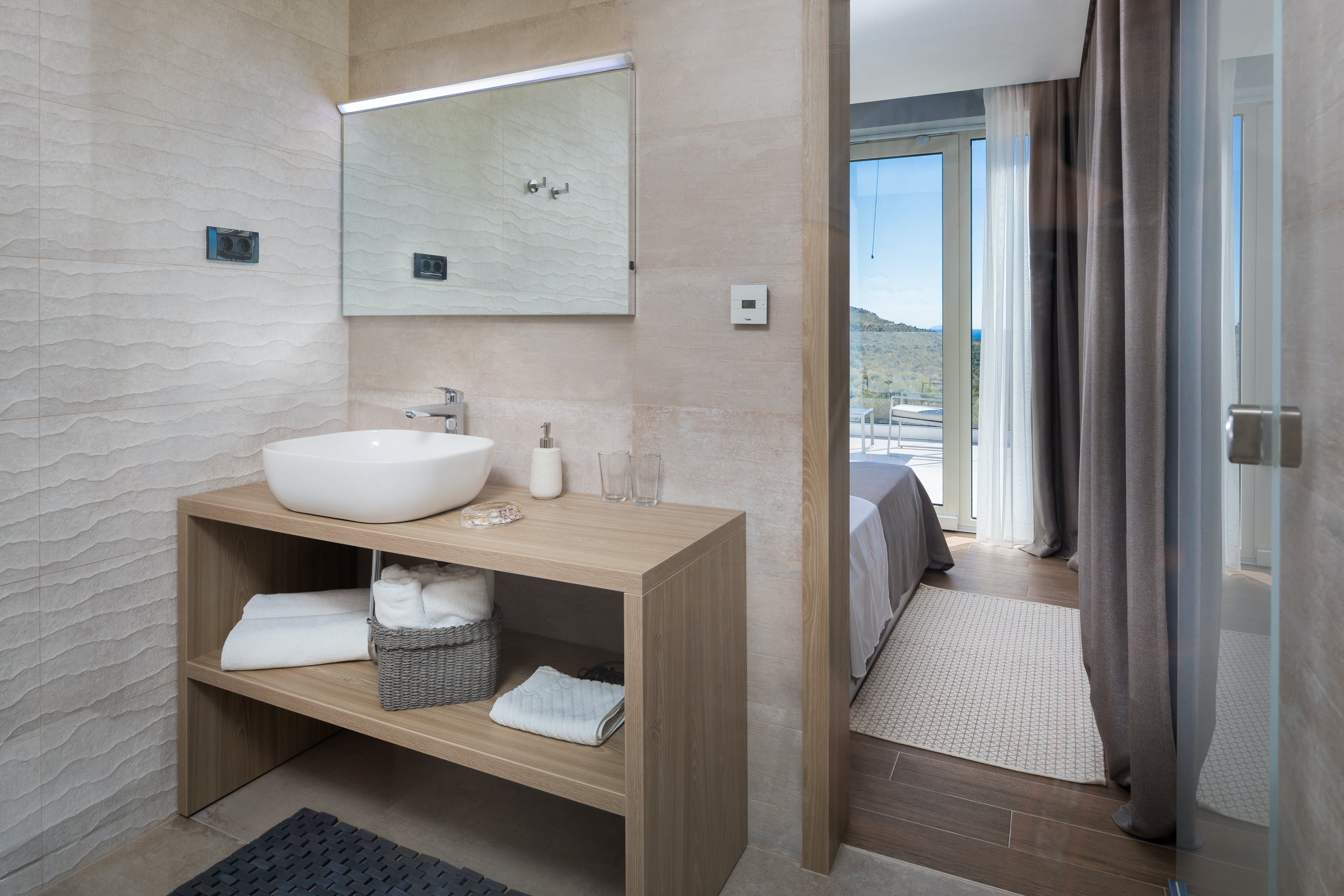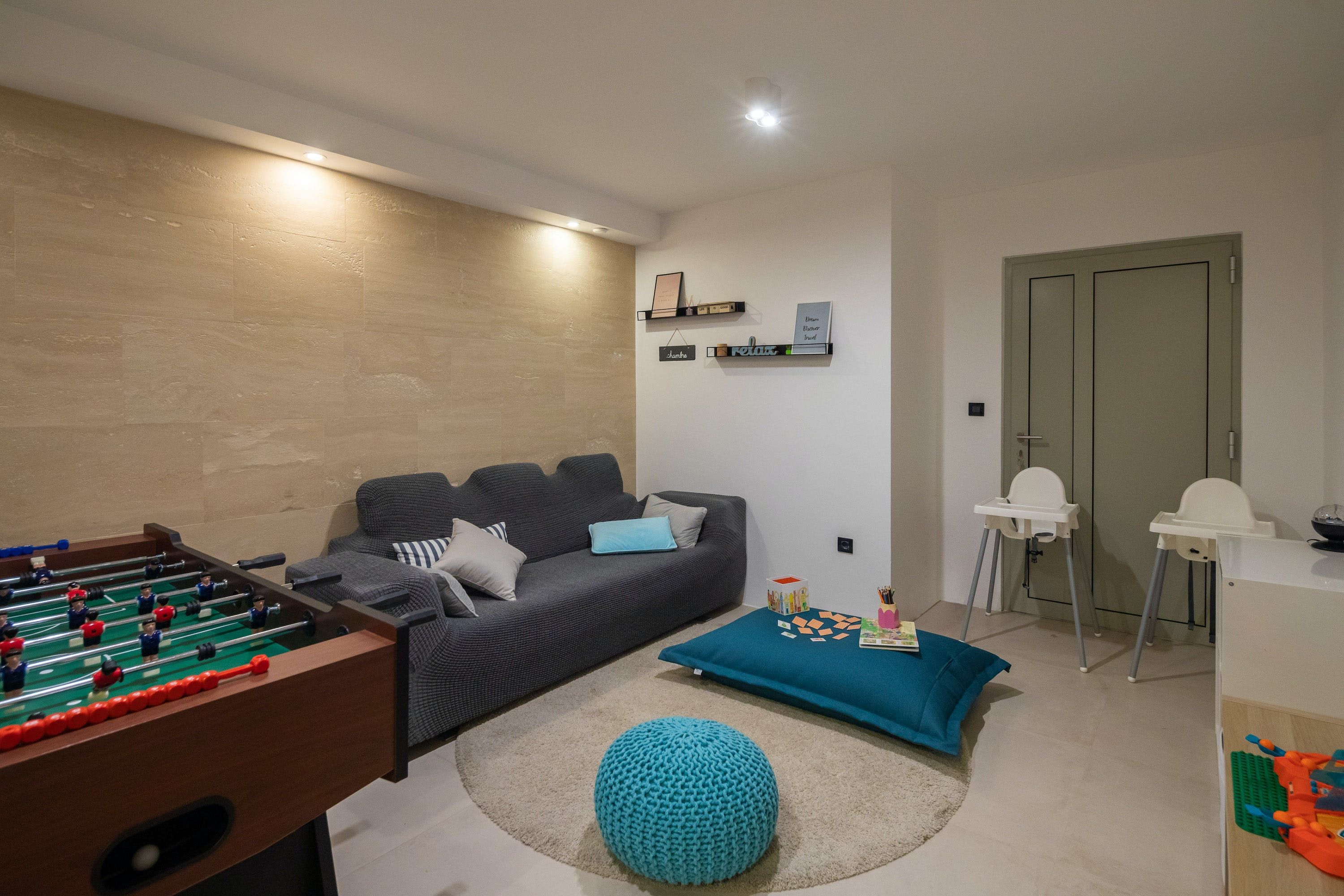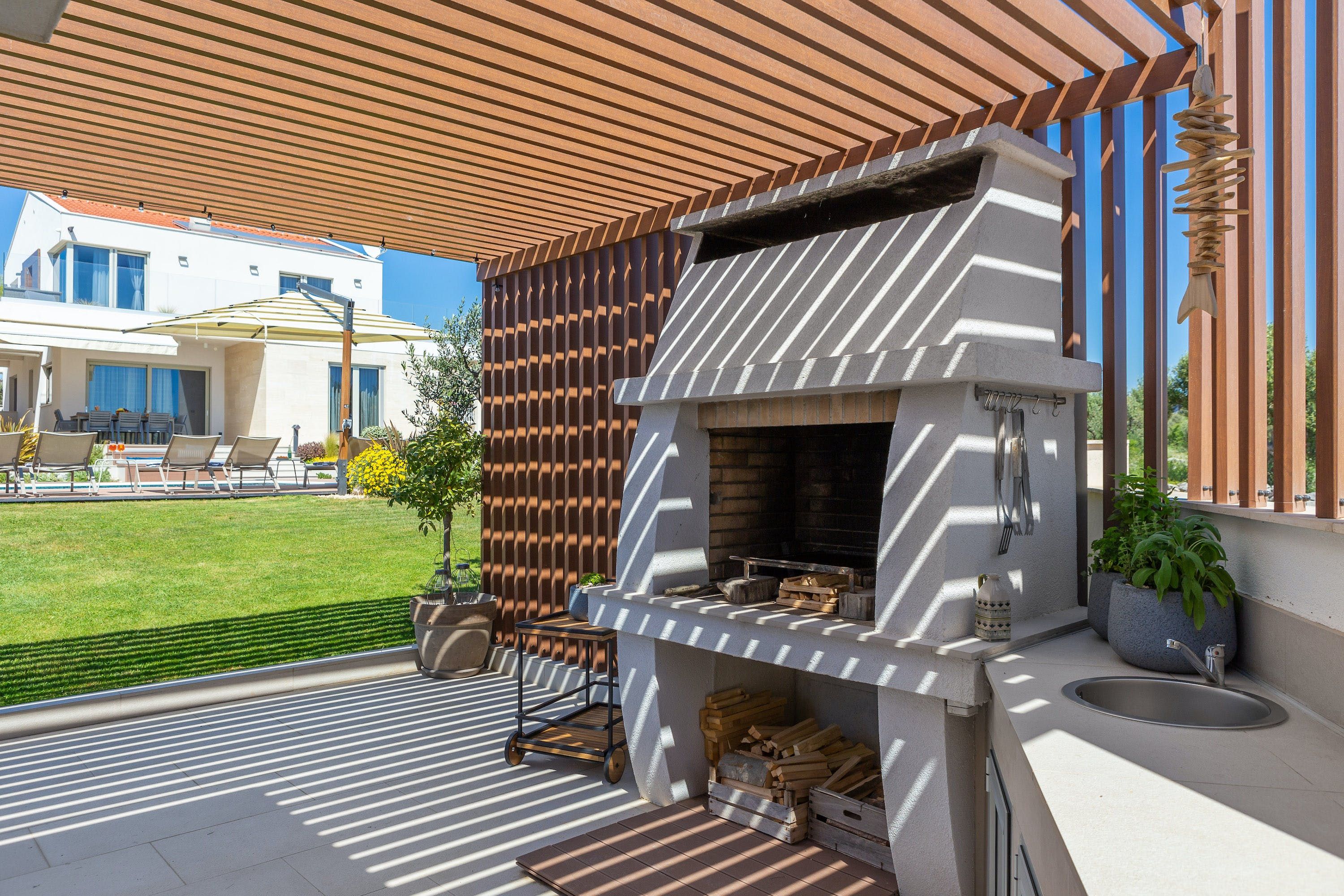 This home is a luxurious villa that offers maritime flair with its white and blue decor, airy fabrics, and distant sea view. The 10m heated pool with surrounding sun terrace and lawn is the heart of the garden, perfect for relaxation on a lounger. The separate lounge corner provides privacy for small groups, while the covered terrace offers a great view of the pool and distant sea. The villa's modern living area has an open-plan design with various niches for privacy. The living-dining room with adjoining kitchen is perfect for indoor relaxation, while the top-modern kitchen is equipped first class for self-catering. The villa has four elegant en-suite bedrooms located on the upper floor, each with high-quality amenities. With TV, sound system, internet, safe, air conditioning, heating, and other impressive amenities, the home is a perfect vacation home in Croatia for eight adults and two children.